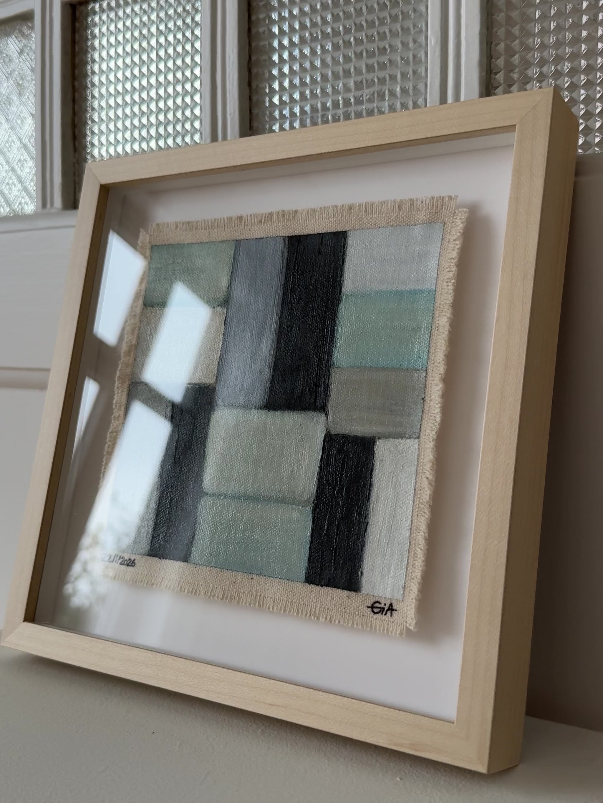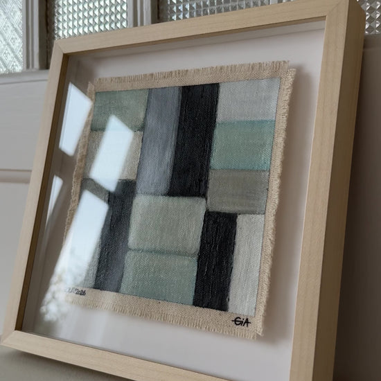 Painted with rich, vibrant oil pastels on raw heavy canvas, each artwork is signed and dated, then professionally framed in a natural maple wood object frame with a floating mount behind white glass. The compact frame includes professional hanging and wall stoppers on the back, and is designed for versatile display on the wall, standing upright on a shelf, or laid flat on a table.