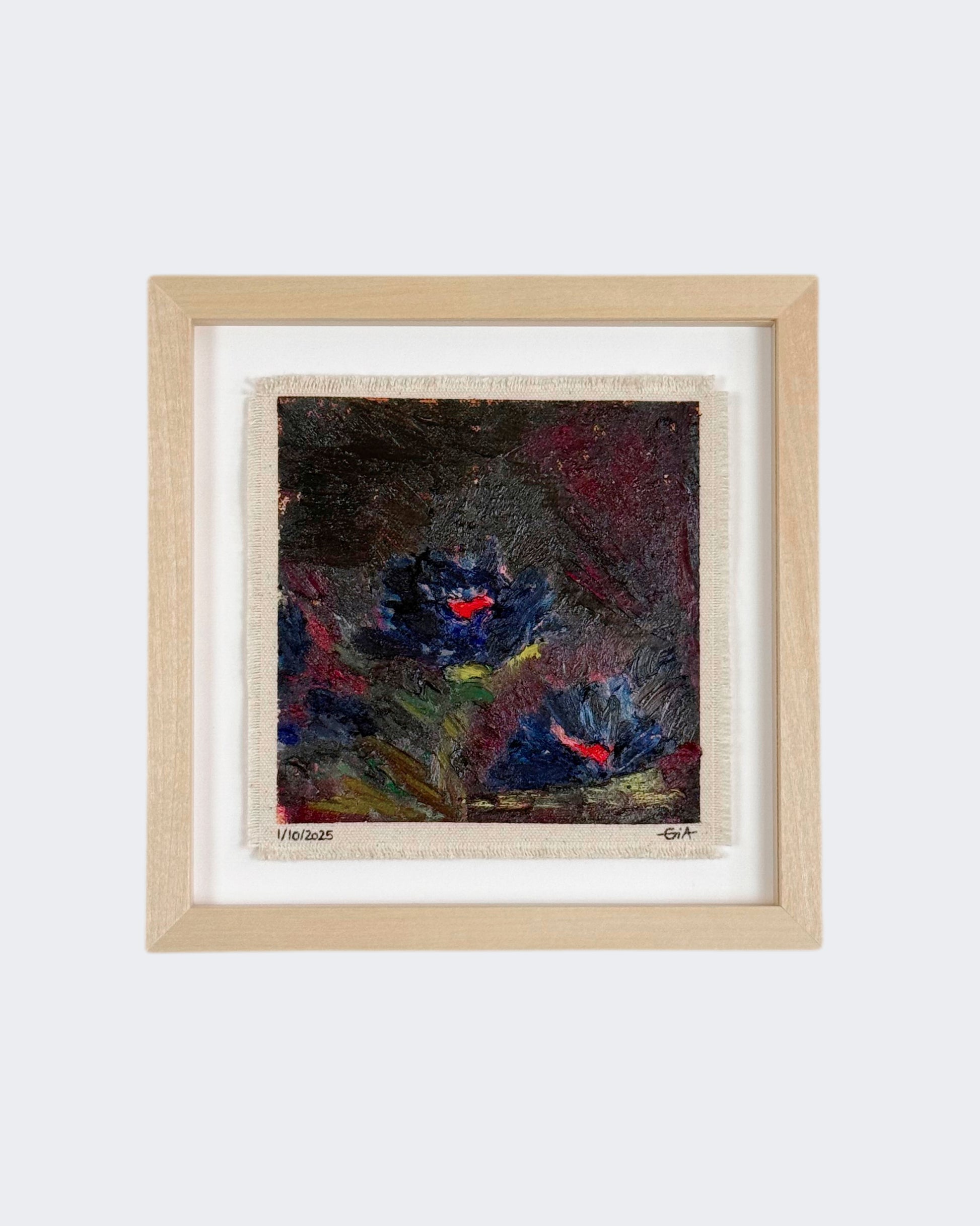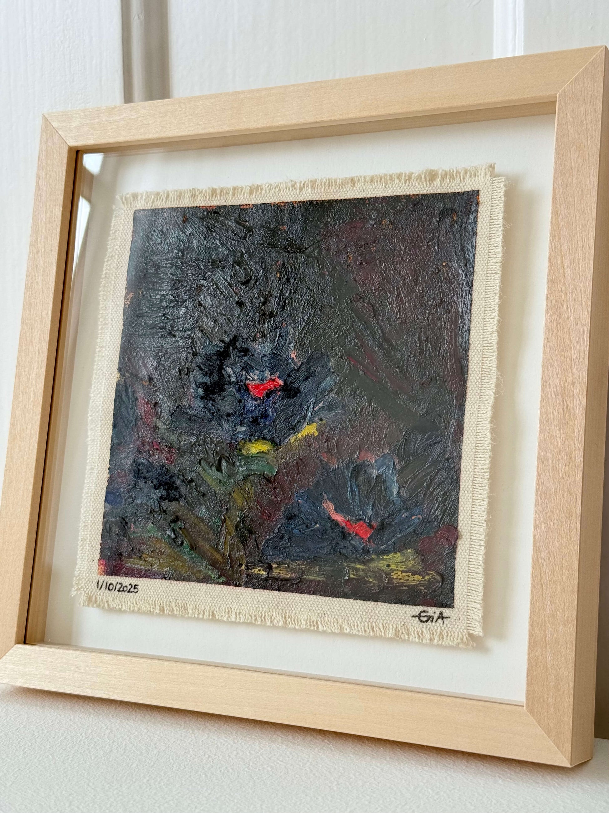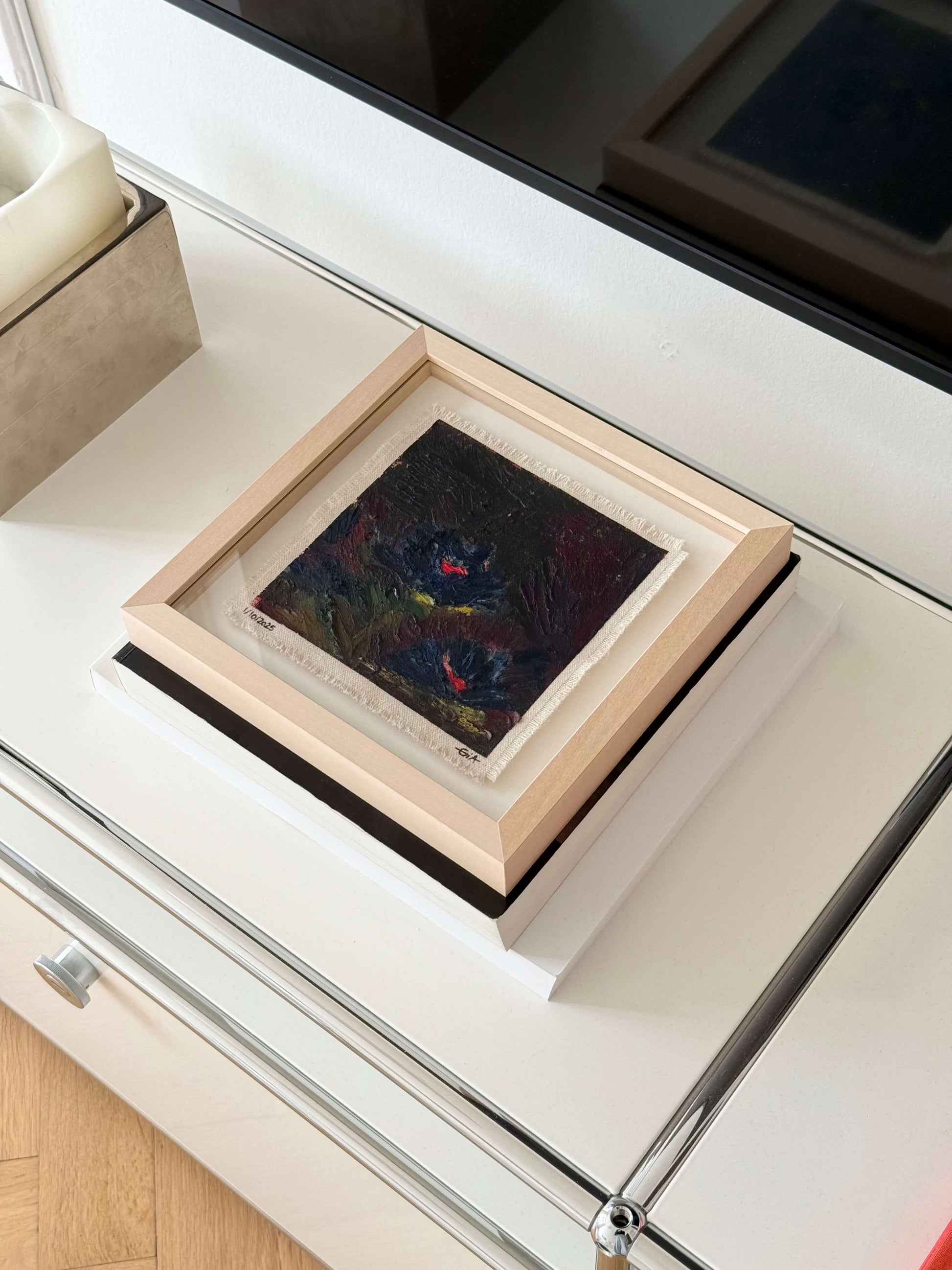 Painted with rich, vibrant oil pastels on raw heavy canvas, each artwork is signed, dated, and professionally framed in a wooden object frame behind glass. The compact frame is designed for versatility, it can be hung on the wall, stood upright on a shelf, or laid flat on a table.