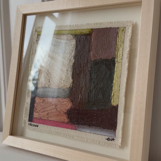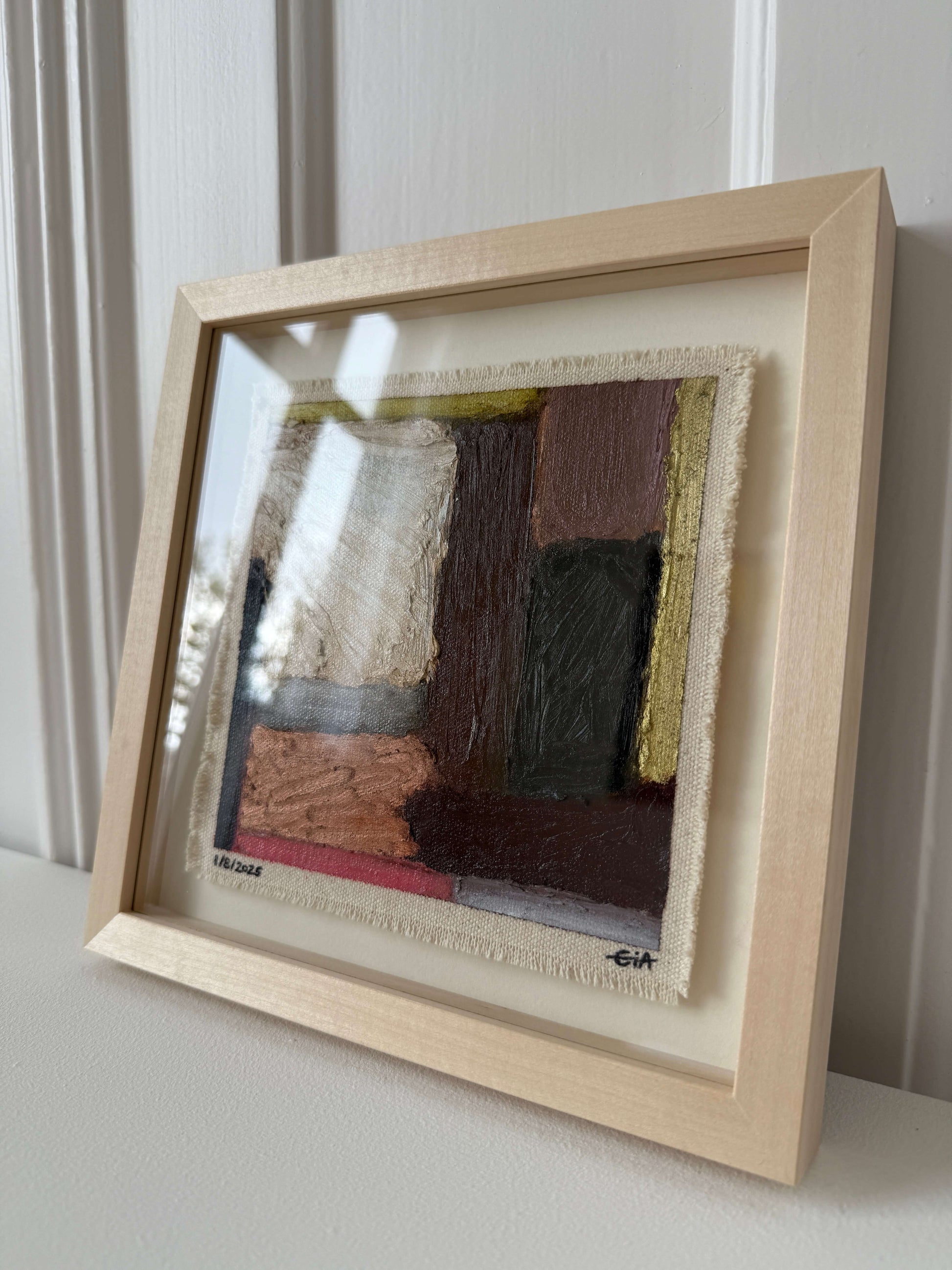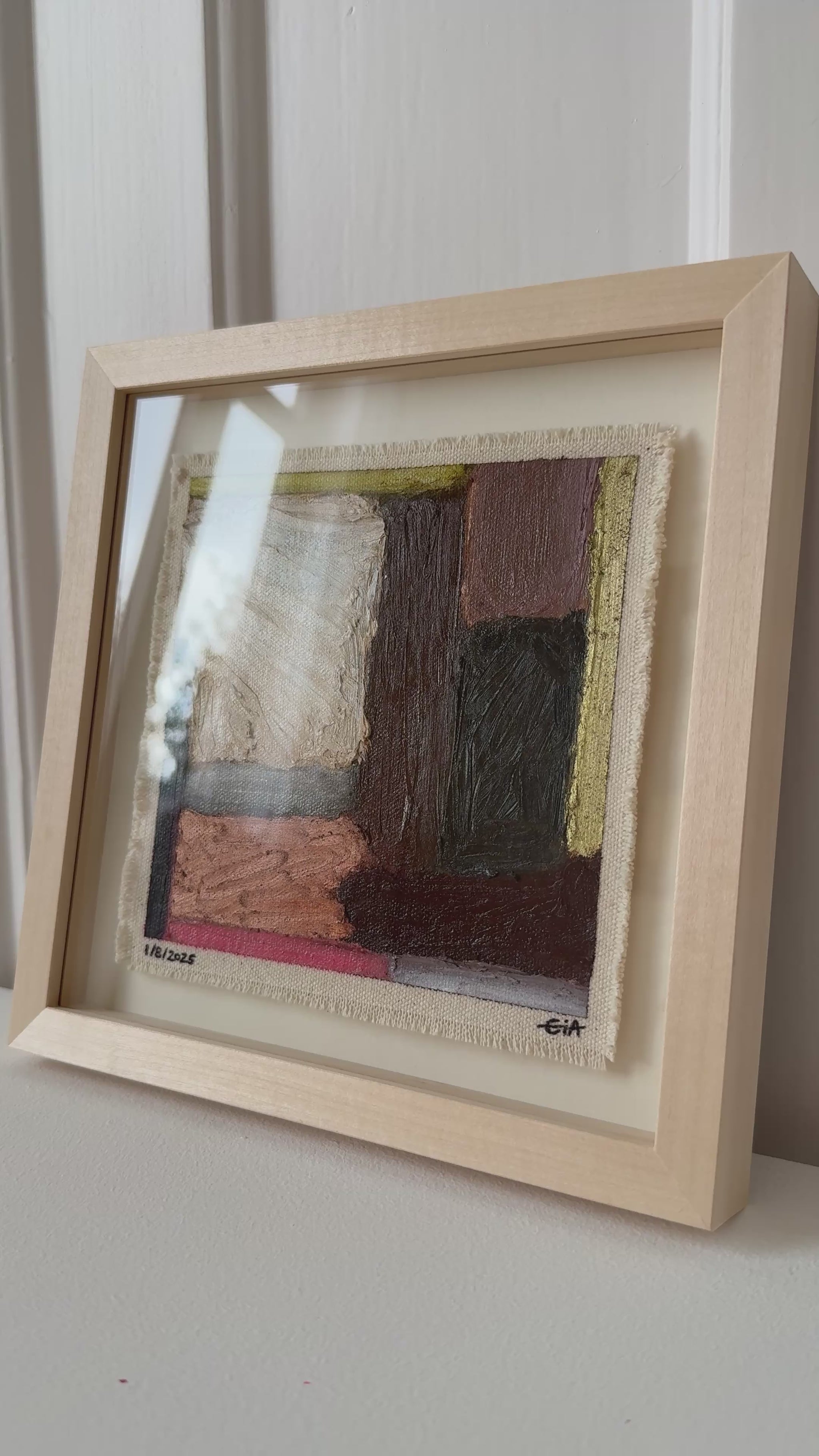 Painted with rich, vibrant oil pastels on raw heavy canvas, each artwork is signed, dated, and professionally framed in a wooden object frame behind glass. The compact frame is designed for versatility, it can be hung on the wall, stood upright on a shelf, or laid flat on a table.