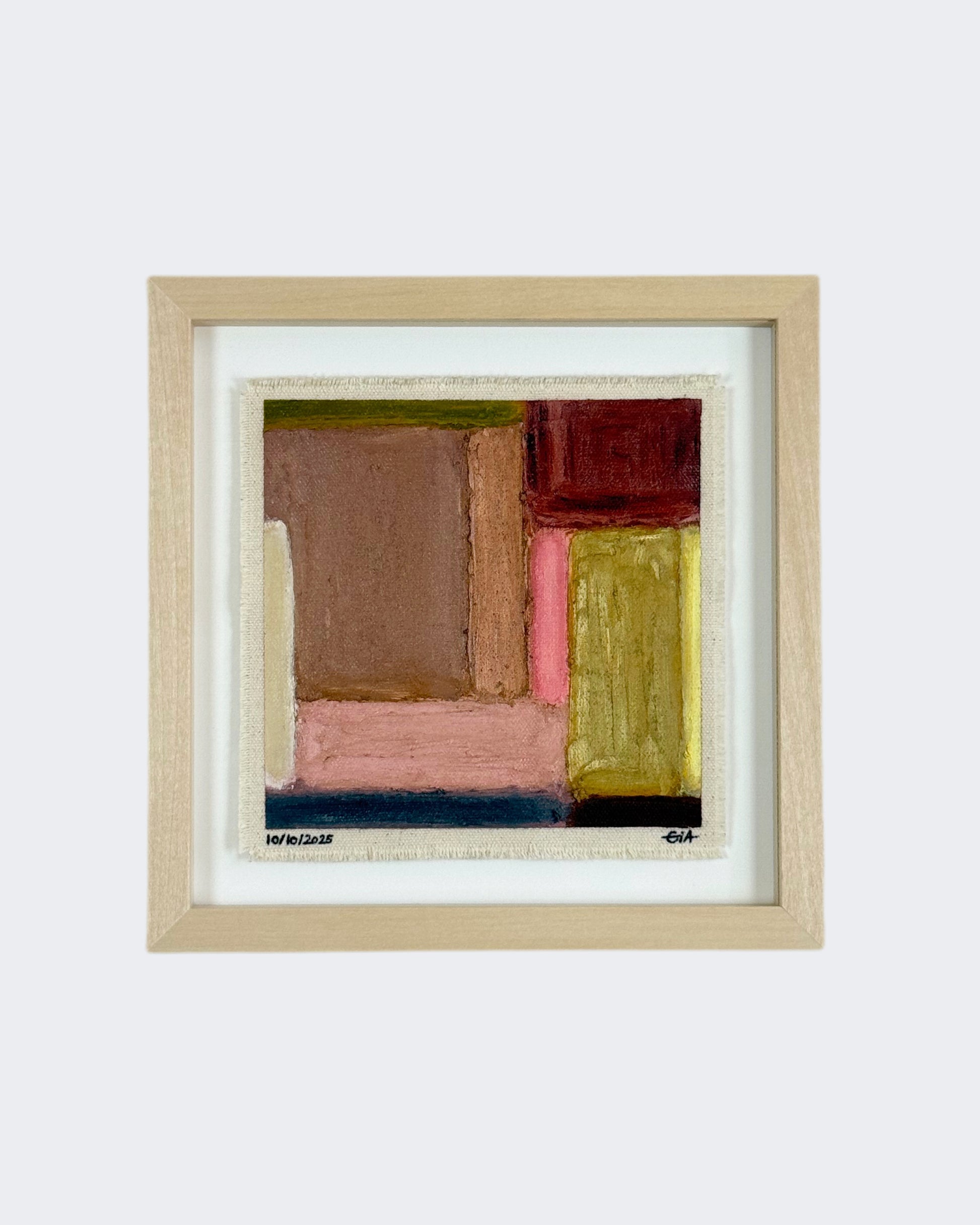 Painted with rich, vibrant oil pastels on raw heavy canvas, each artwork is signed, dated, and professionally framed in a wooden object frame behind glass. The compact frame is designed for versatility, it can be hung on the wall, stood upright on a shelf, or laid flat on a table.