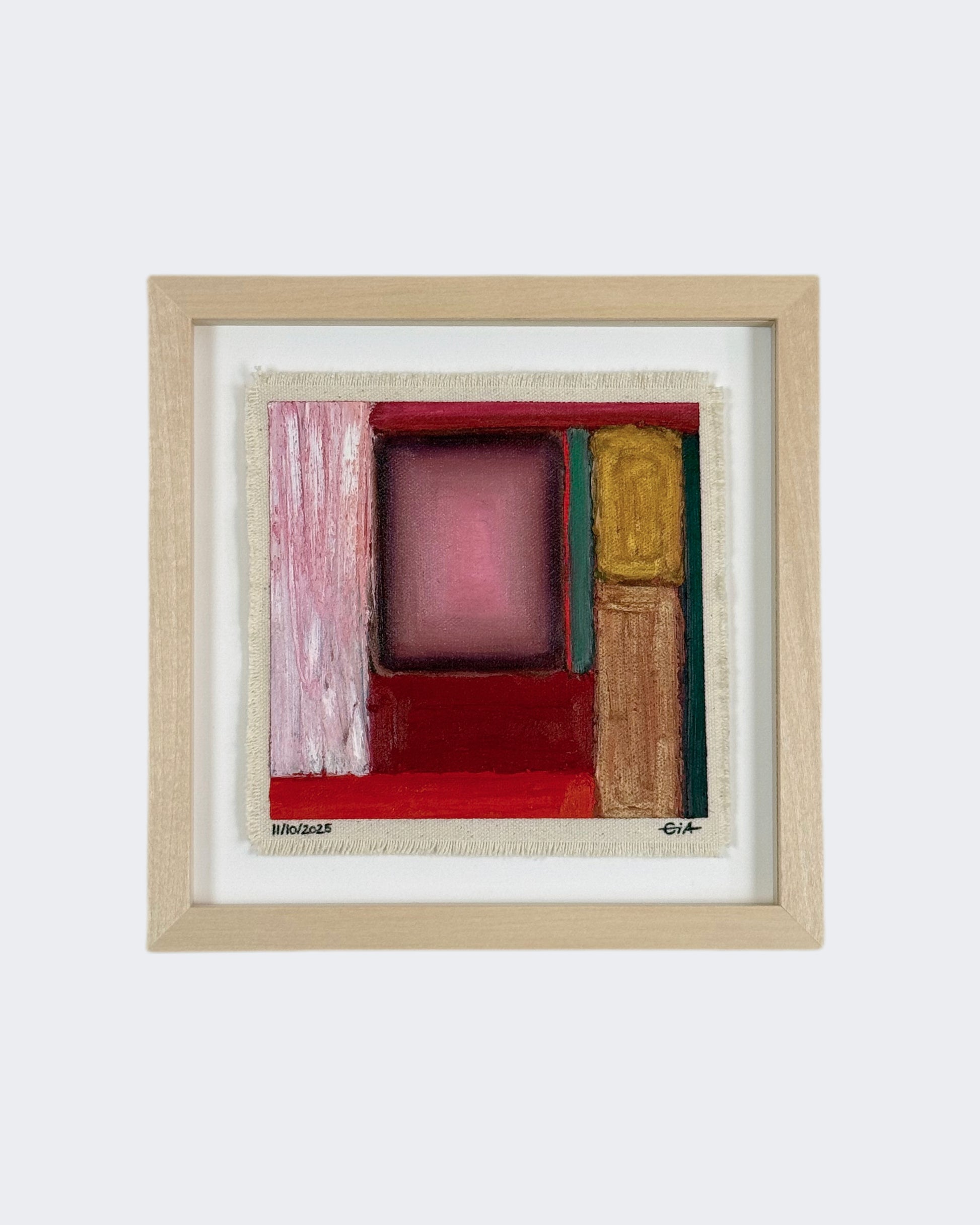 Painted with rich, vibrant oil pastels on raw heavy canvas, each artwork is signed, dated, and professionally framed in a wooden object frame behind glass. The compact frame is designed for versatility, it can be hung on the wall, stood upright on a shelf, or laid flat on a table.