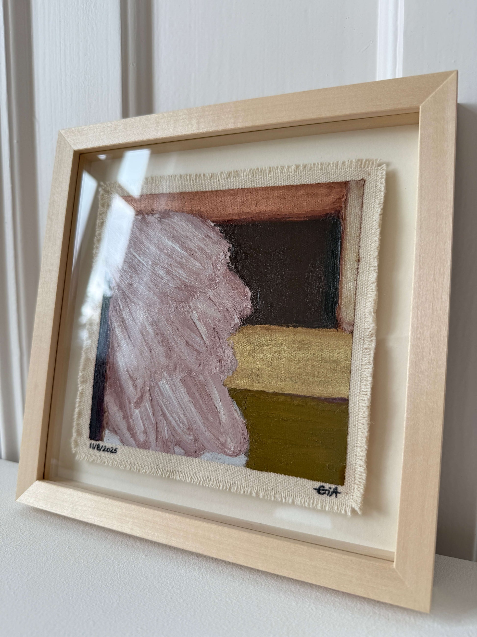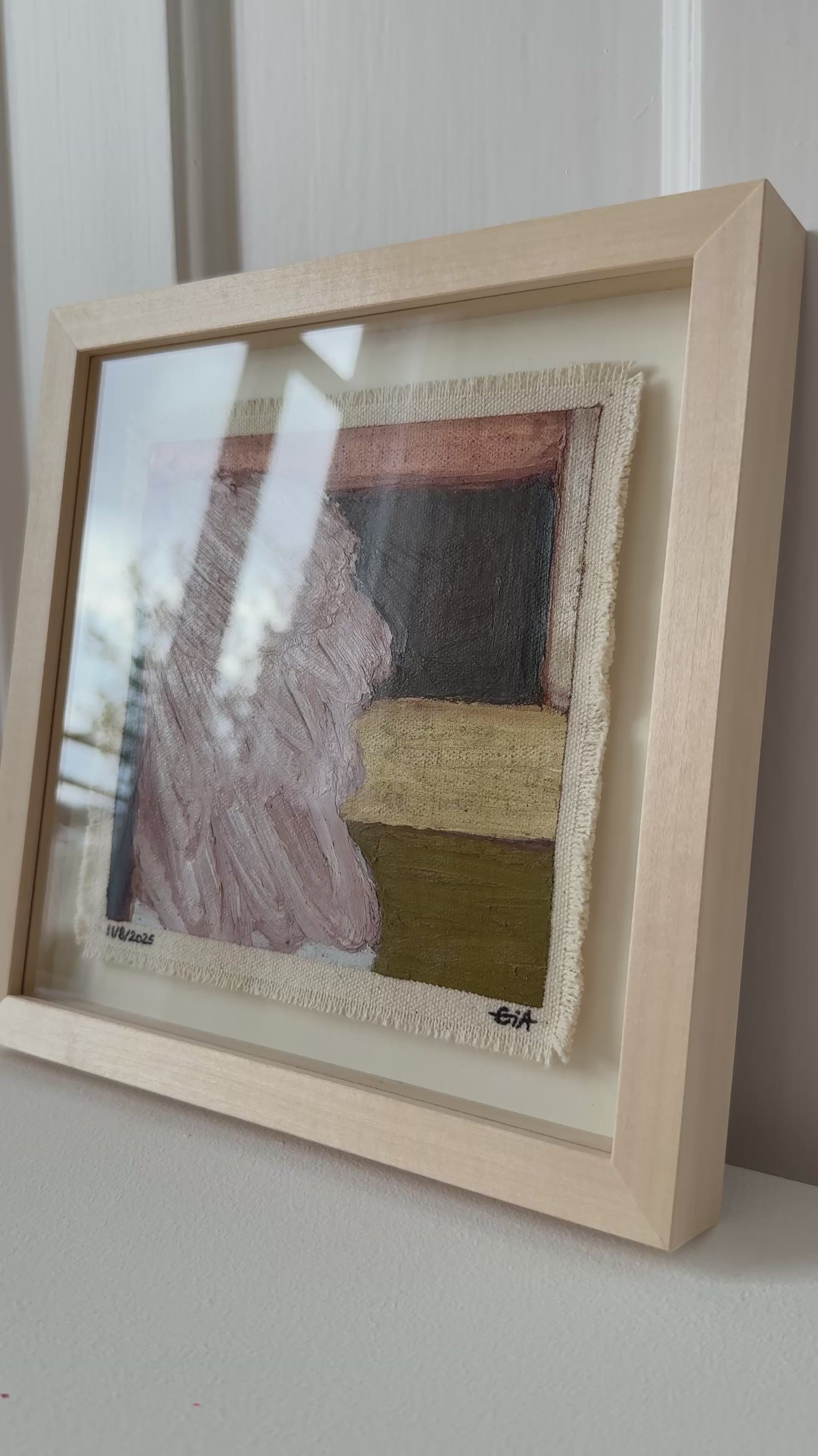 Painted with rich, vibrant oil pastels on raw heavy canvas, each artwork is signed, dated, and professionally framed in a wooden object frame behind glass. The compact frame is designed for versatility, it can be hung on the wall, stood upright on a shelf, or laid flat on a table.