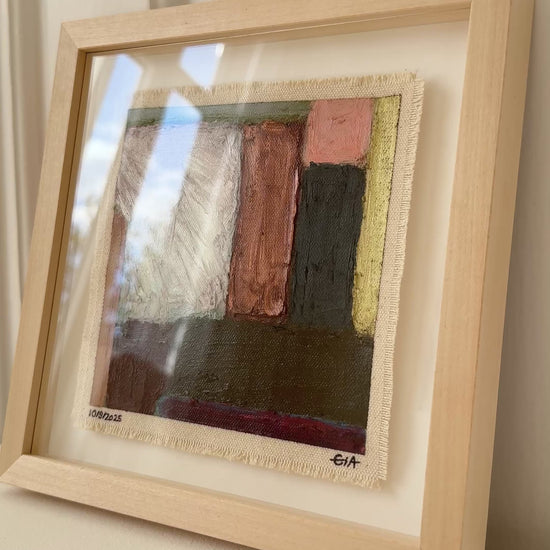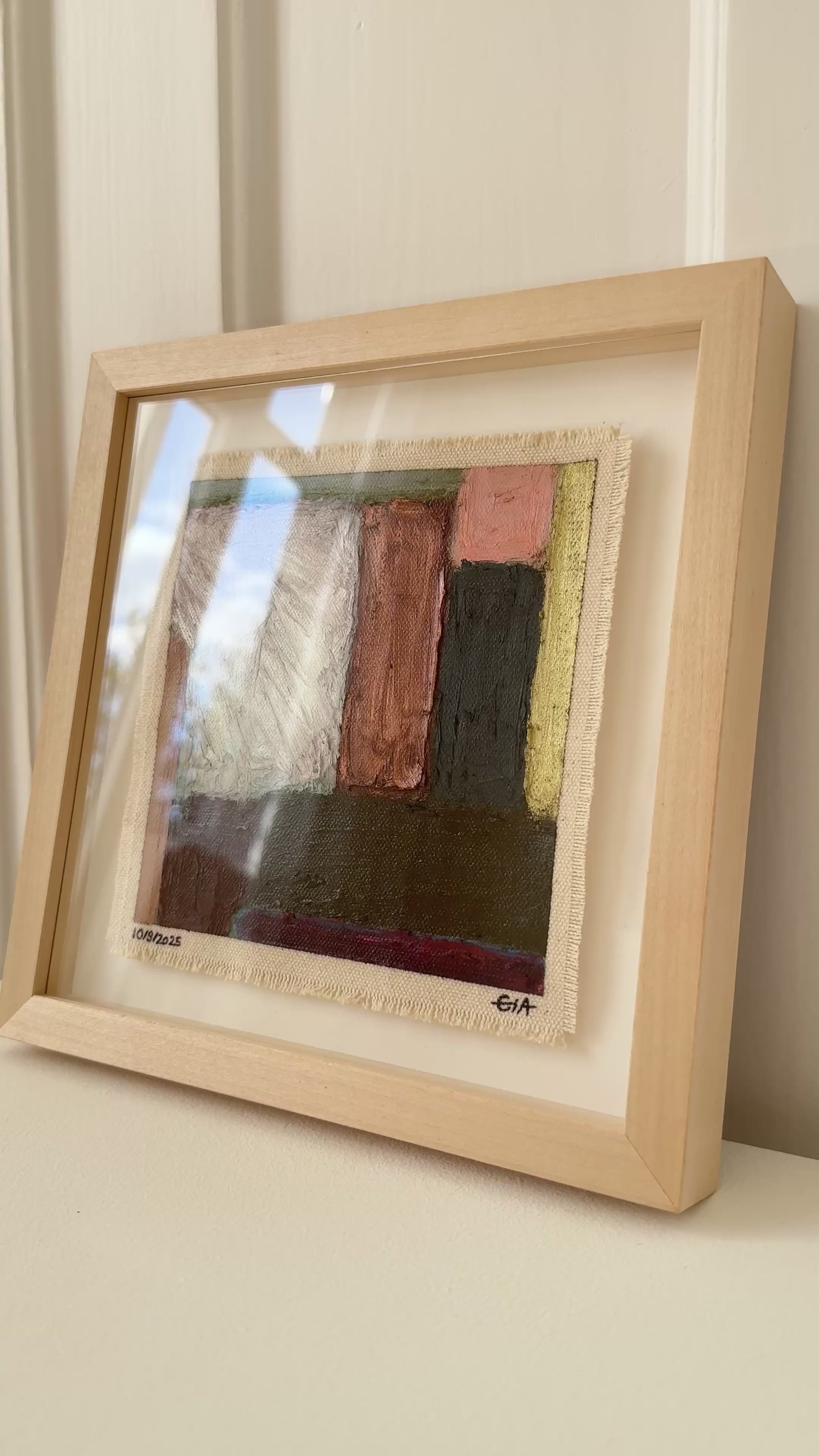 Painted with rich, vibrant oil pastels on raw heavy canvas, each artwork is signed, dated, and professionally framed in a wooden object frame behind glass. The compact frame is designed for versatility, it can be hung on the wall, stood upright on a shelf, or laid flat on a table.