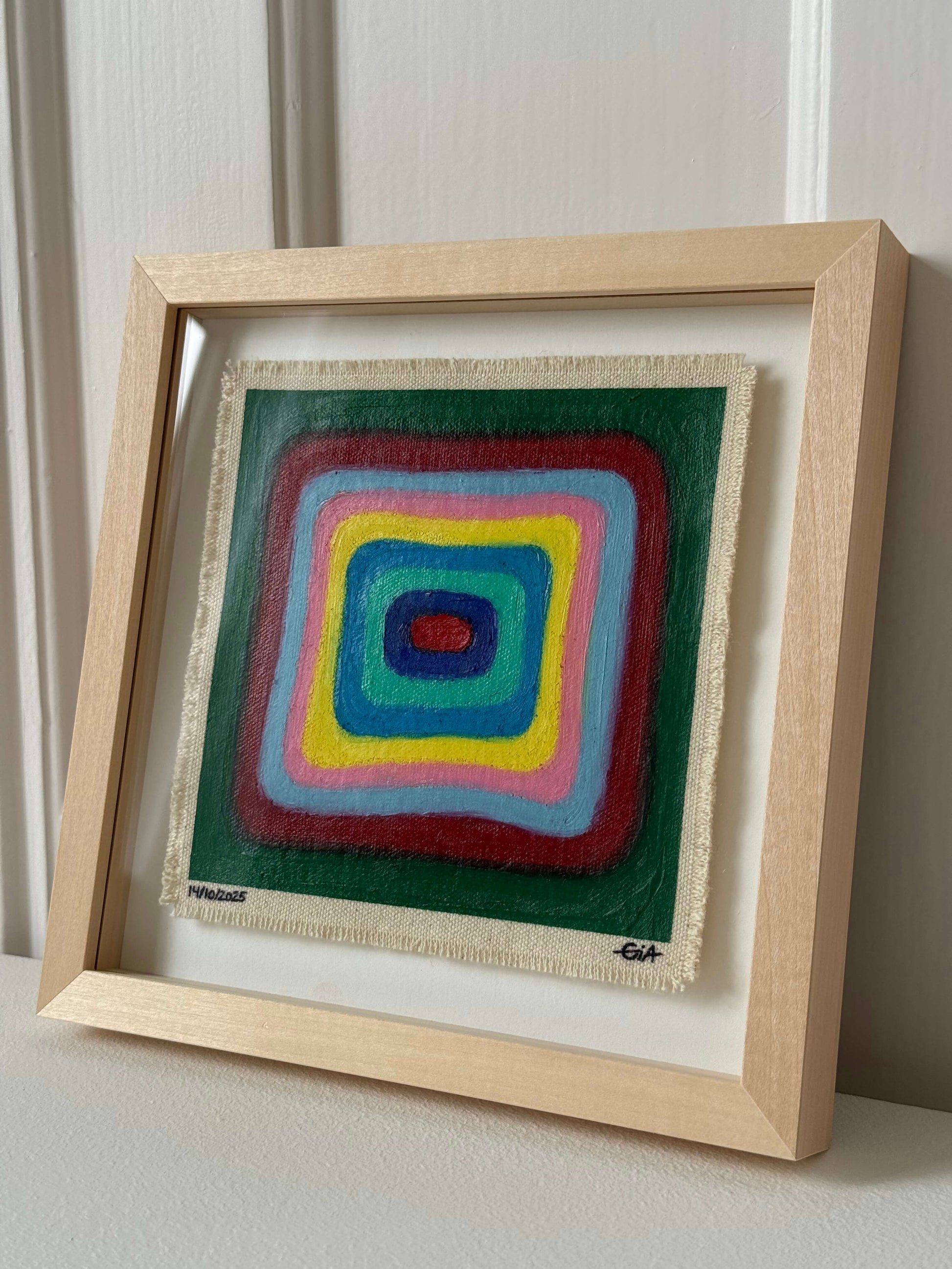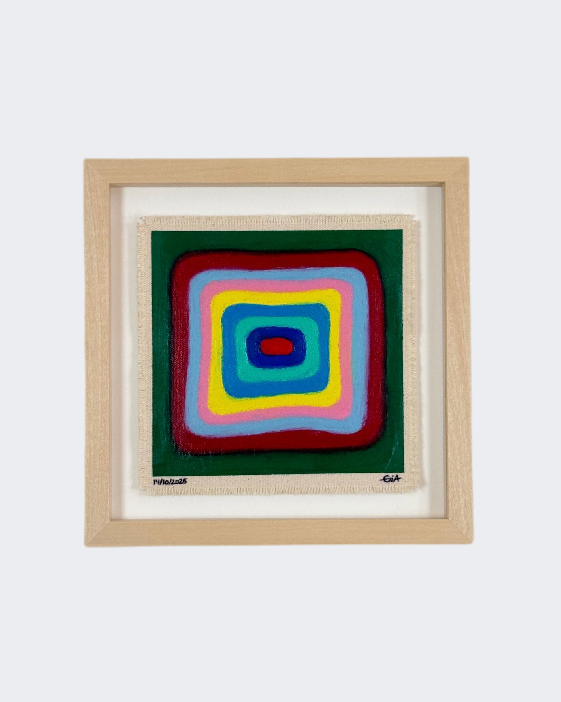Painted with rich, vibrant oil pastels on raw heavy canvas, each artwork is signed, dated, and professionally framed in a wooden object frame behind glass. The compact frame is designed for versatility, it can be hung on the wall, stood upright on a shelf, or laid flat on a table.