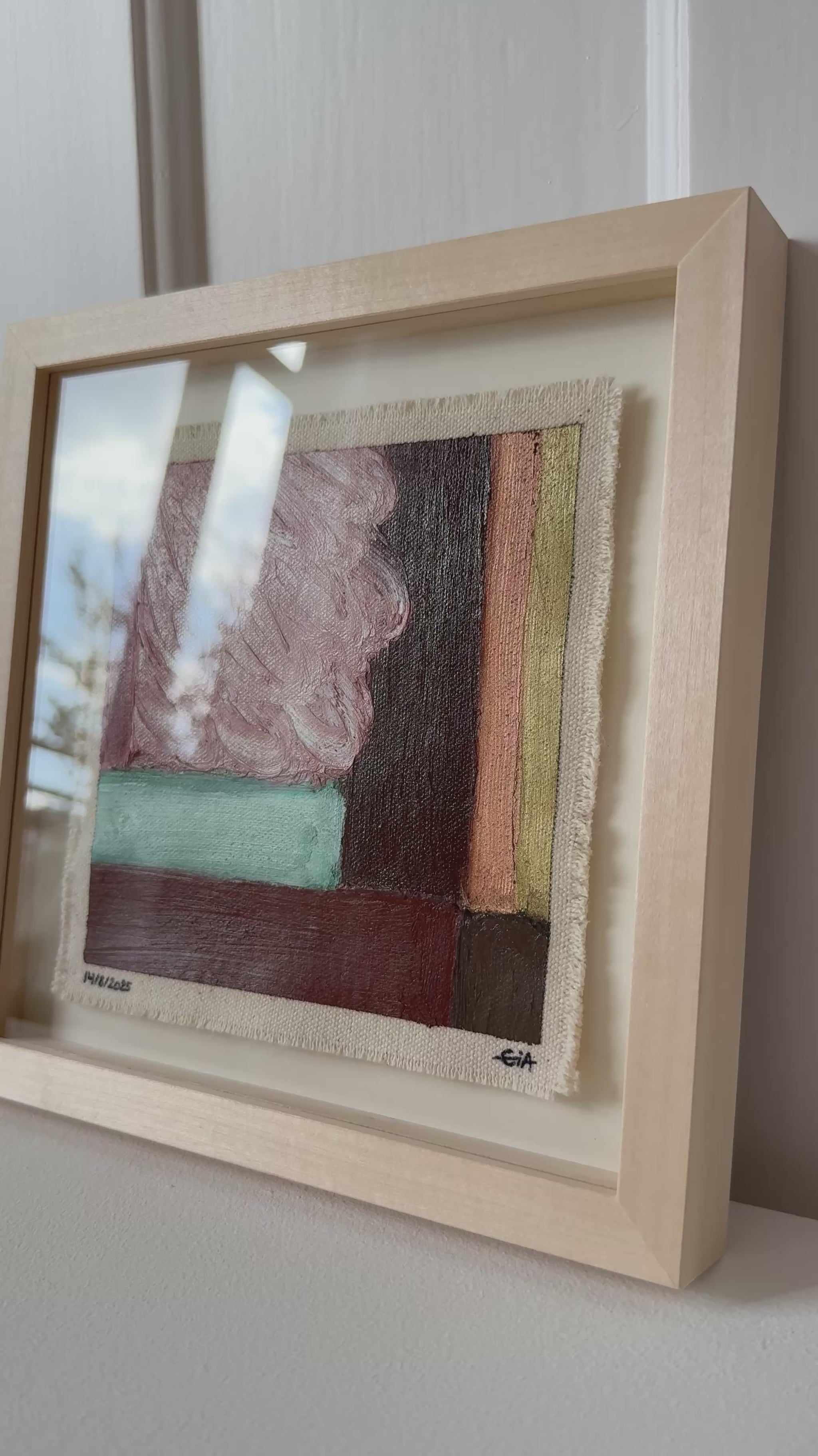 Painted with rich, vibrant oil pastels on raw heavy canvas, each artwork is signed, dated, and professionally framed in a wooden object frame behind glass. The compact frame is designed for versatility, it can be hung on the wall, stood upright on a shelf, or laid flat on a table.