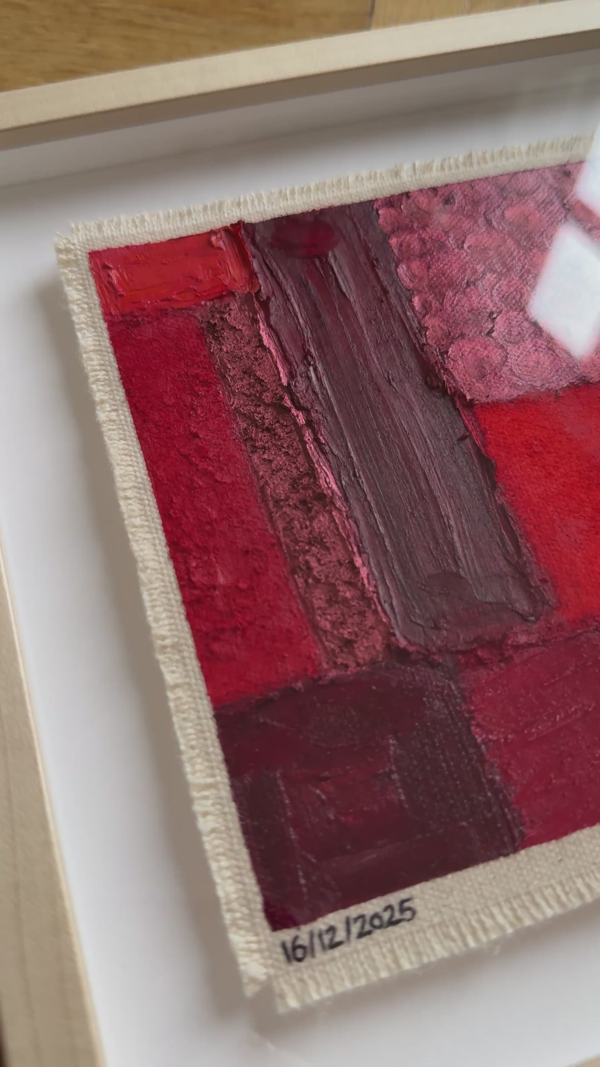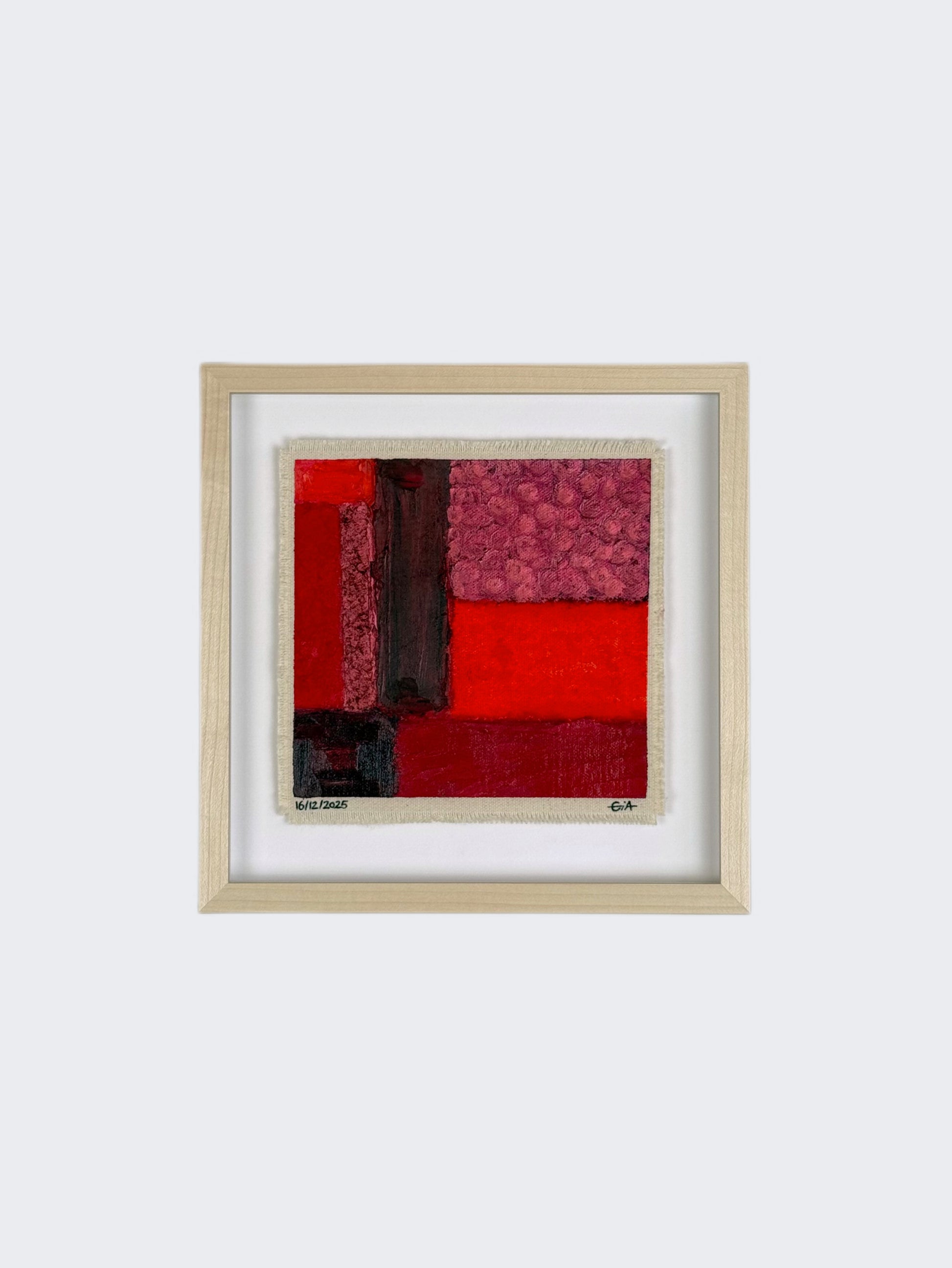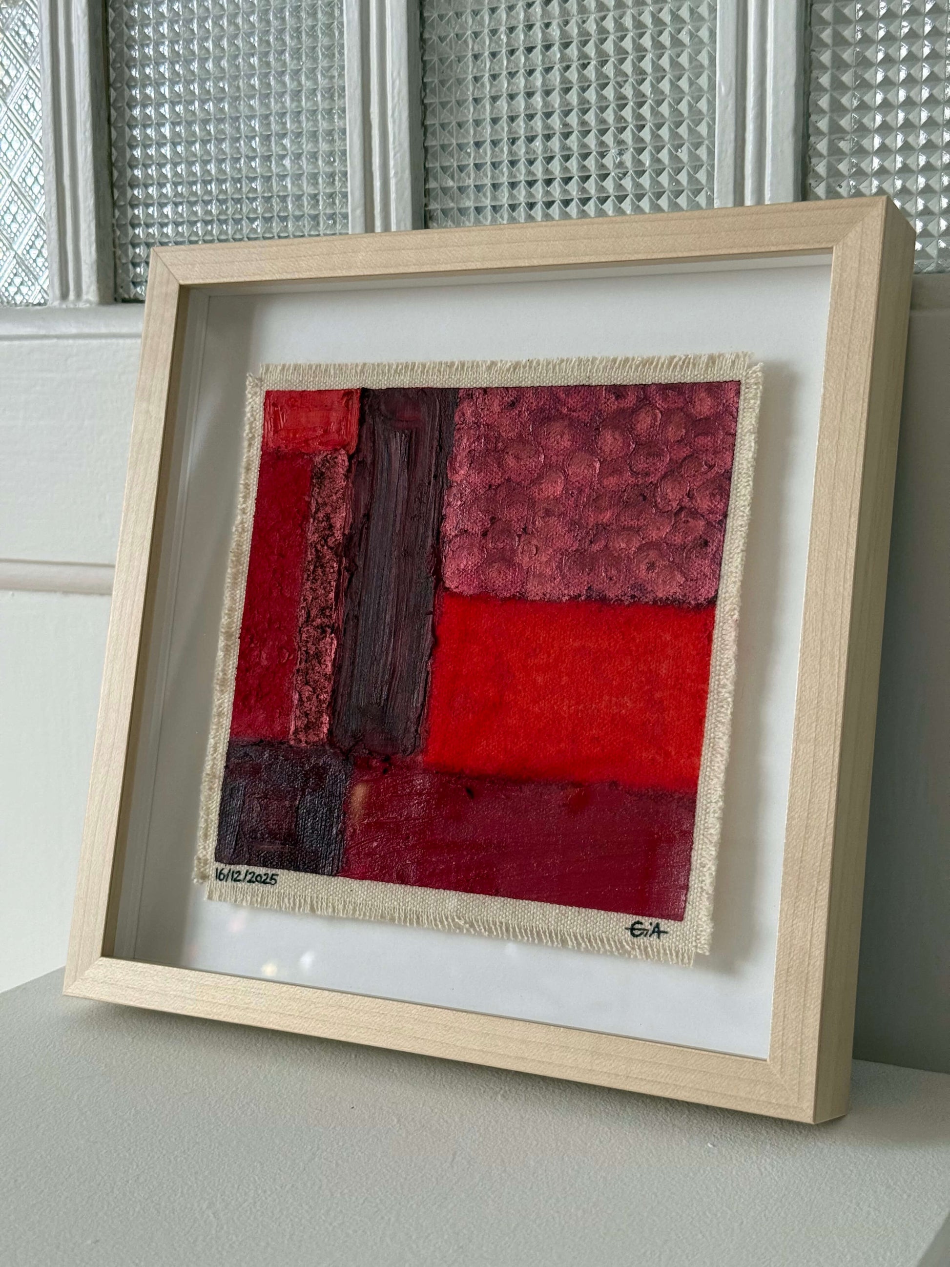 Painted with rich, vibrant oil pastels on raw heavy canvas, each artwork is signed and dated, then professionally framed in a natural maple wood object frame with a floating mount behind white glass. The compact frame includes professional hanging and wall stoppers on the back, and is designed for versatile display on the wall, standing upright on a shelf, or laid flat on a table.