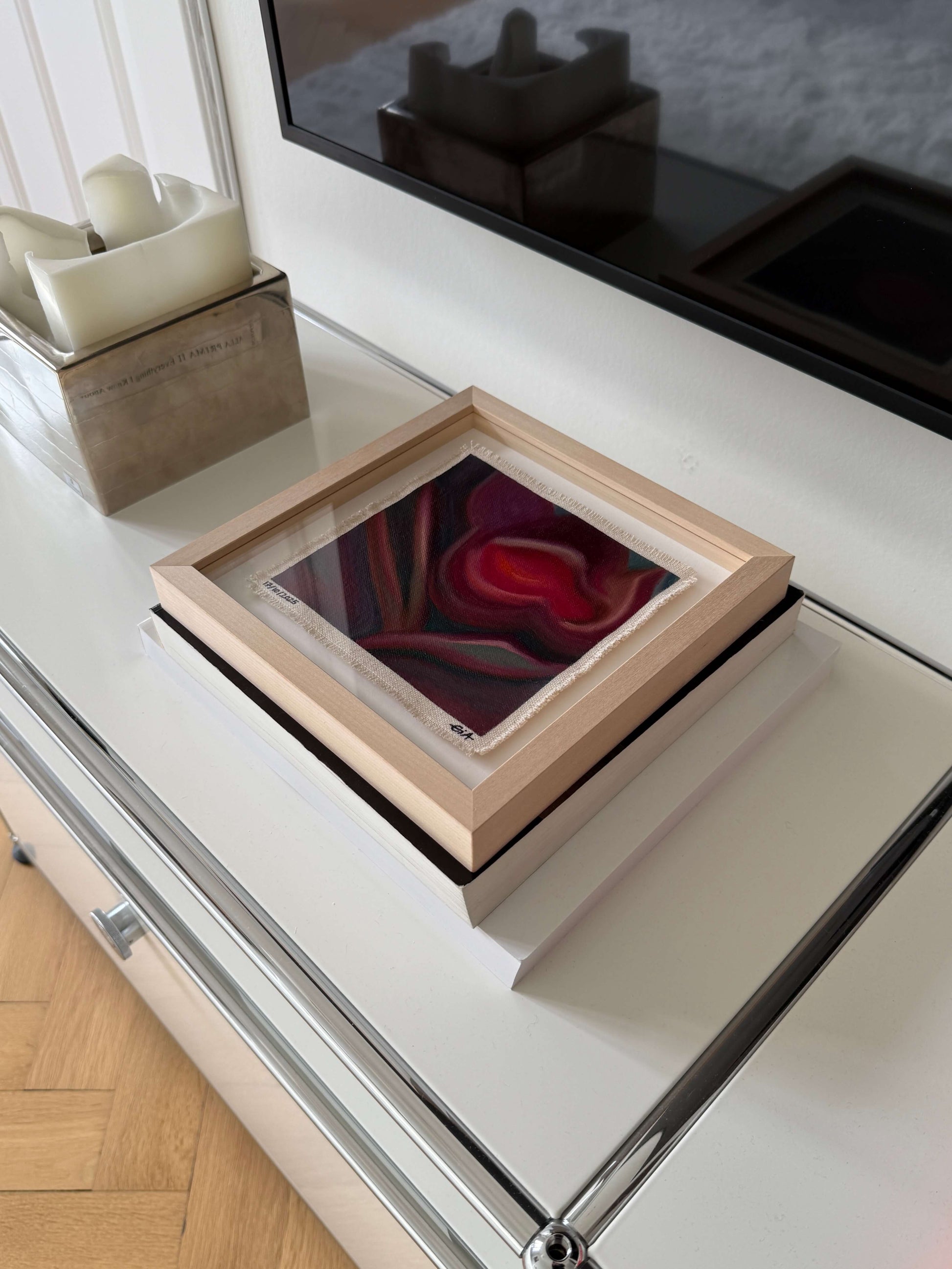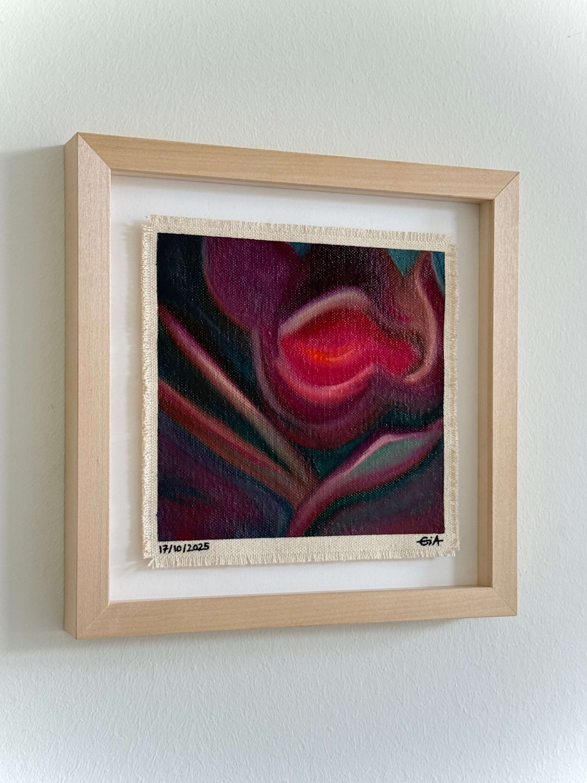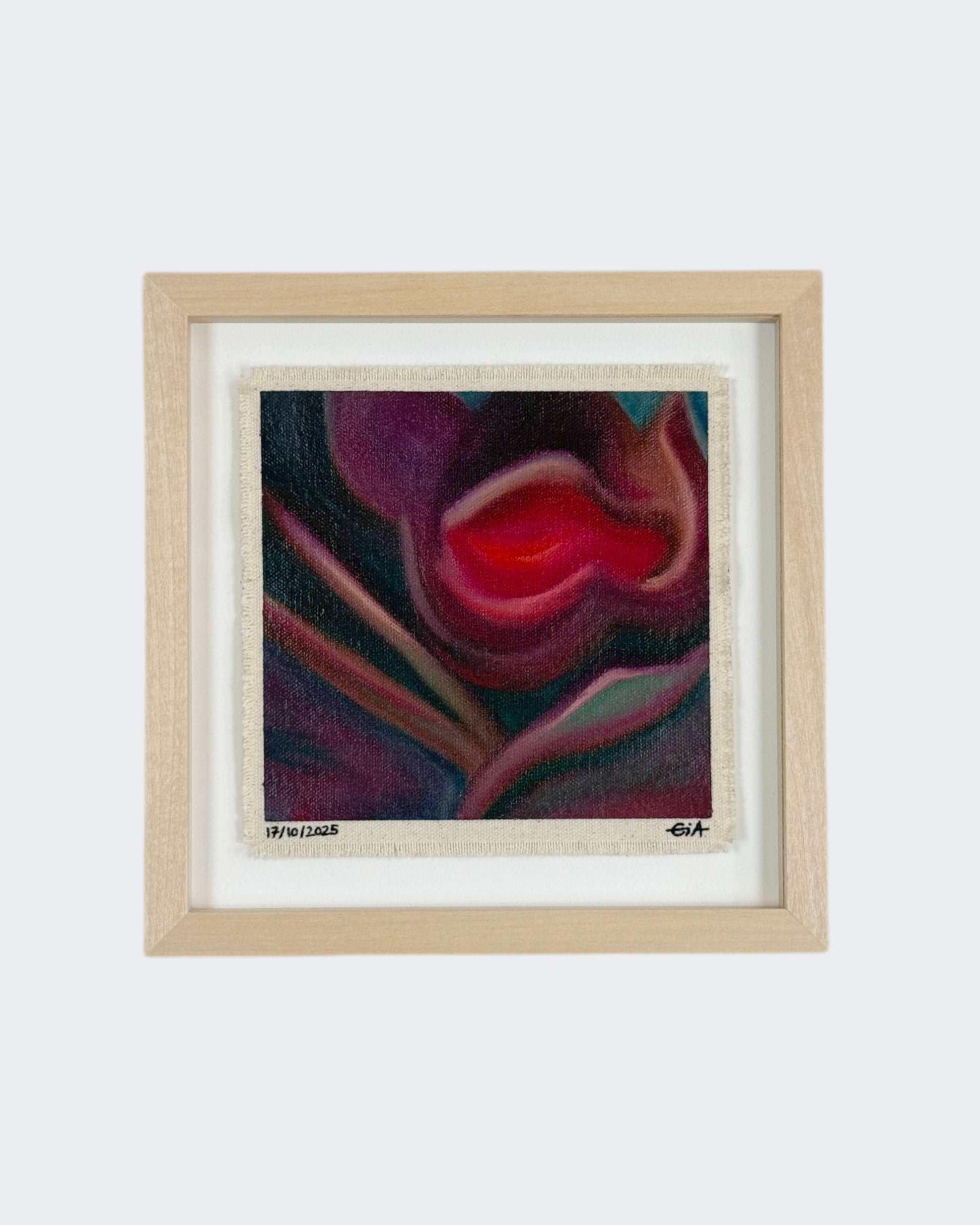 Painted with rich, vibrant oil pastels on raw heavy canvas, each artwork is signed, dated, and professionally framed in a wooden object frame behind glass. The compact frame is designed for versatility, it can be hung on the wall, stood upright on a shelf, or laid flat on a table.