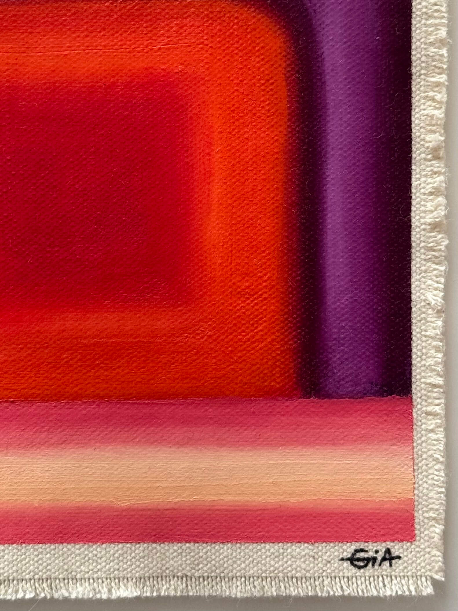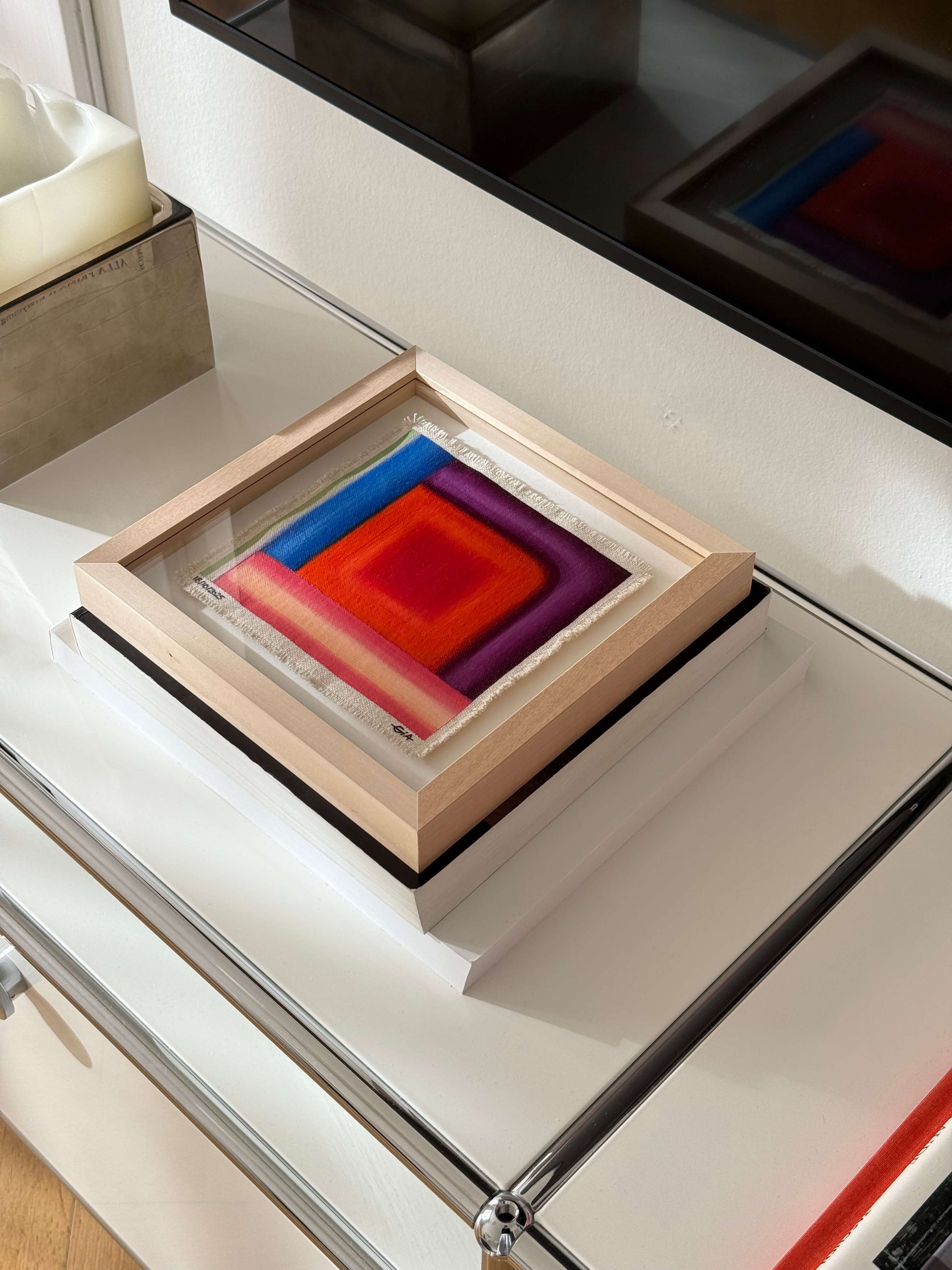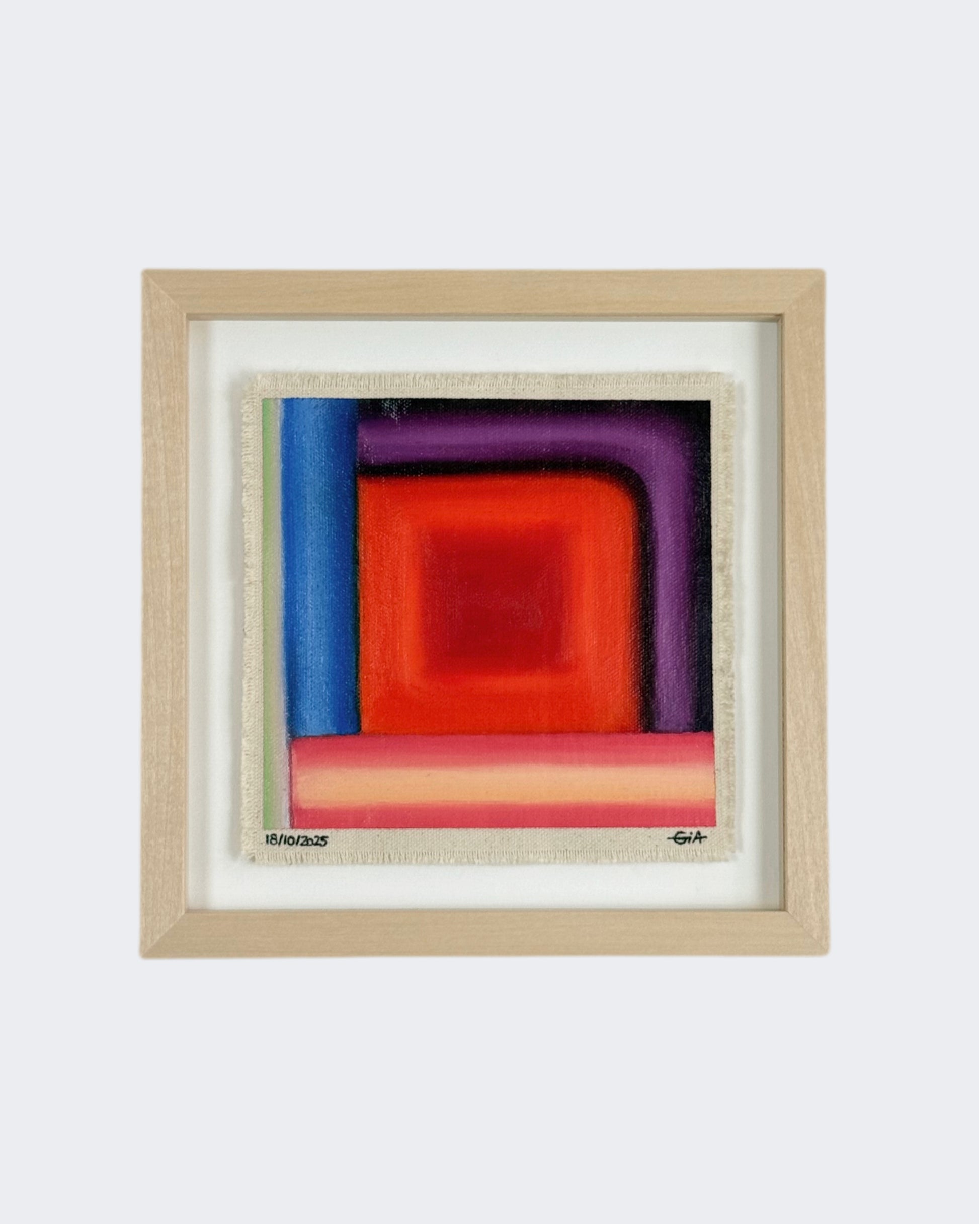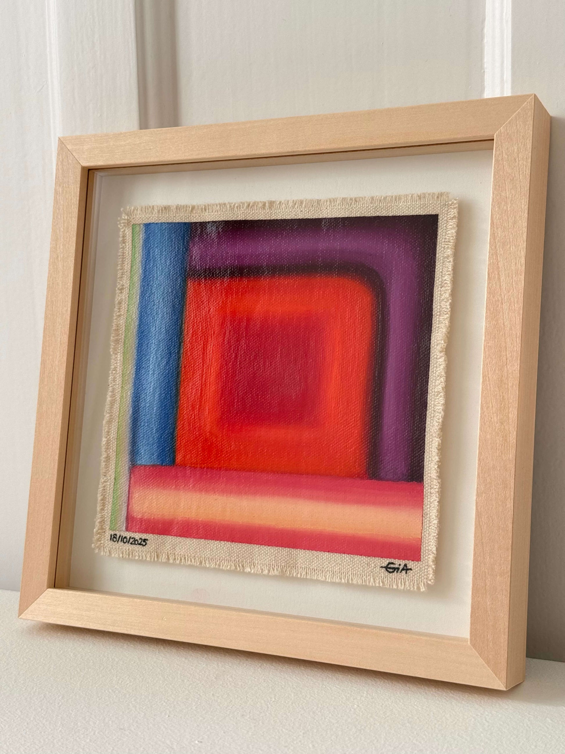 Painted with rich, vibrant oil pastels on raw heavy canvas, each artwork is signed, dated, and professionally framed in a wooden object frame behind glass. The compact frame is designed for versatility, it can be hung on the wall, stood upright on a shelf, or laid flat on a table.