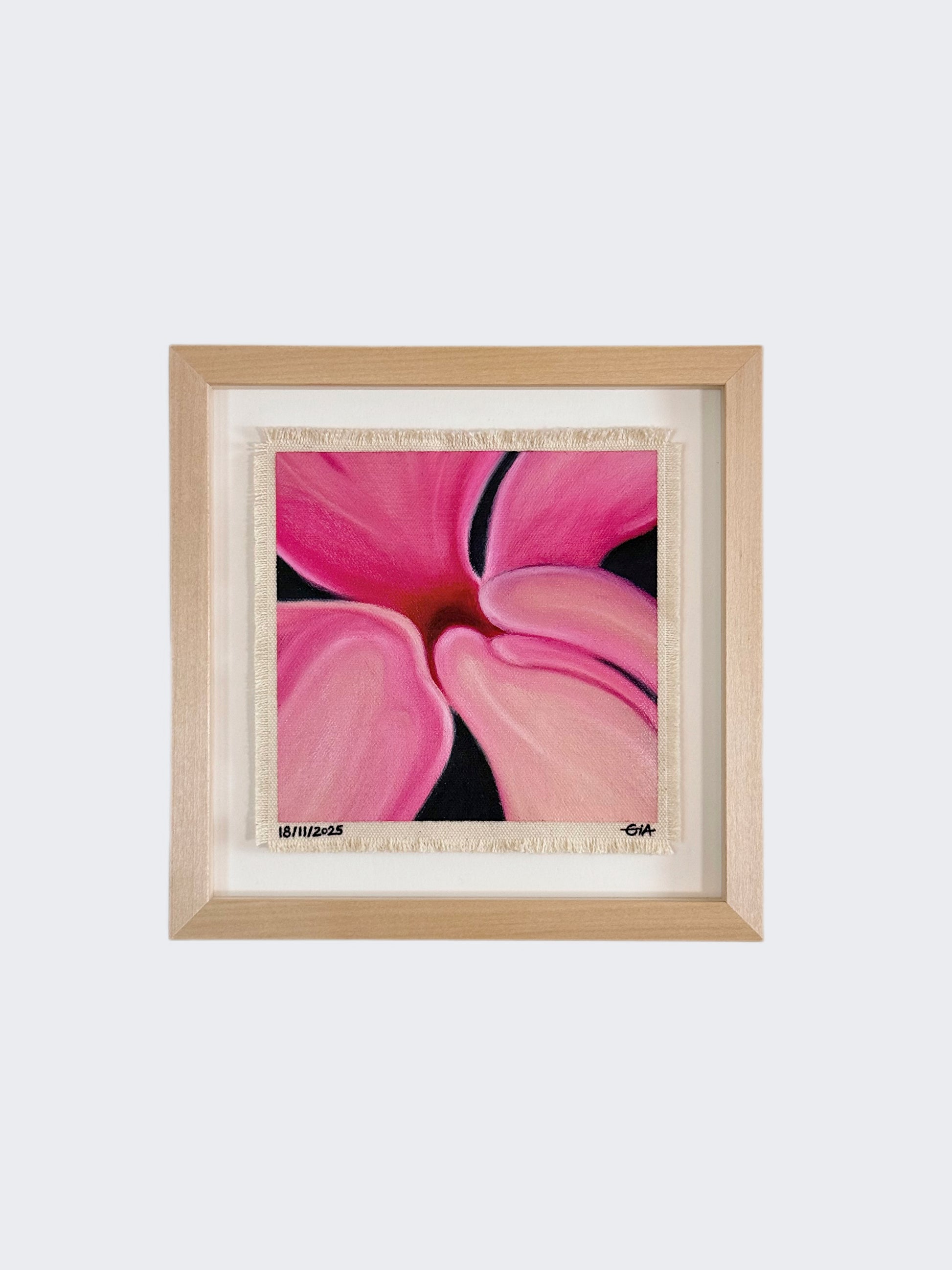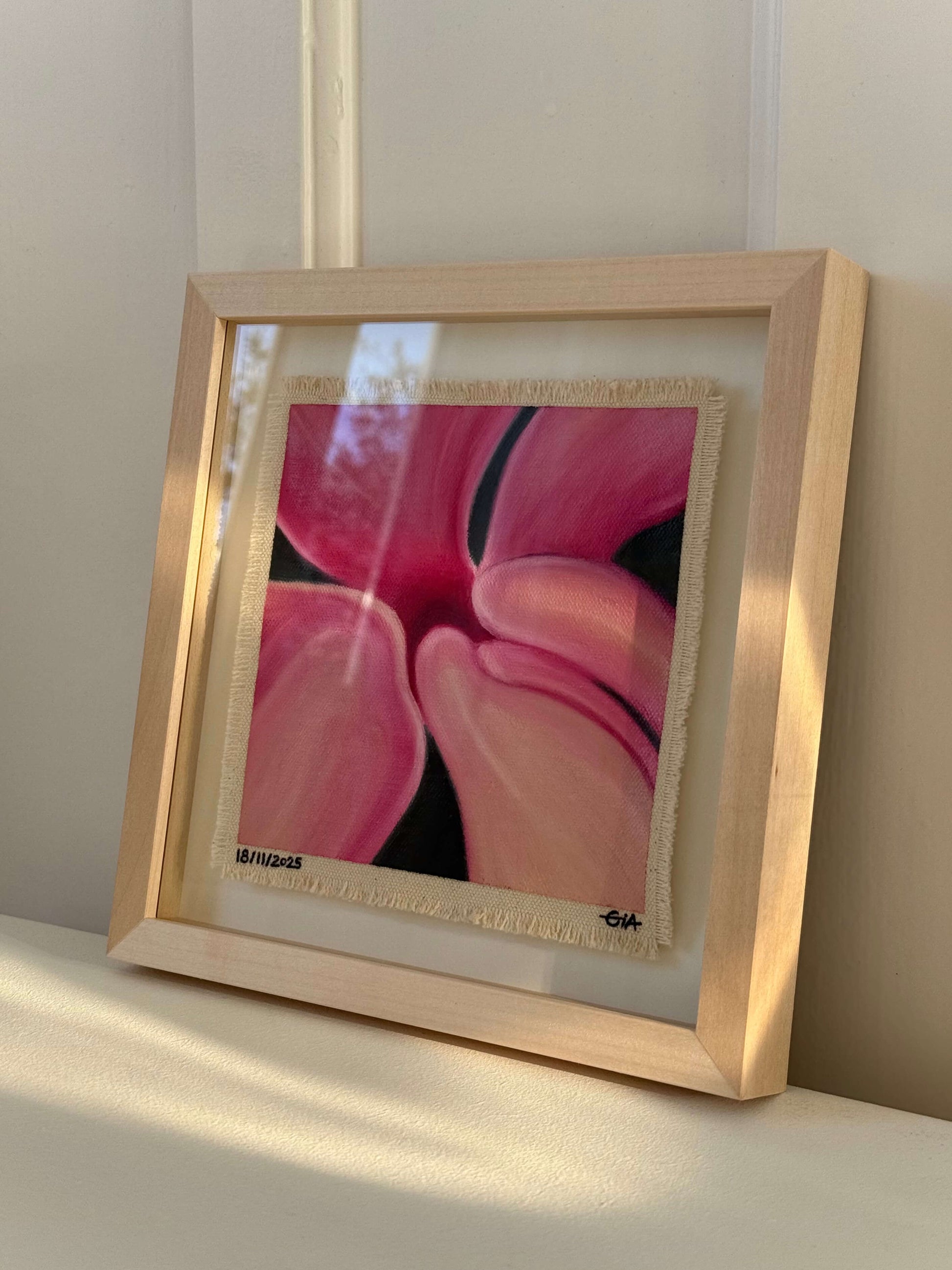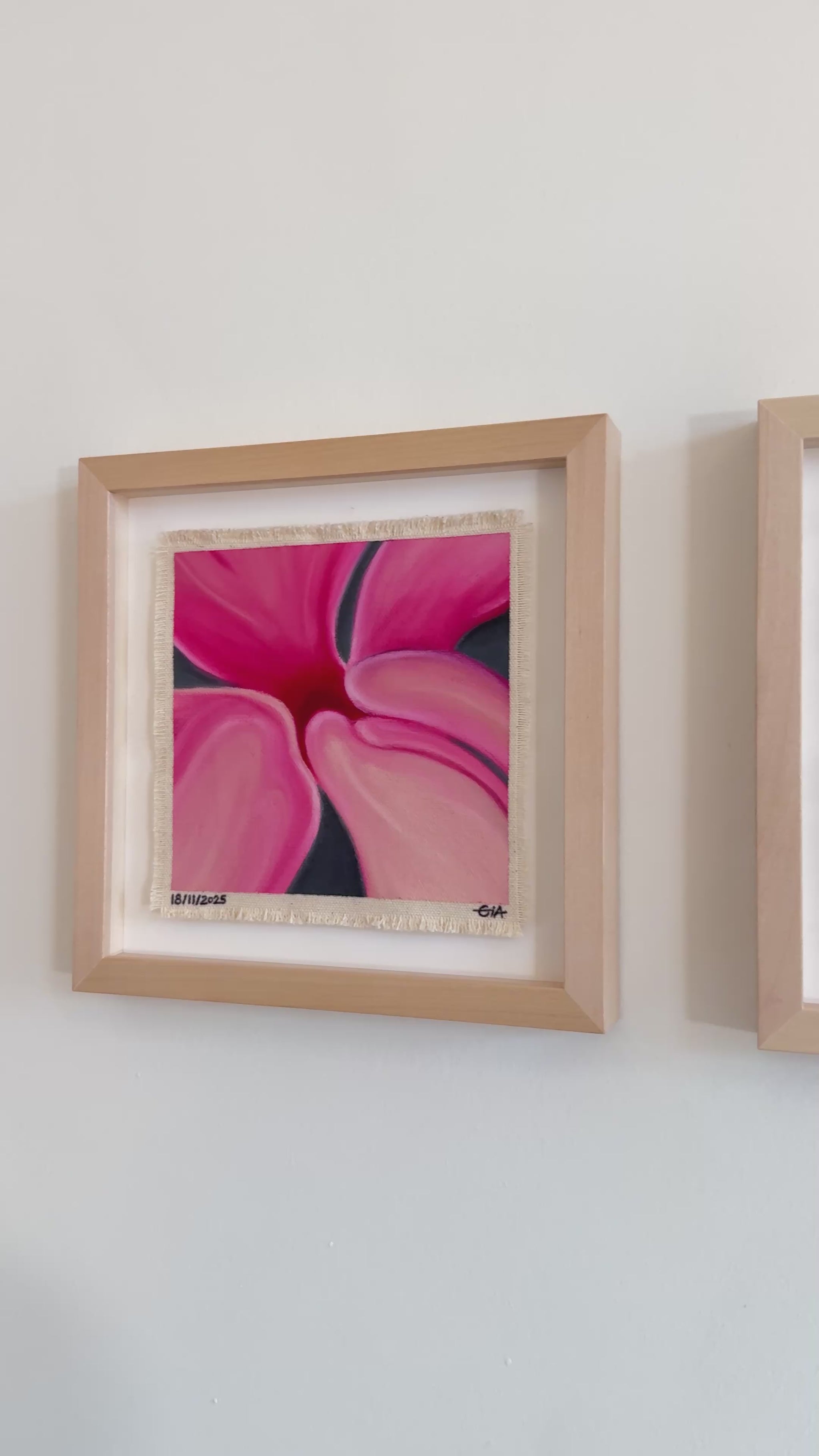Painted with rich, vibrant oil pastels on raw heavy canvas, each artwork is signed, dated, and professionally framed in a wooden object frame behind glass. The compact frame is designed for versatility, it can be hung on the wall, stood upright on a shelf, or laid flat on a table.