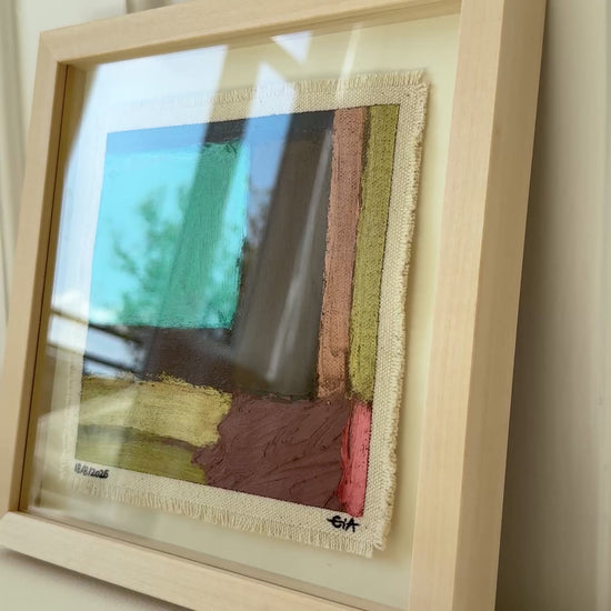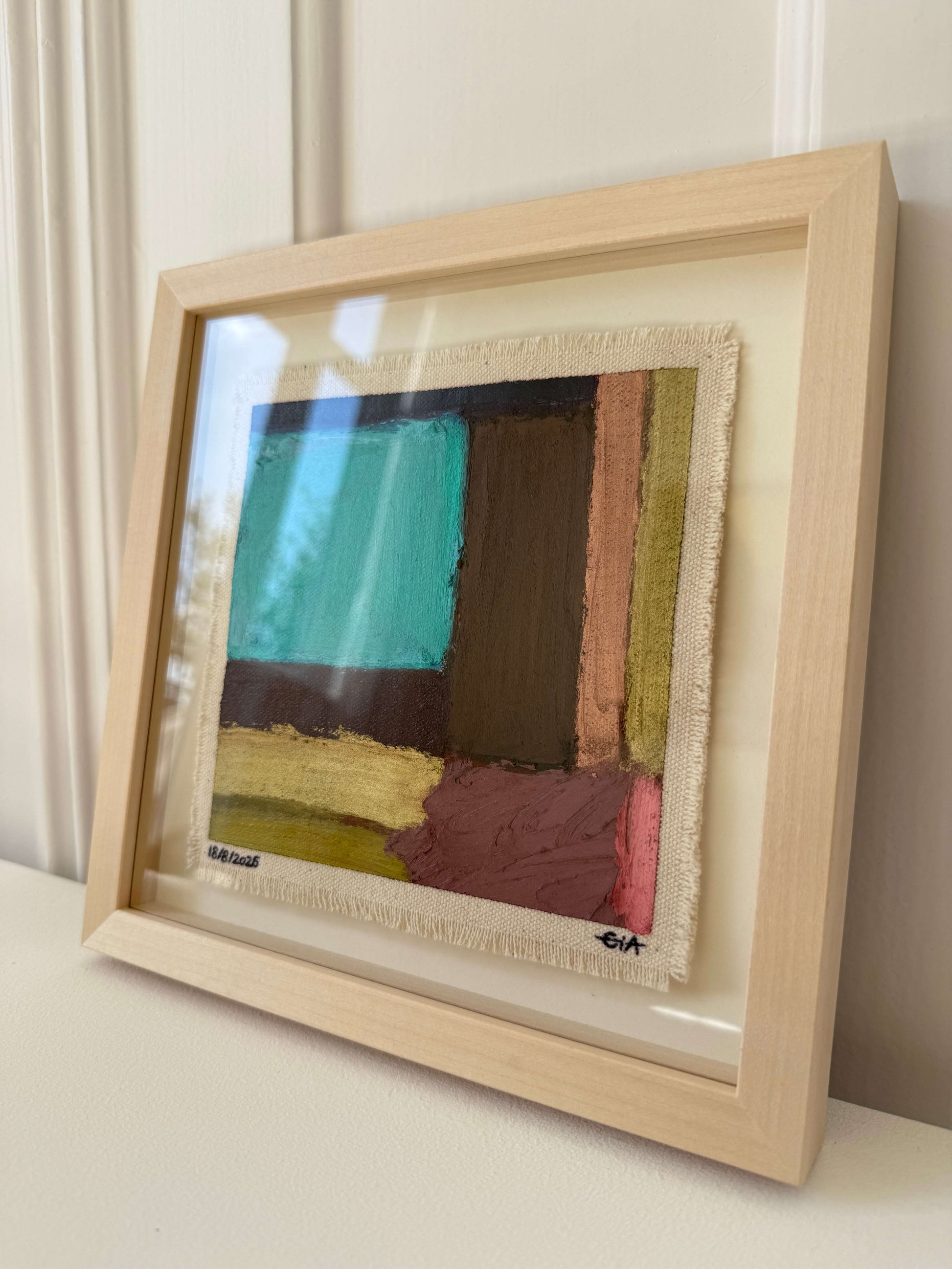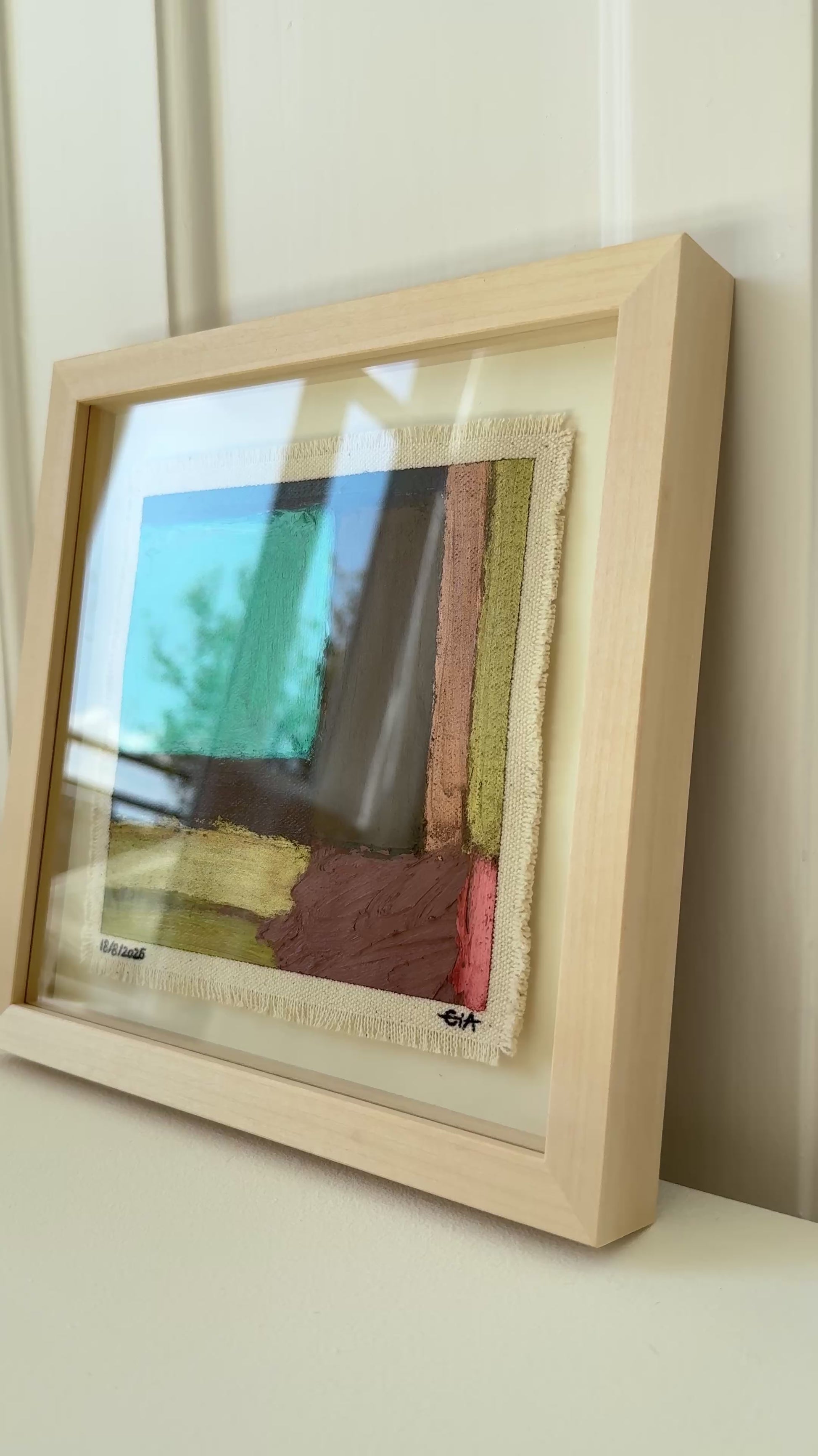 Painted with rich, vibrant oil pastels on raw heavy canvas, each artwork is signed, dated, and professionally framed in a wooden object frame behind glass. The compact frame is designed for versatility, it can be hung on the wall, stood upright on a shelf, or laid flat on a table.