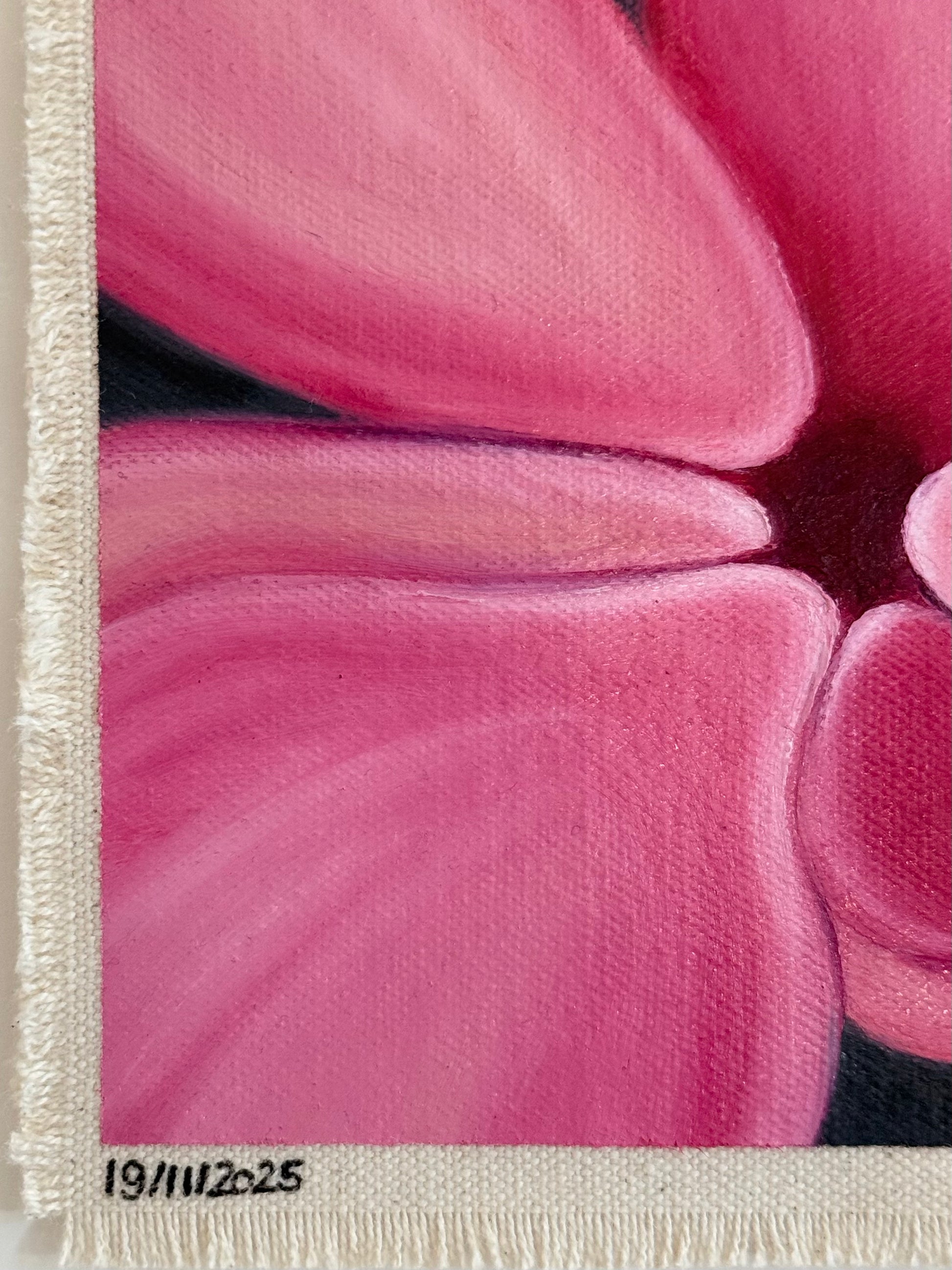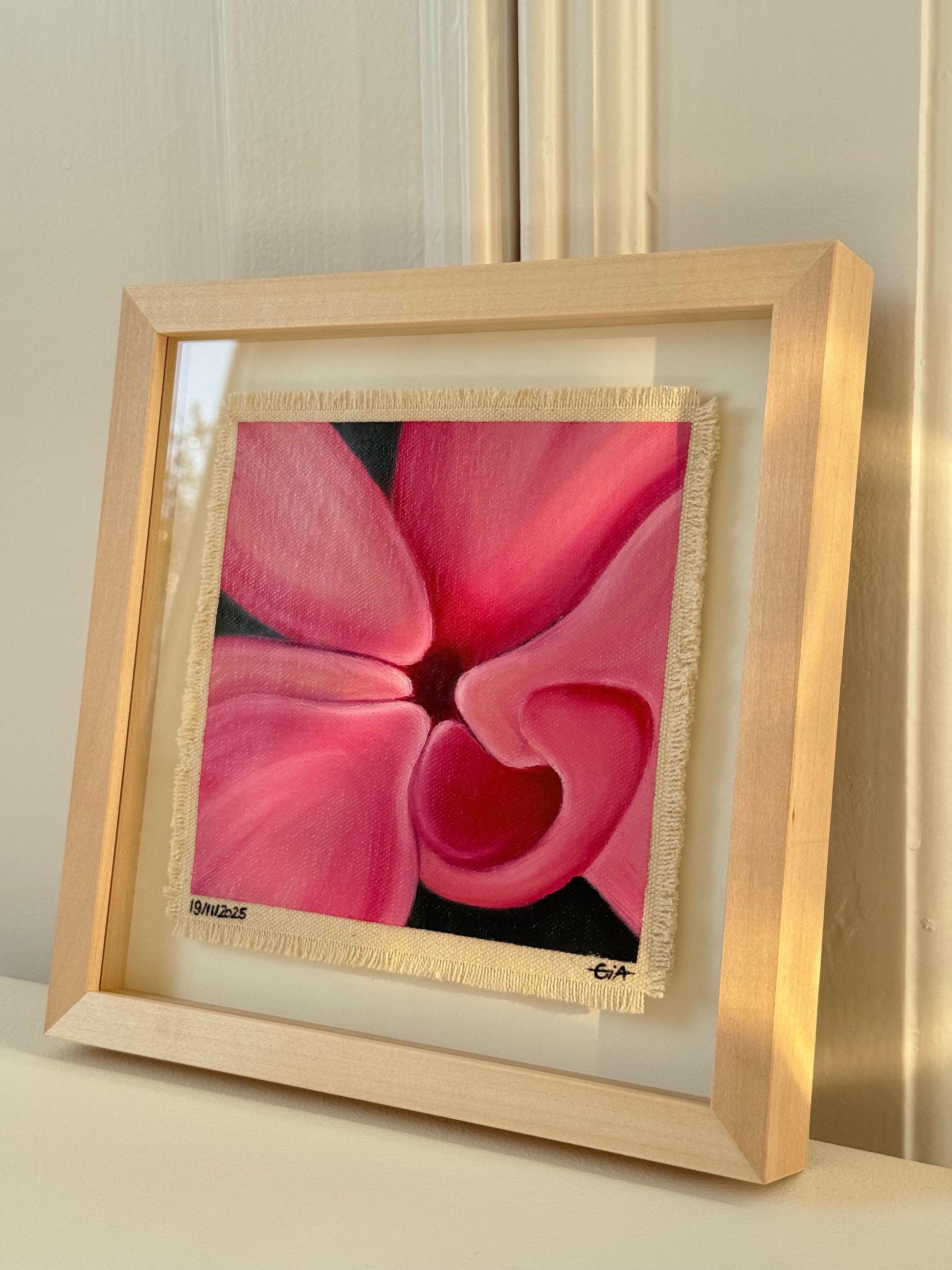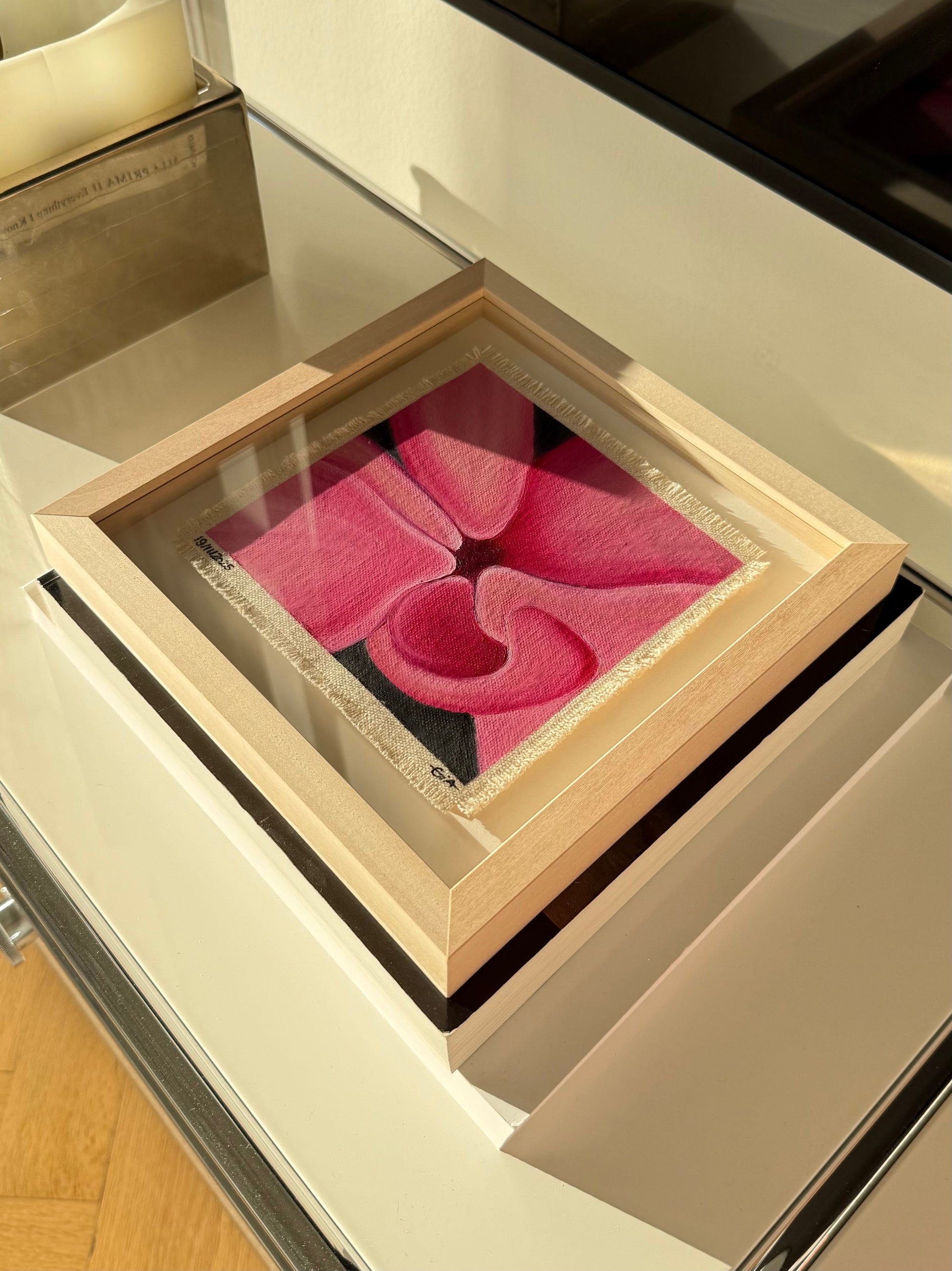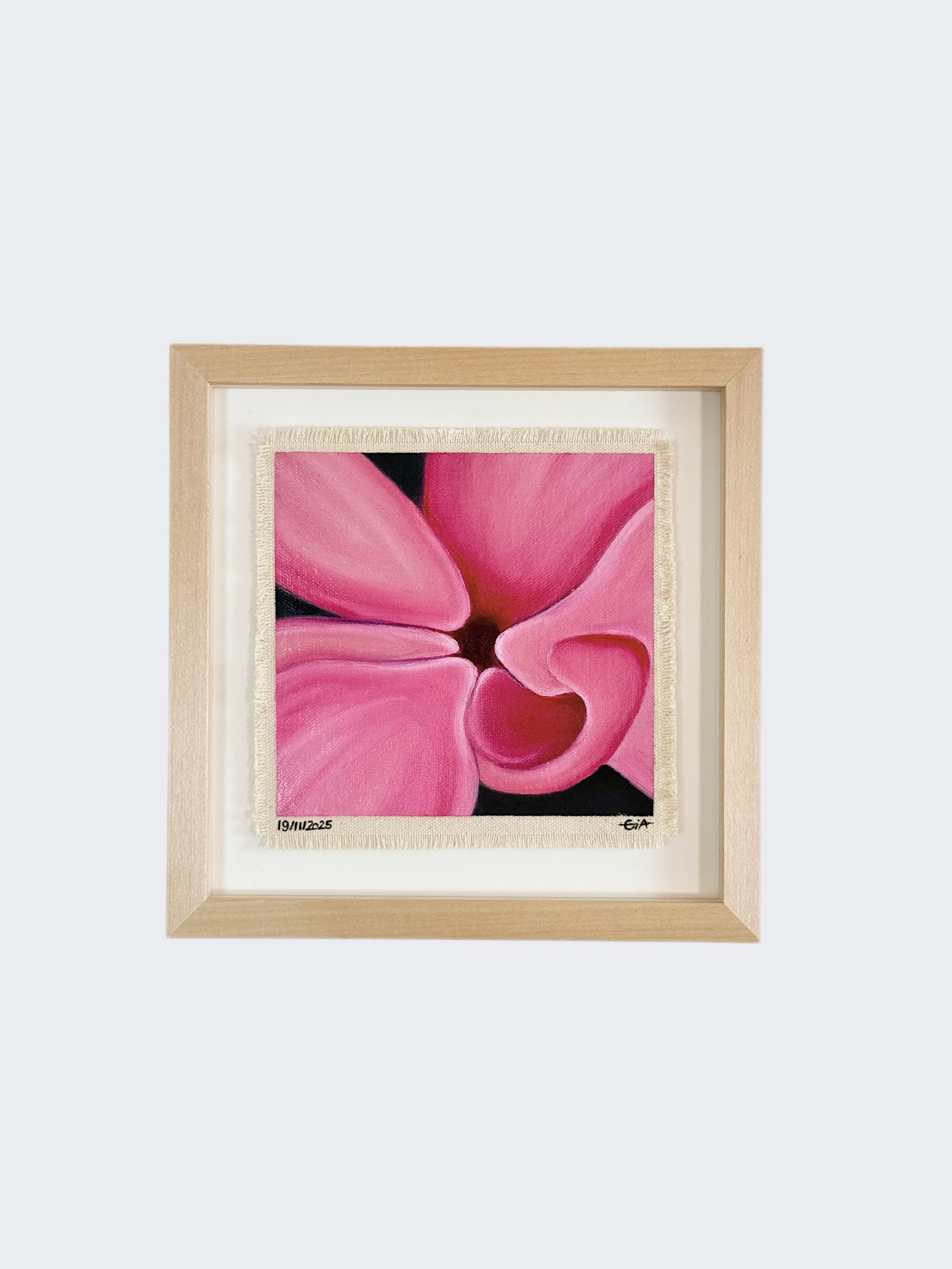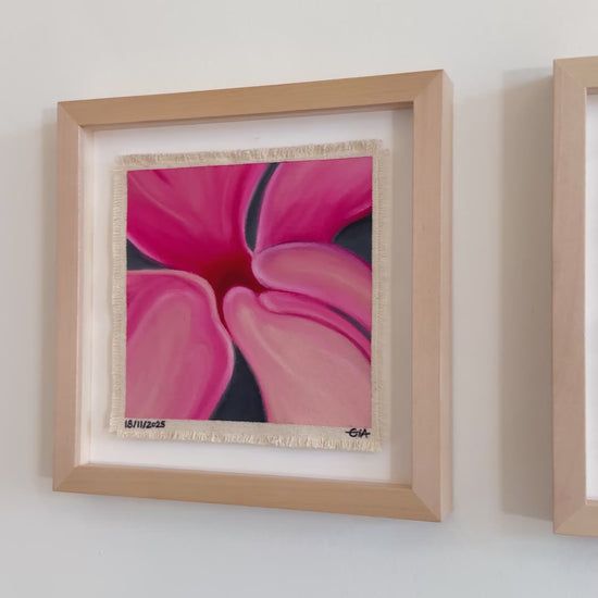 Painted with rich, vibrant oil pastels on raw heavy canvas, each artwork is signed, dated, and professionally framed in a wooden object frame behind glass. The compact frame is designed for versatility, it can be hung on the wall, stood upright on a shelf, or laid flat on a table.