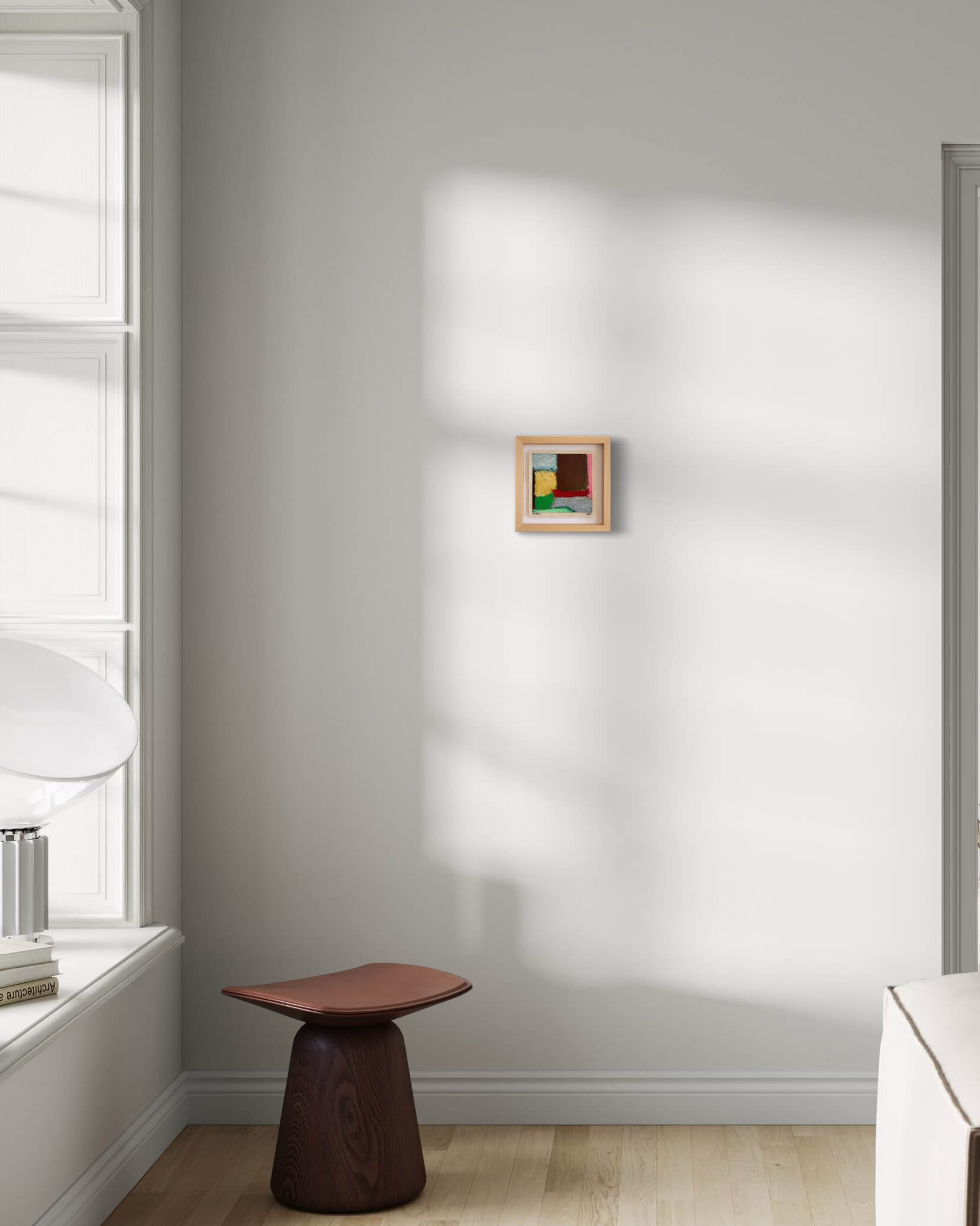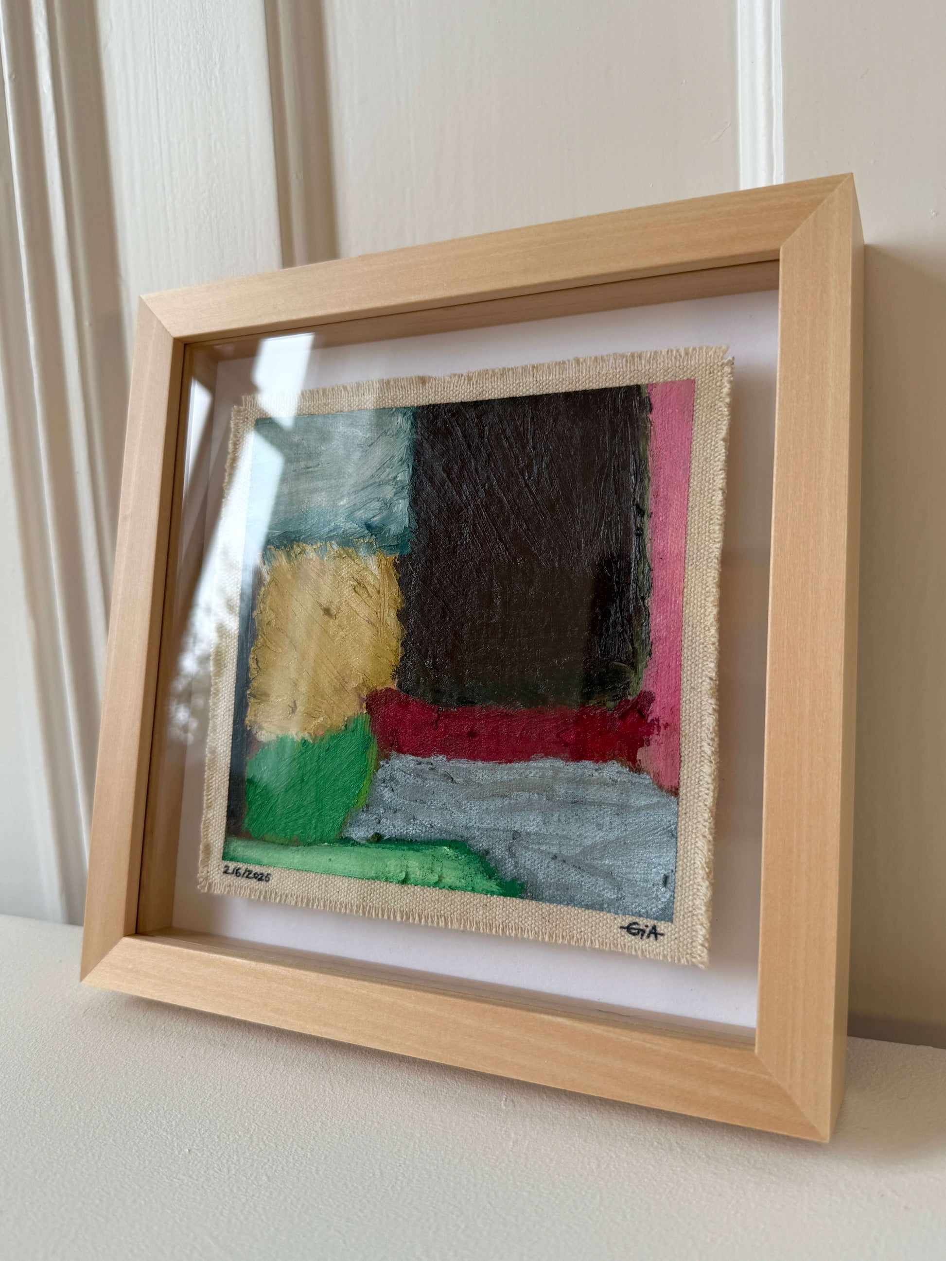 Painted with rich, vibrant oil pastels on raw heavy canvas, each artwork is signed, dated, and professionally framed in a wooden object frame behind glass. The compact frame is designed for versatility, it can be hung on the wall, stood upright on a shelf, or laid flat on a table.