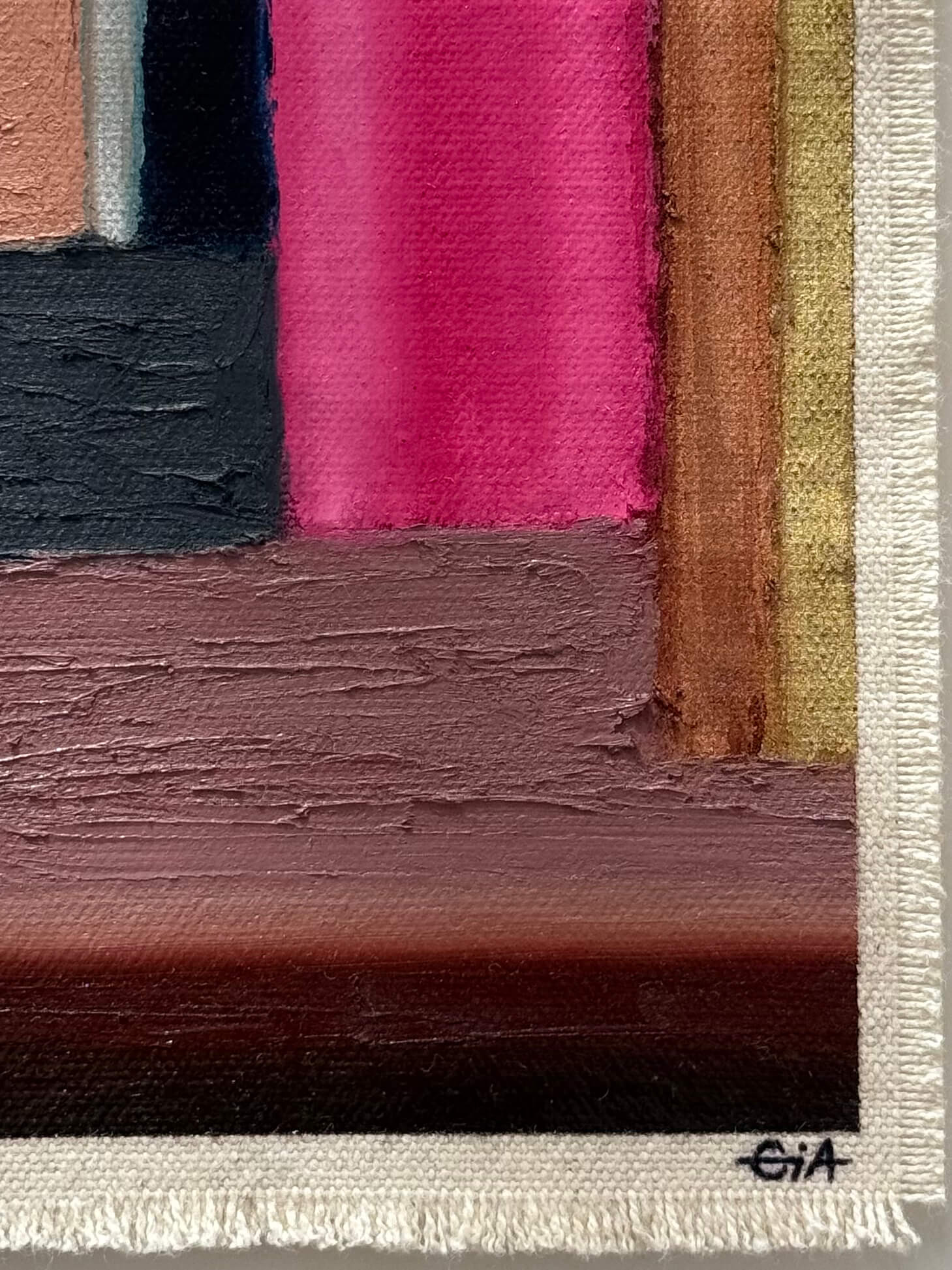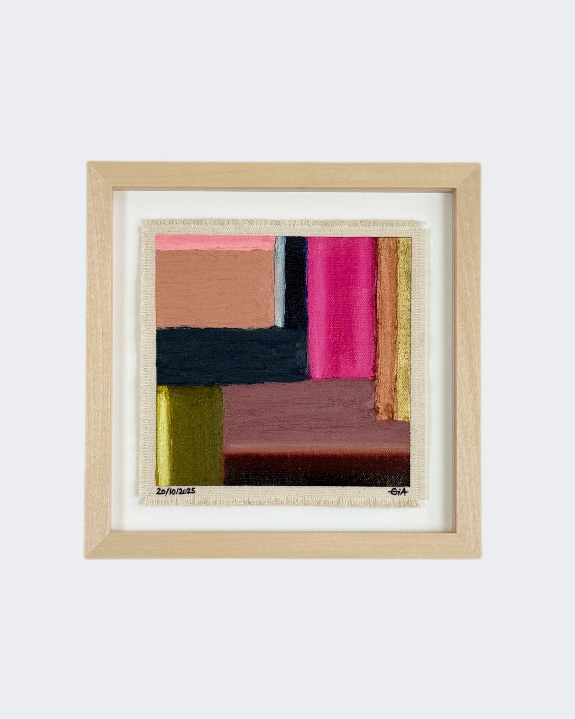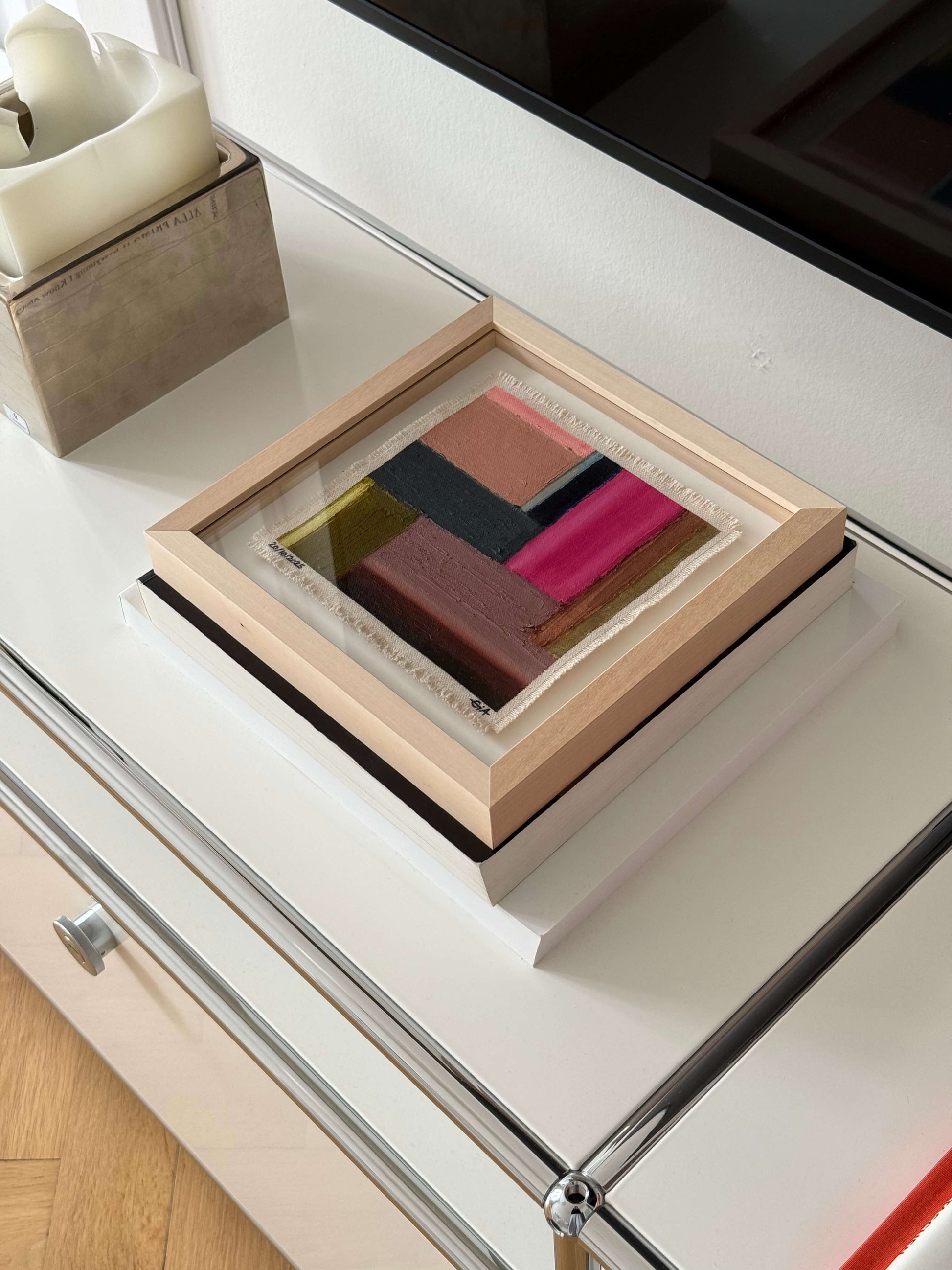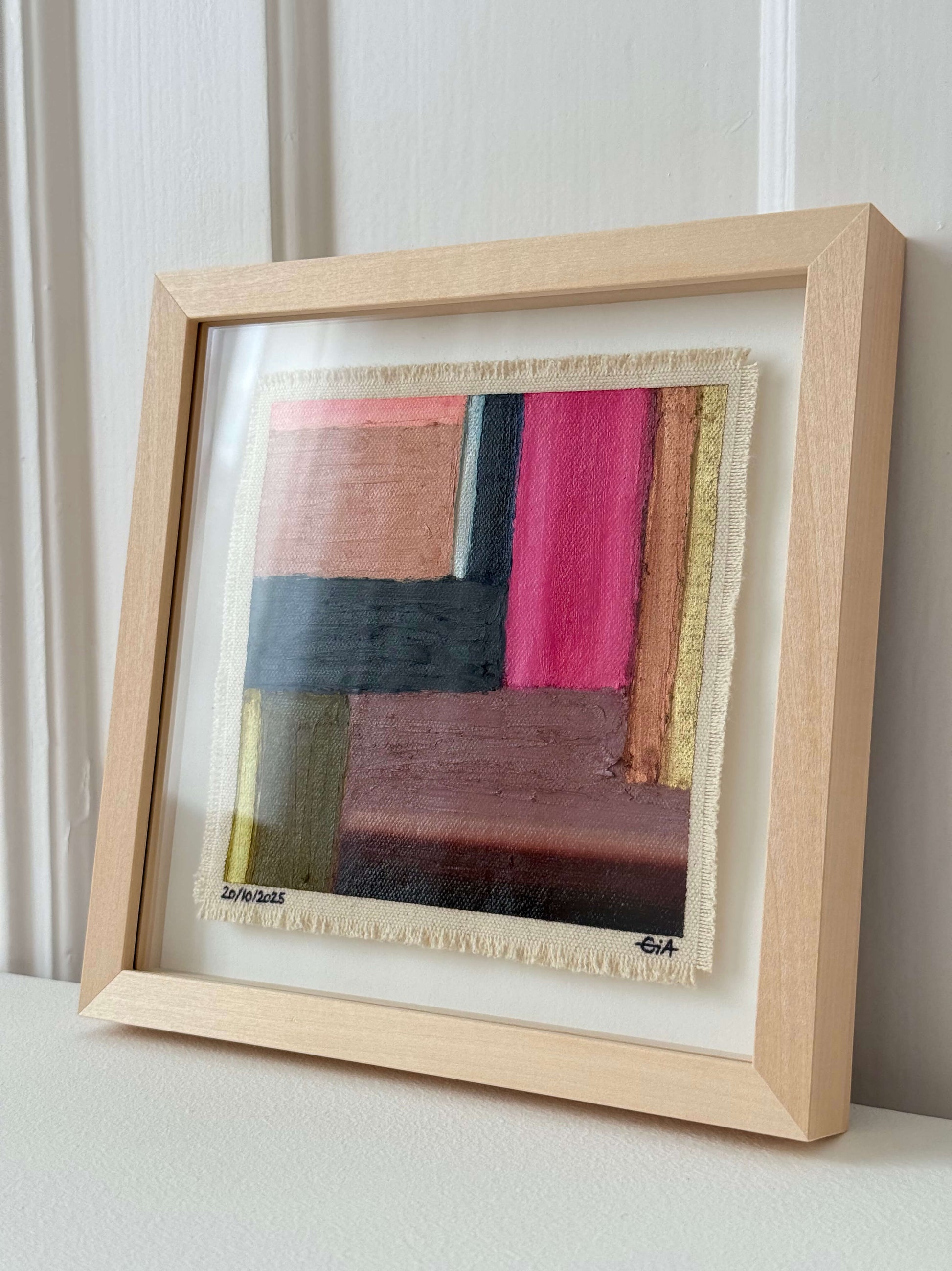 Painted with rich, vibrant oil pastels on raw heavy canvas, each artwork is signed, dated, and professionally framed in a wooden object frame behind glass. The compact frame is designed for versatility, it can be hung on the wall, stood upright on a shelf, or laid flat on a table.