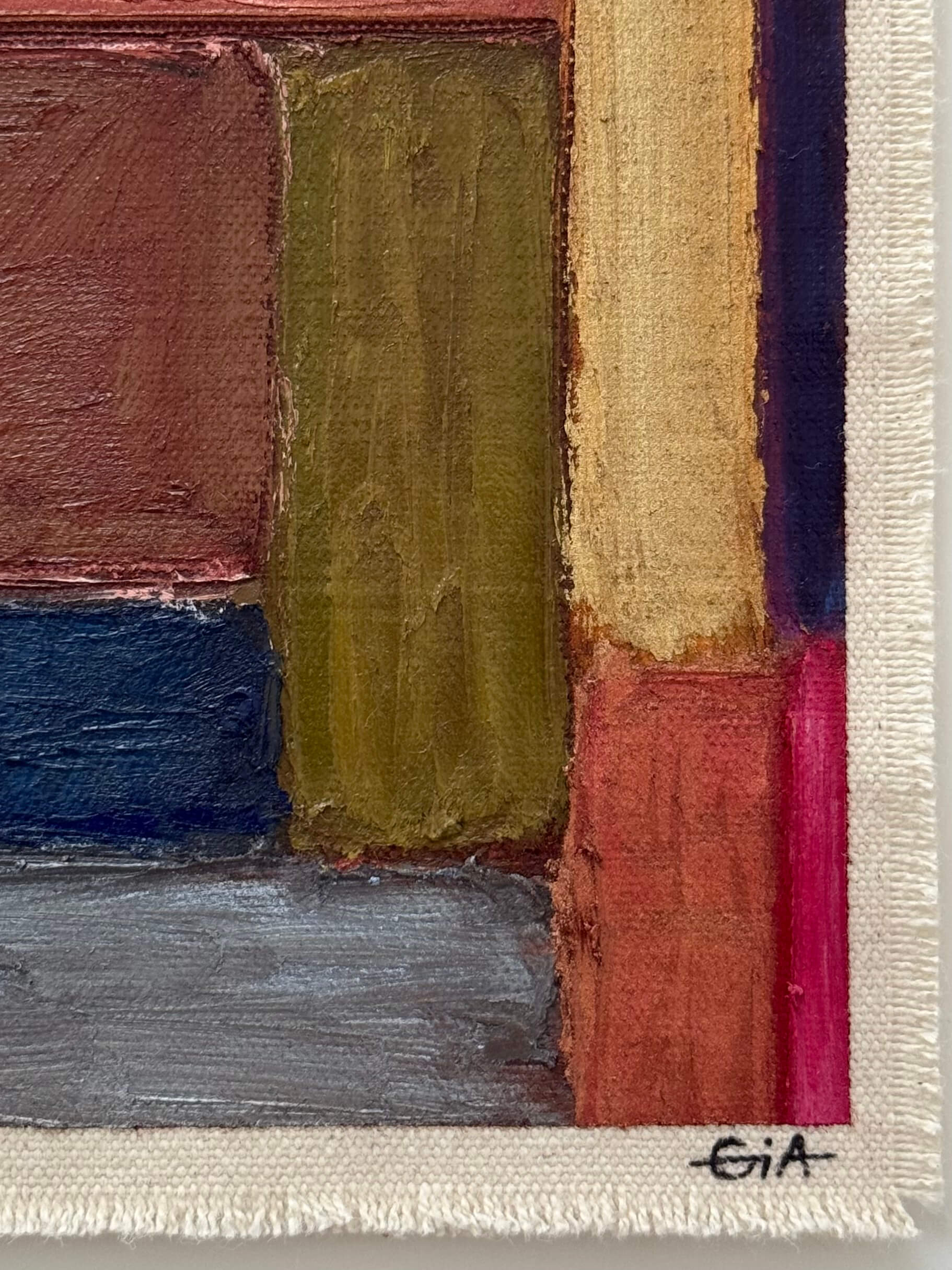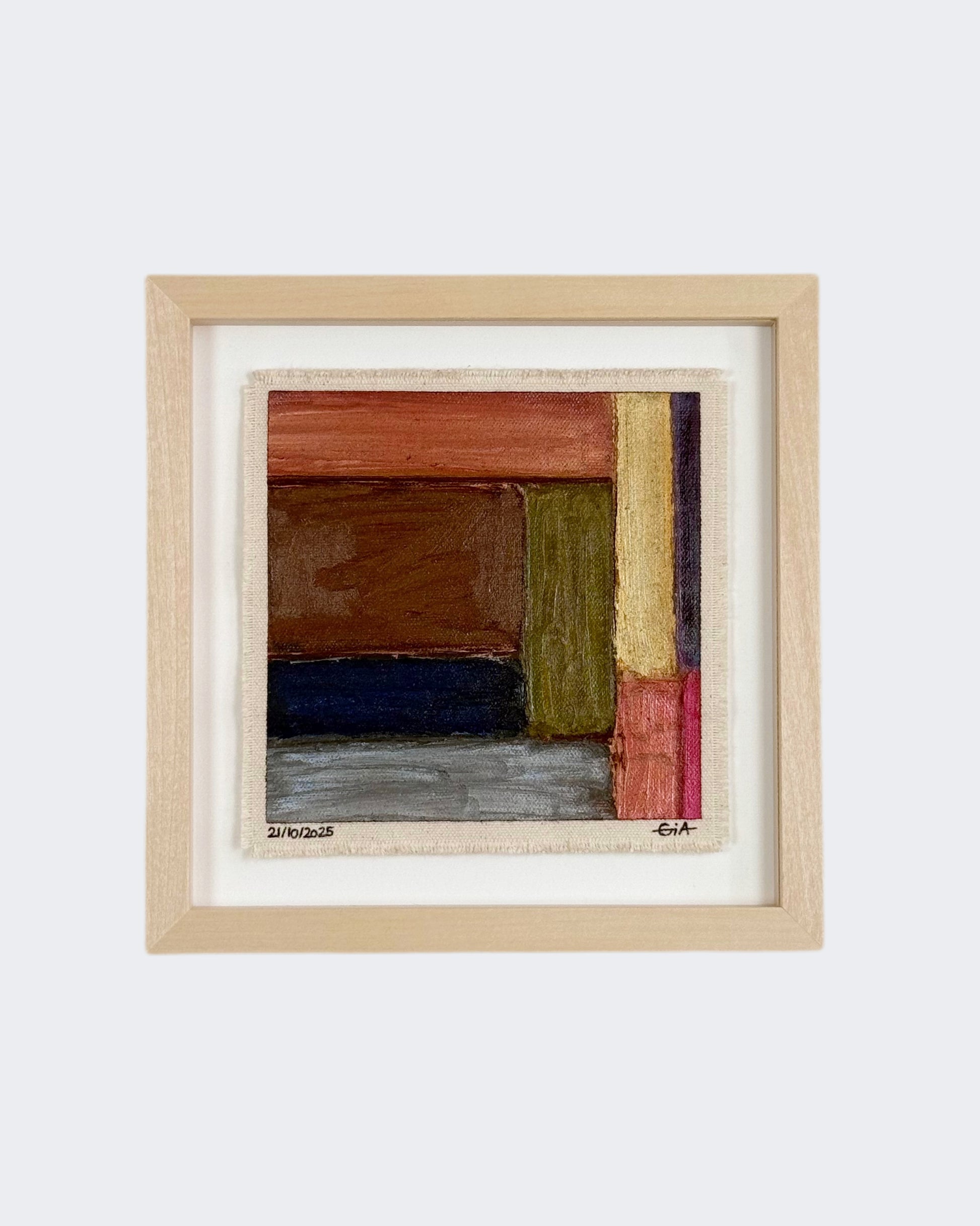 Painted with rich, vibrant oil pastels on raw heavy canvas, each artwork is signed, dated, and professionally framed in a wooden object frame behind glass. The compact frame is designed for versatility, it can be hung on the wall, stood upright on a shelf, or laid flat on a table.