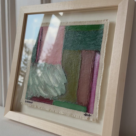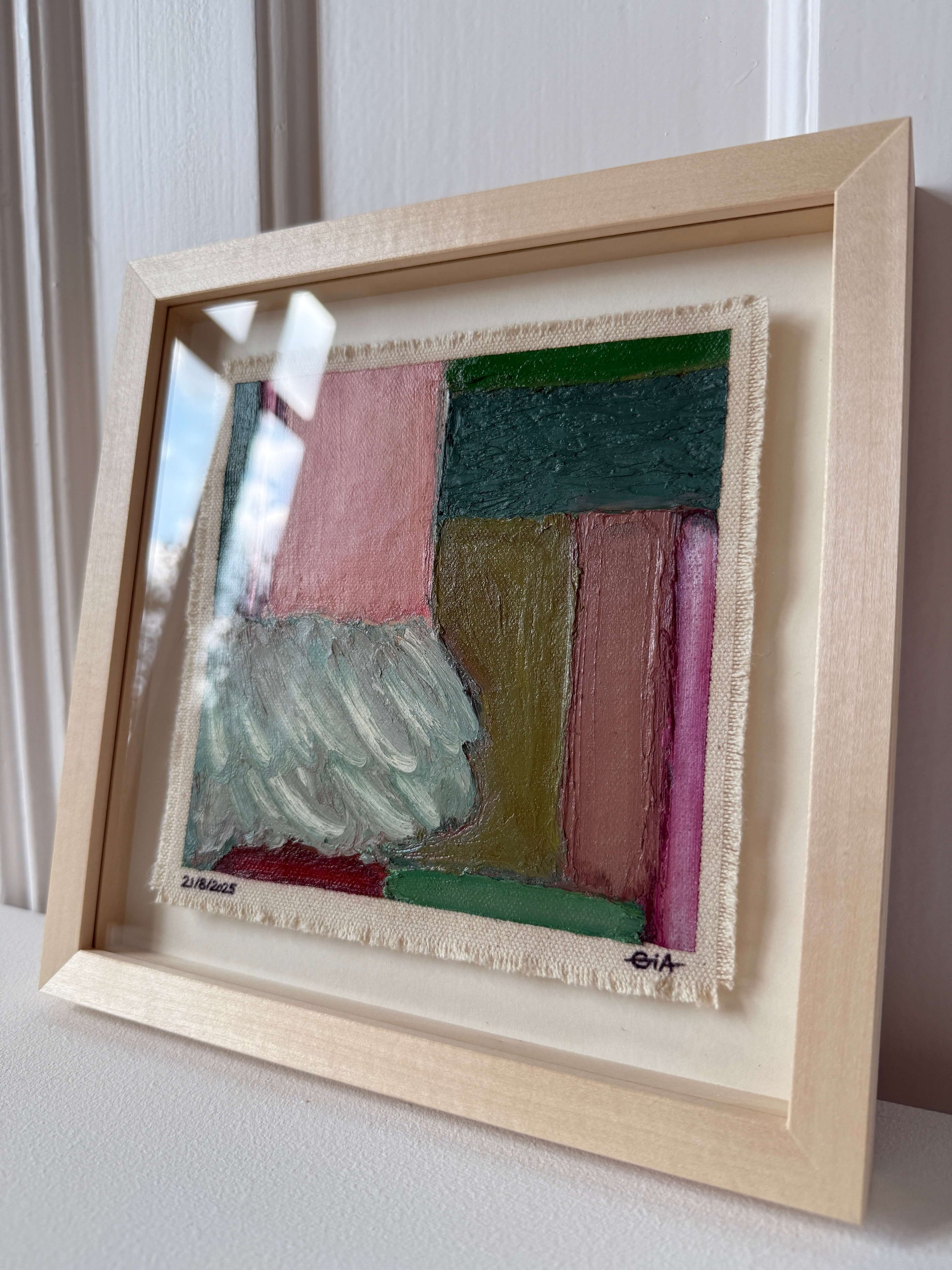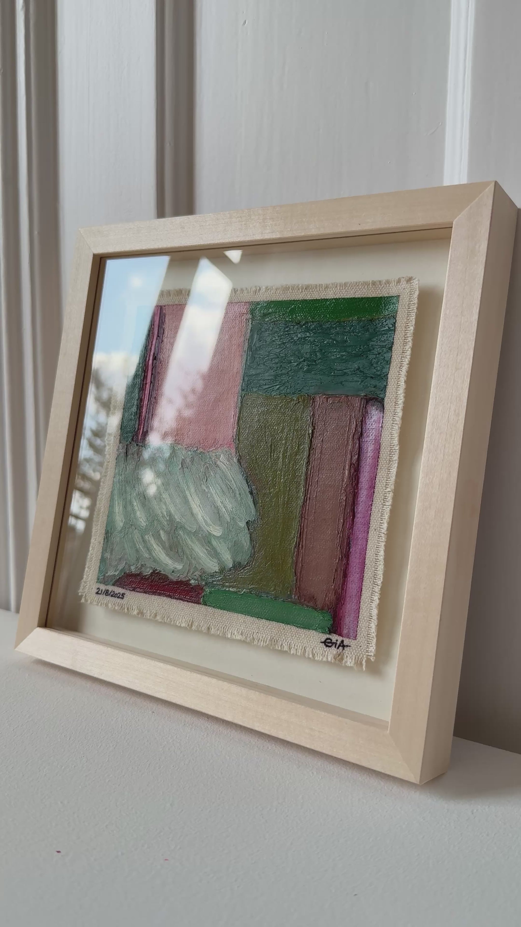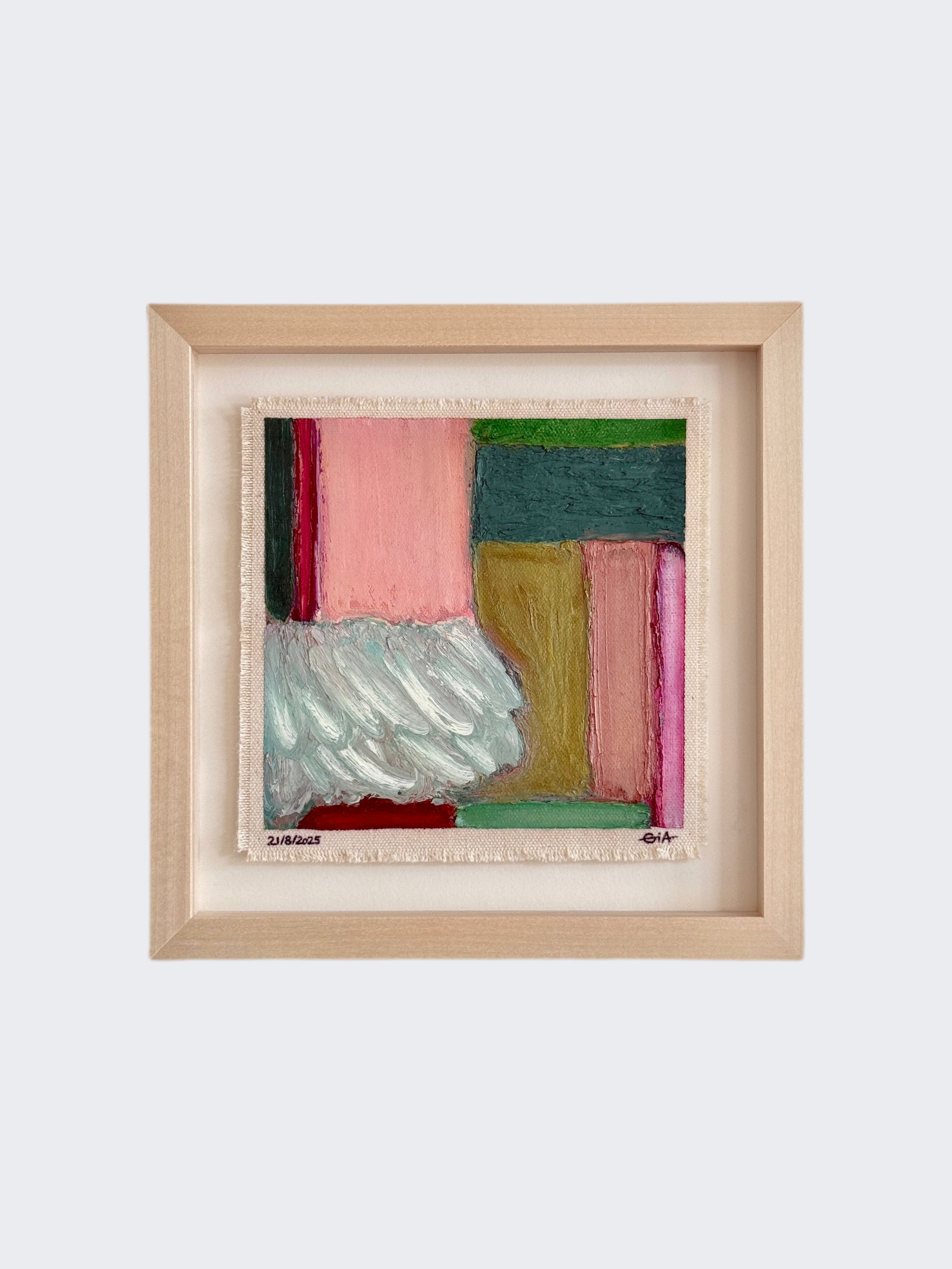 Painted with rich, vibrant oil pastels on raw heavy canvas, each artwork is signed, dated, and professionally framed in a wooden object frame behind glass. The compact frame is designed for versatility, it can be hung on the wall, stood upright on a shelf, or laid flat on a table.