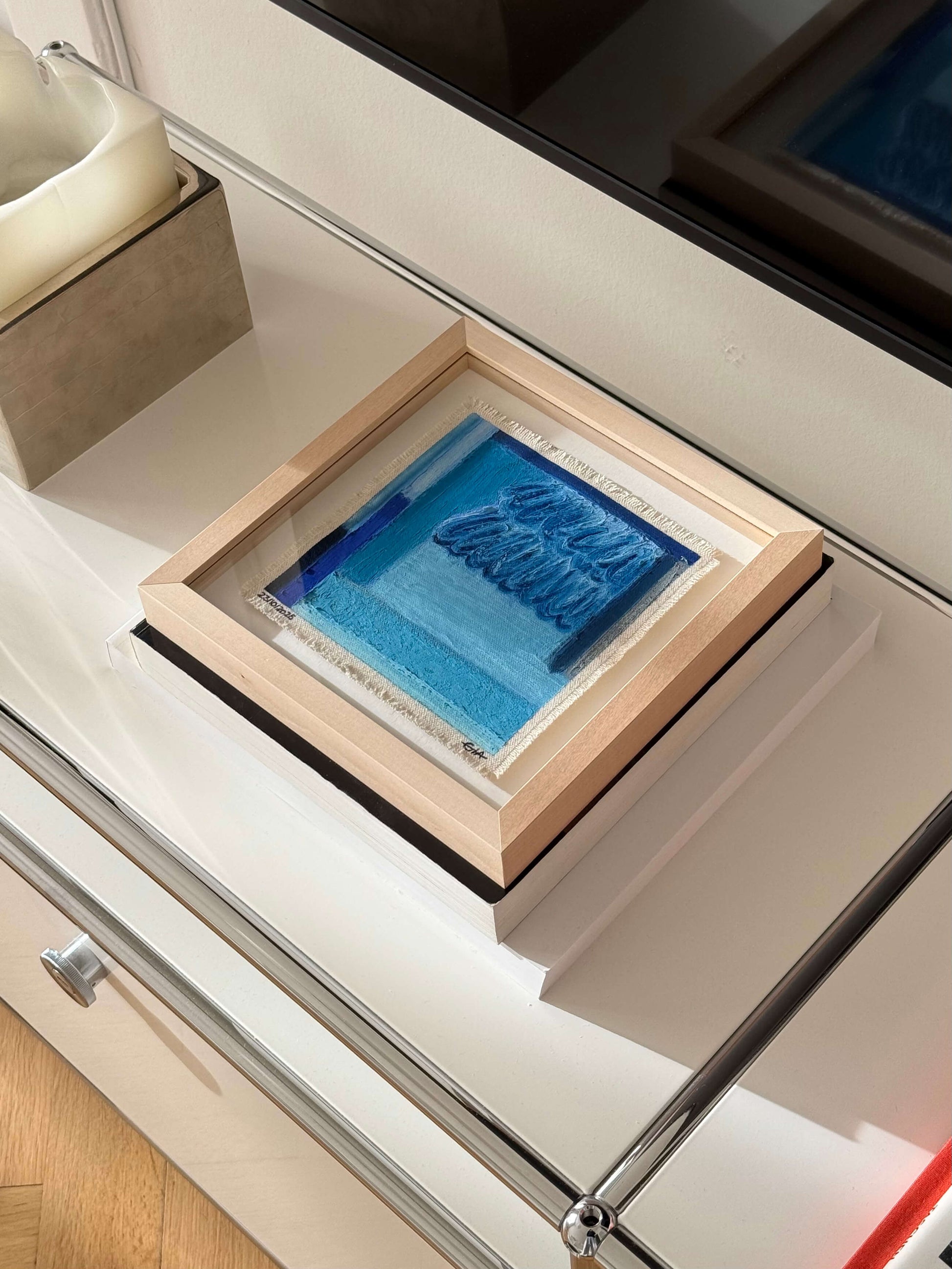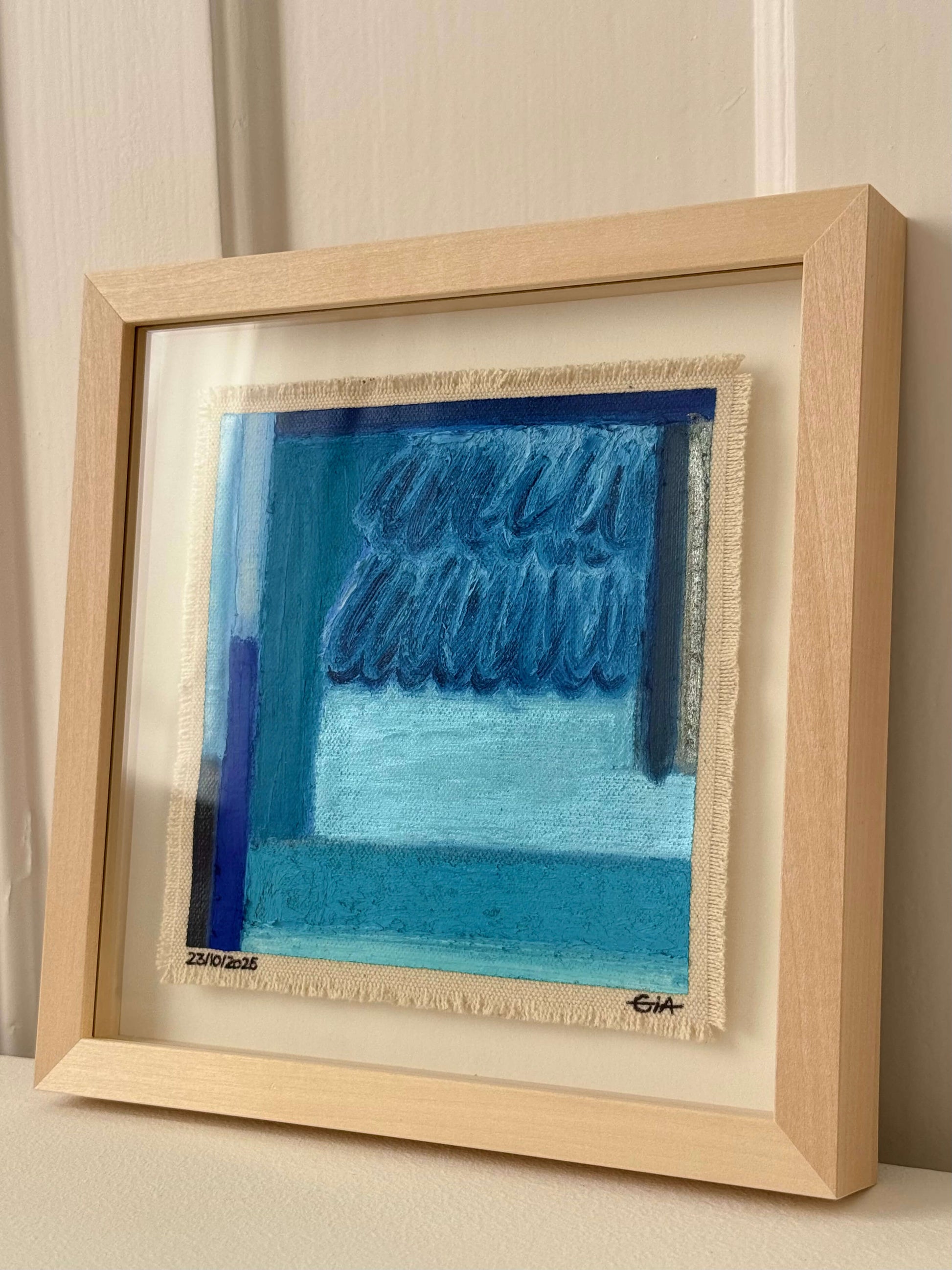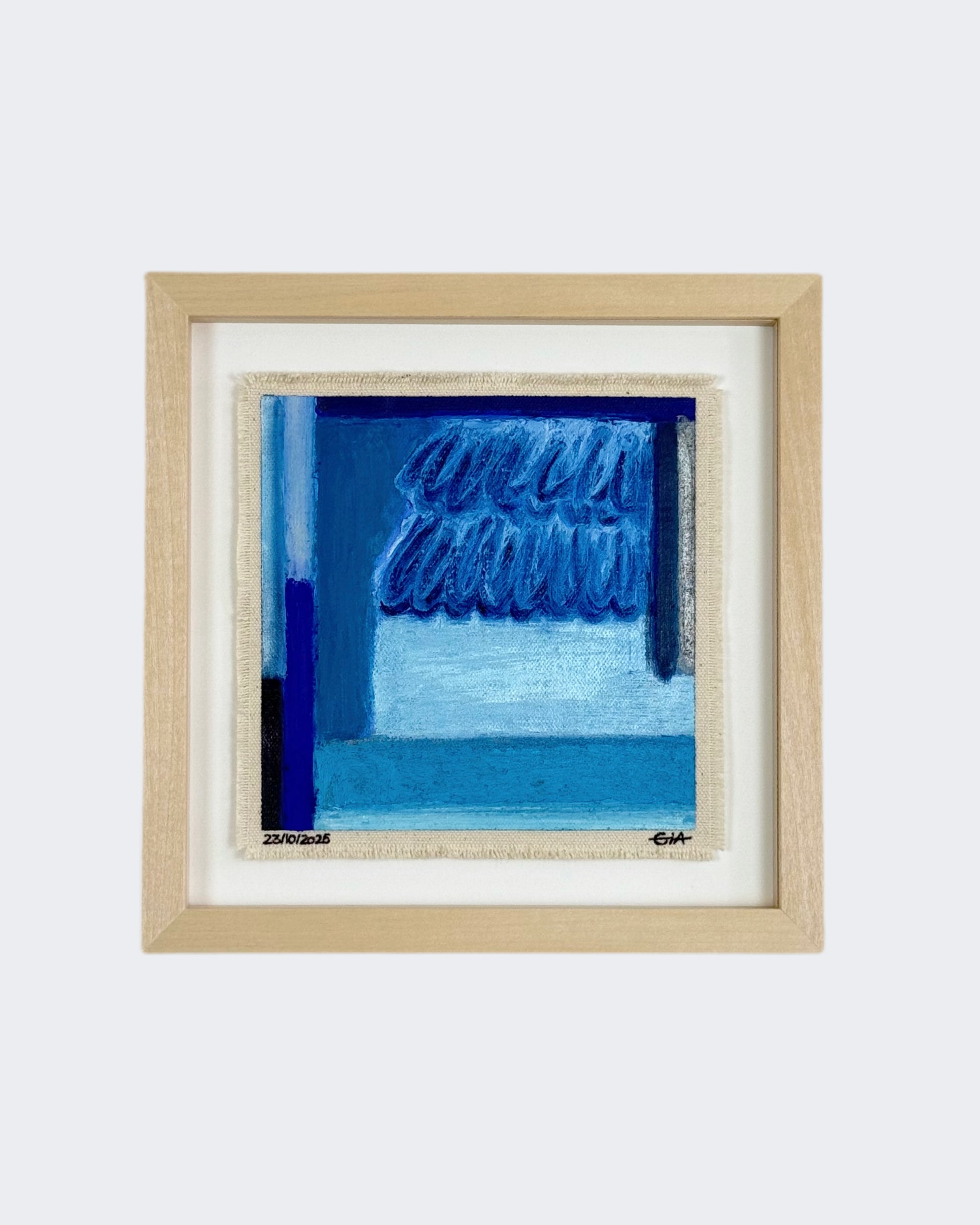Painted with rich, vibrant oil pastels on raw heavy canvas, each artwork is signed, dated, and professionally framed in a wooden object frame behind glass. The compact frame is designed for versatility, it can be hung on the wall, stood upright on a shelf, or laid flat on a table.