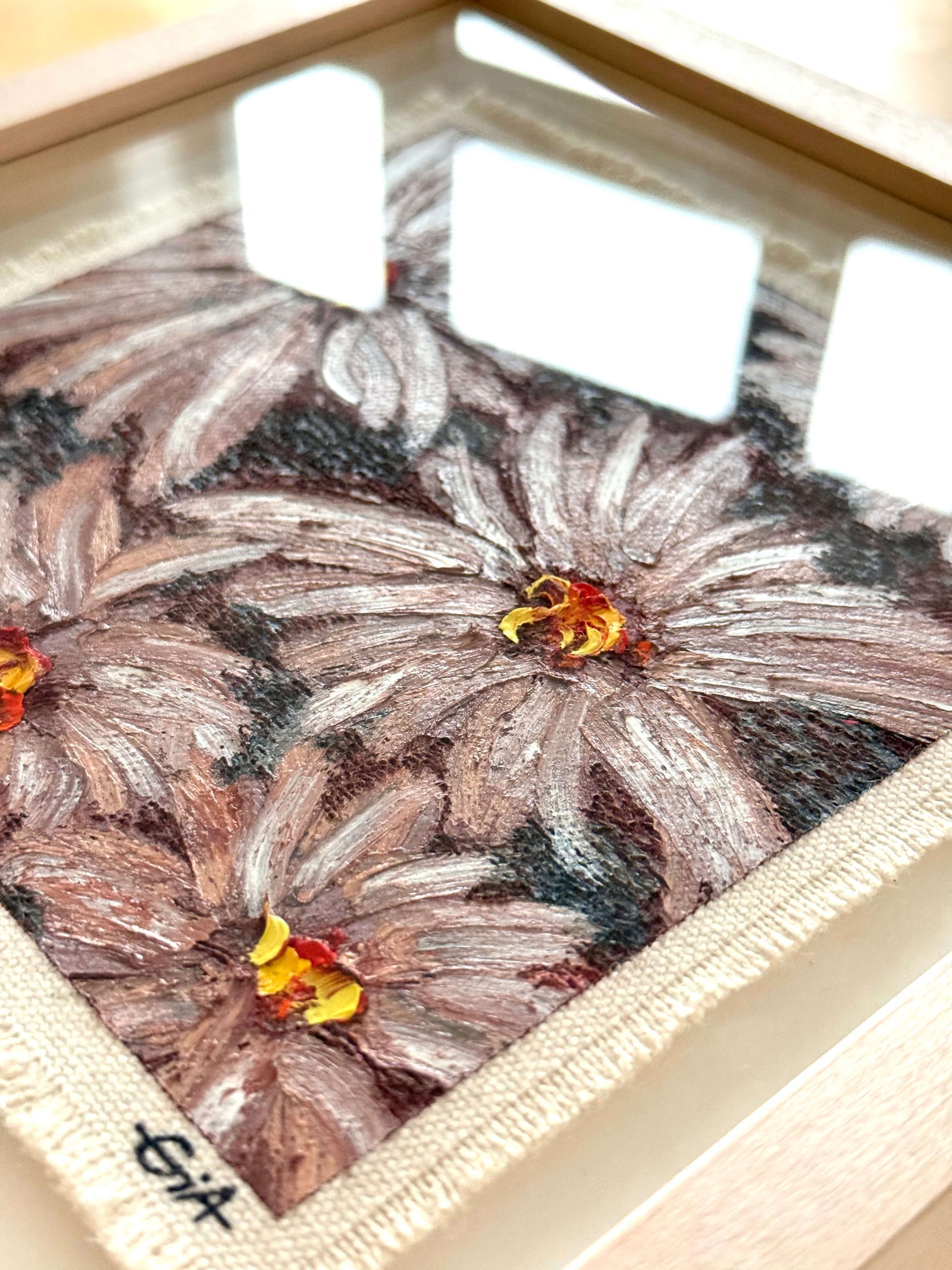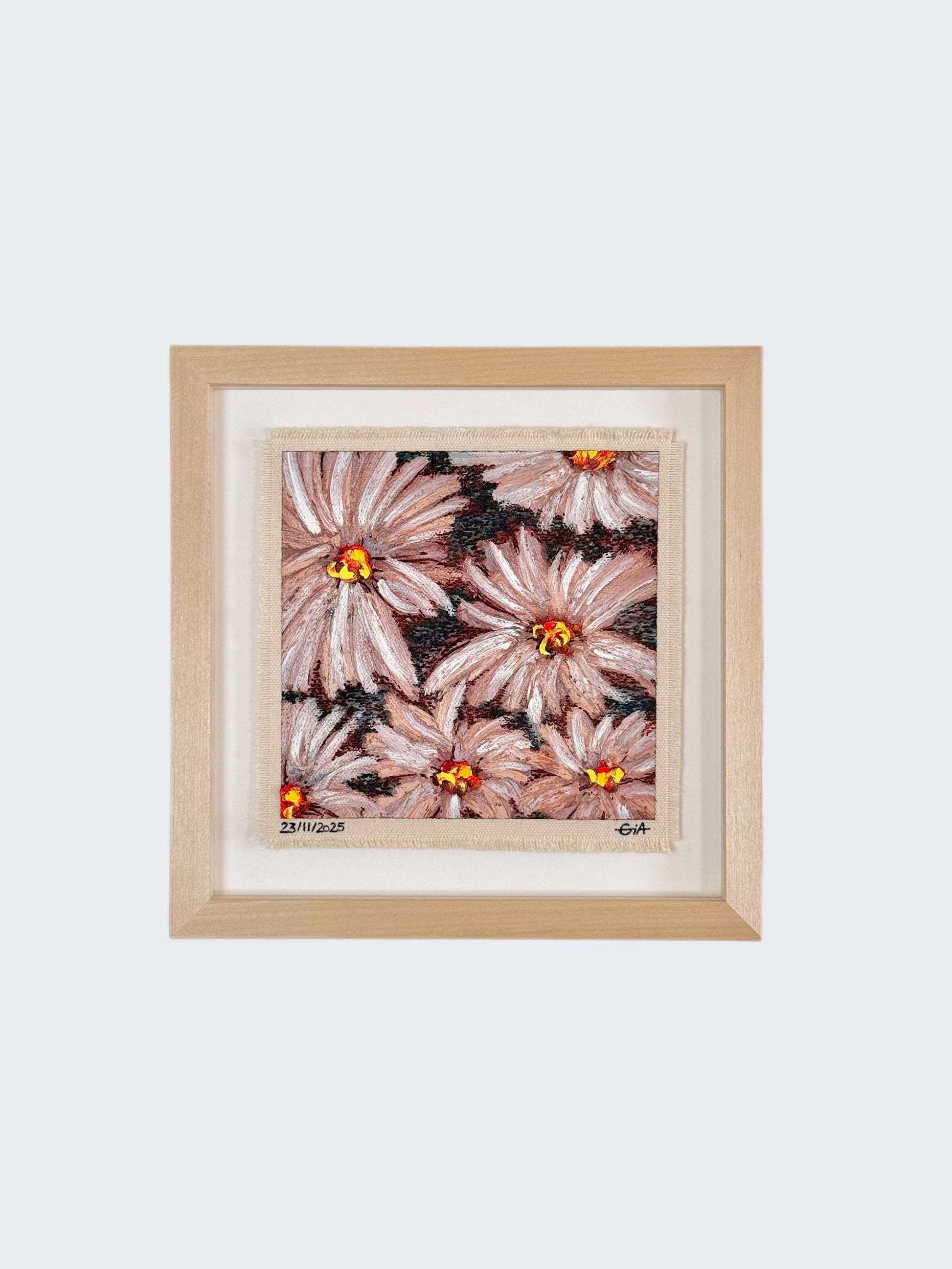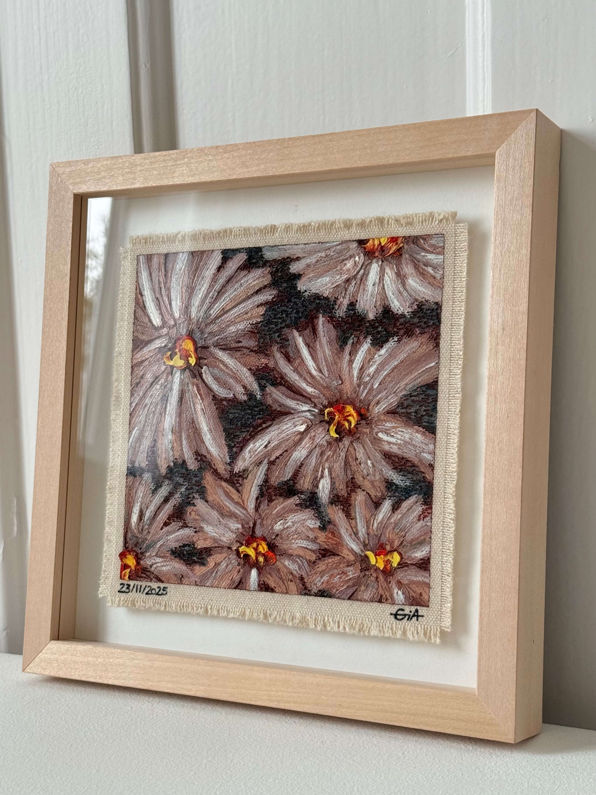 Painted with rich, vibrant oil pastels on raw heavy canvas, each artwork is signed, dated, and professionally framed in a wooden object frame behind glass. The compact frame is designed for versatility, it can be hung on the wall, stood upright on a shelf, or laid flat on a table.