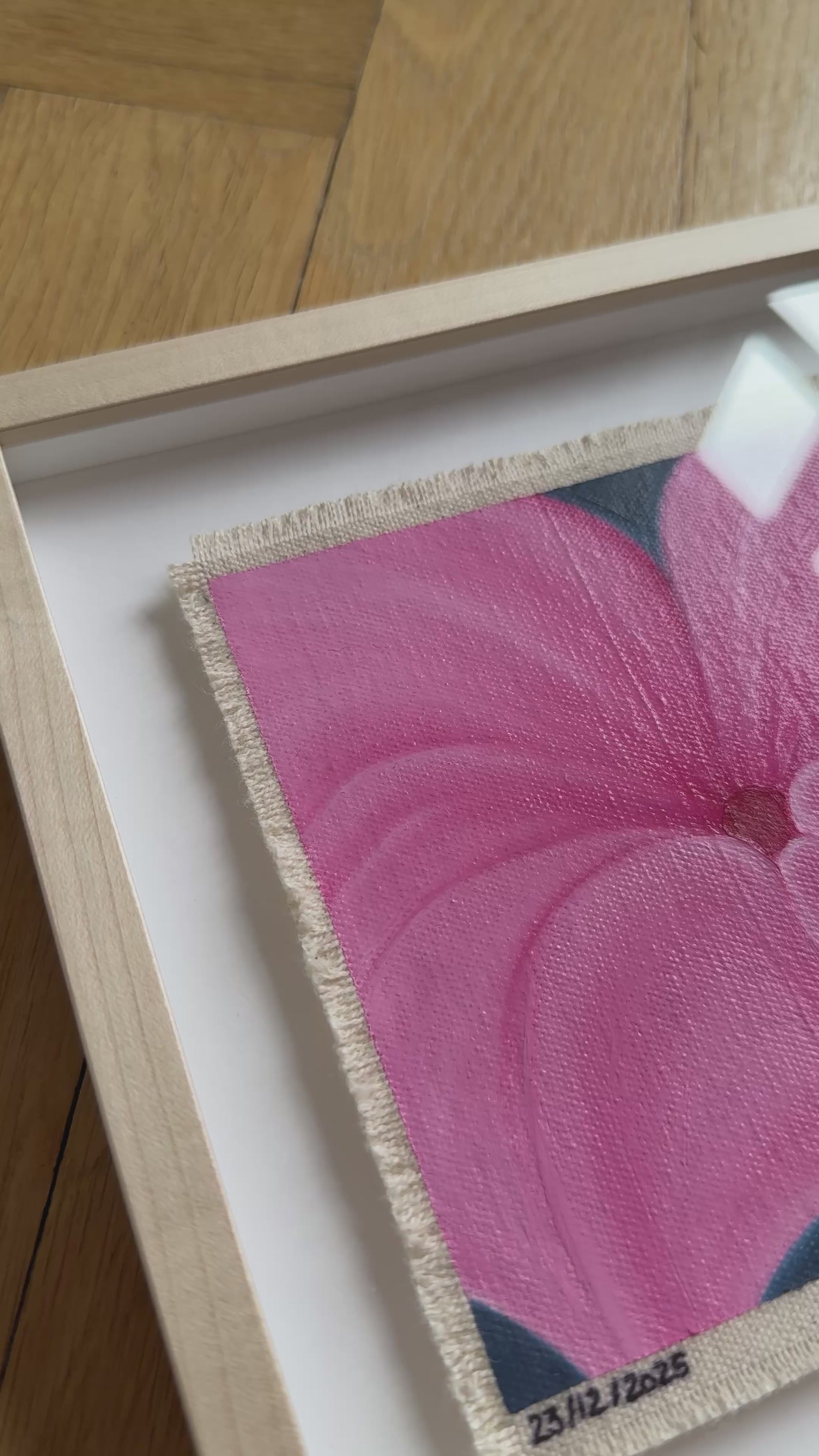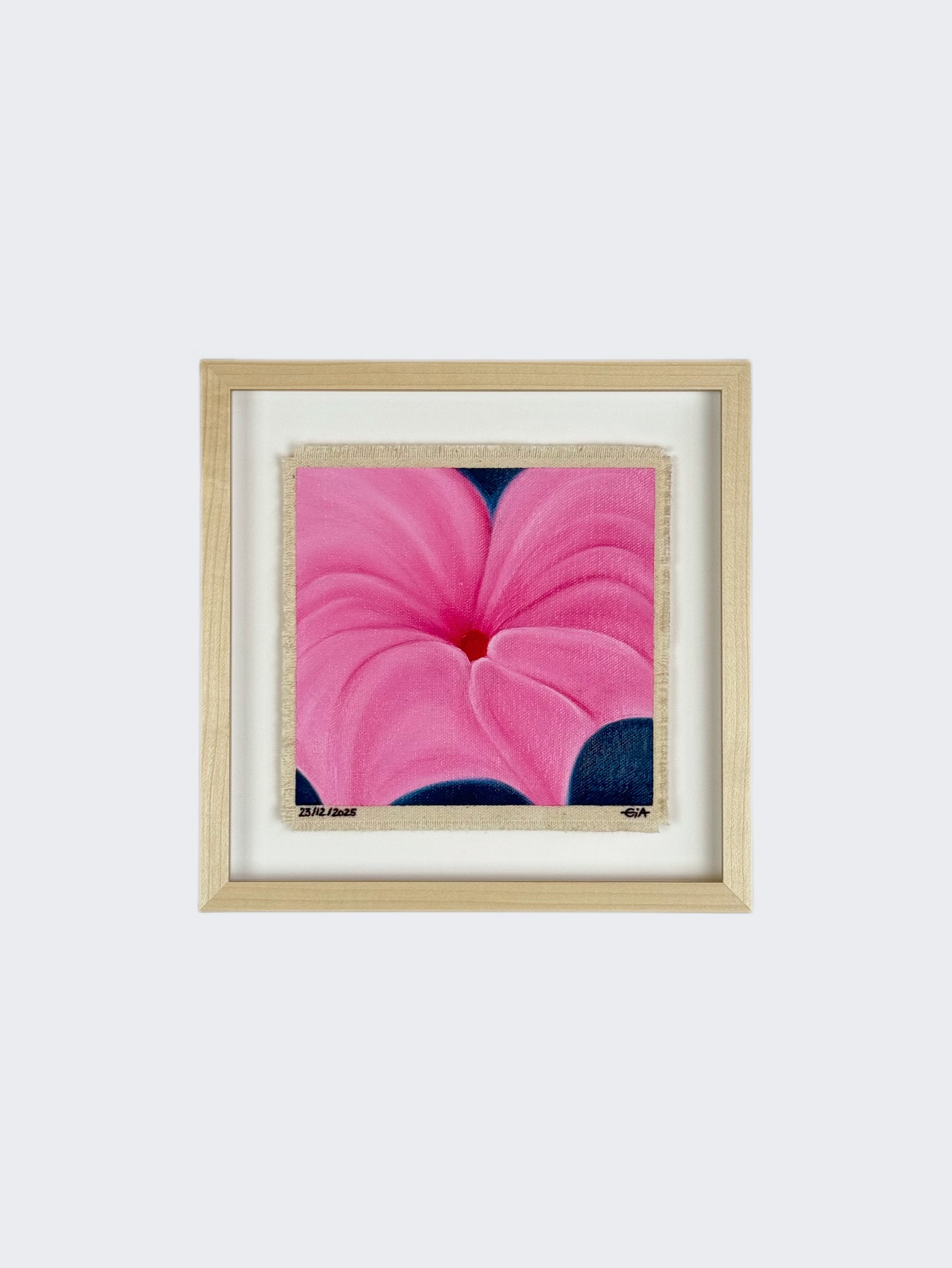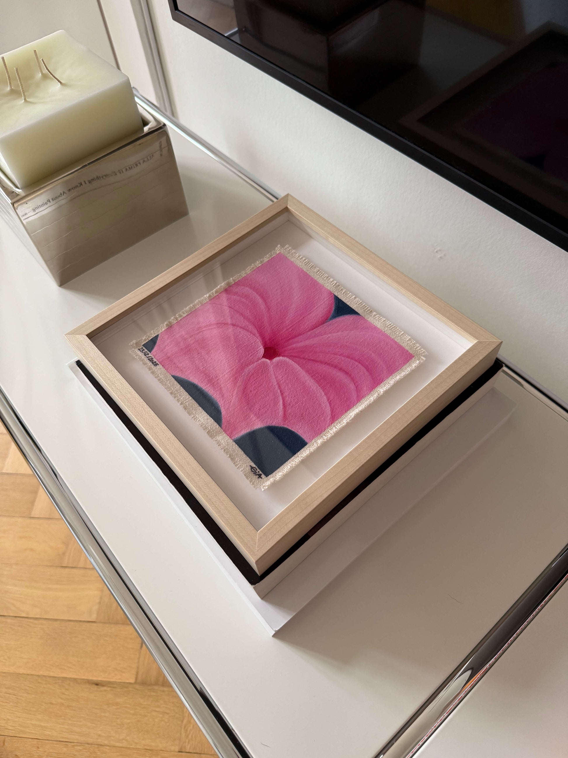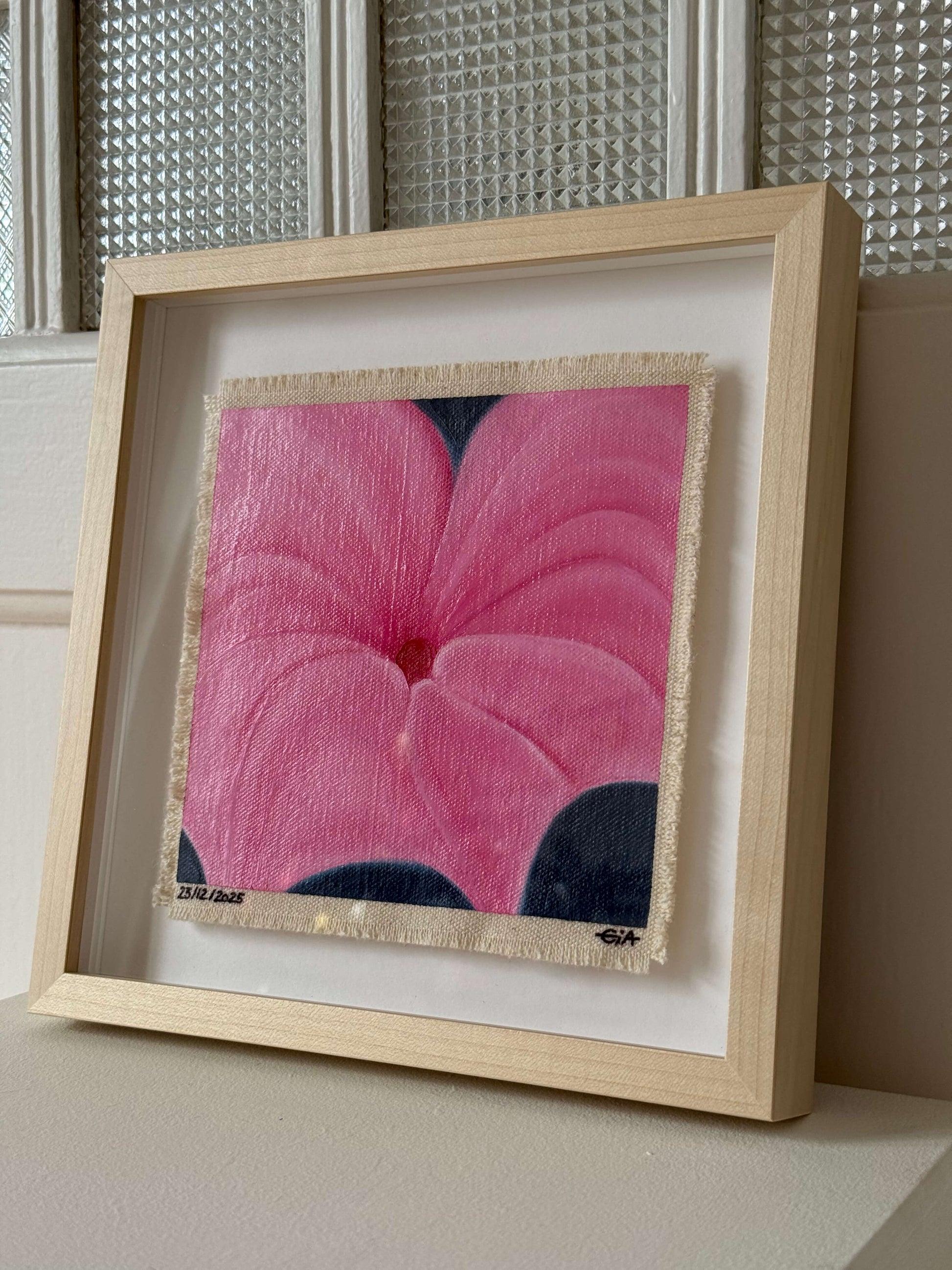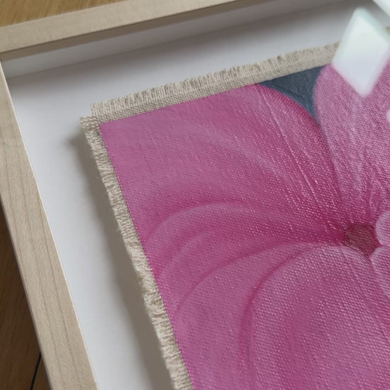 Painted with rich, vibrant oil pastels on raw heavy canvas, each artwork is signed and dated, then professionally framed in a natural maple wood object frame with a floating mount behind white glass. The compact frame includes professional hanging and wall stoppers on the back, and is designed for versatile display on the wall, standing upright on a shelf, or laid flat on a table.
