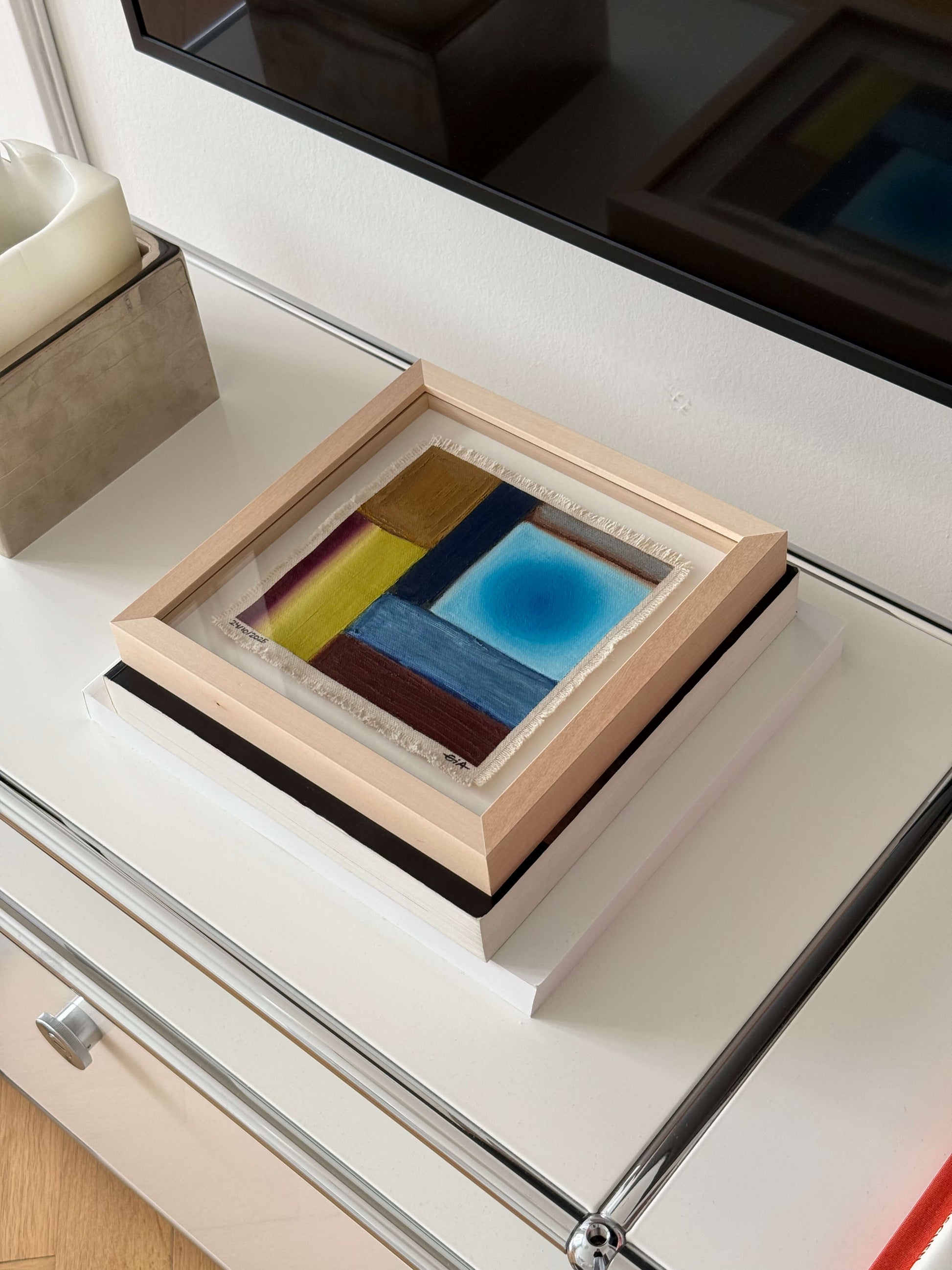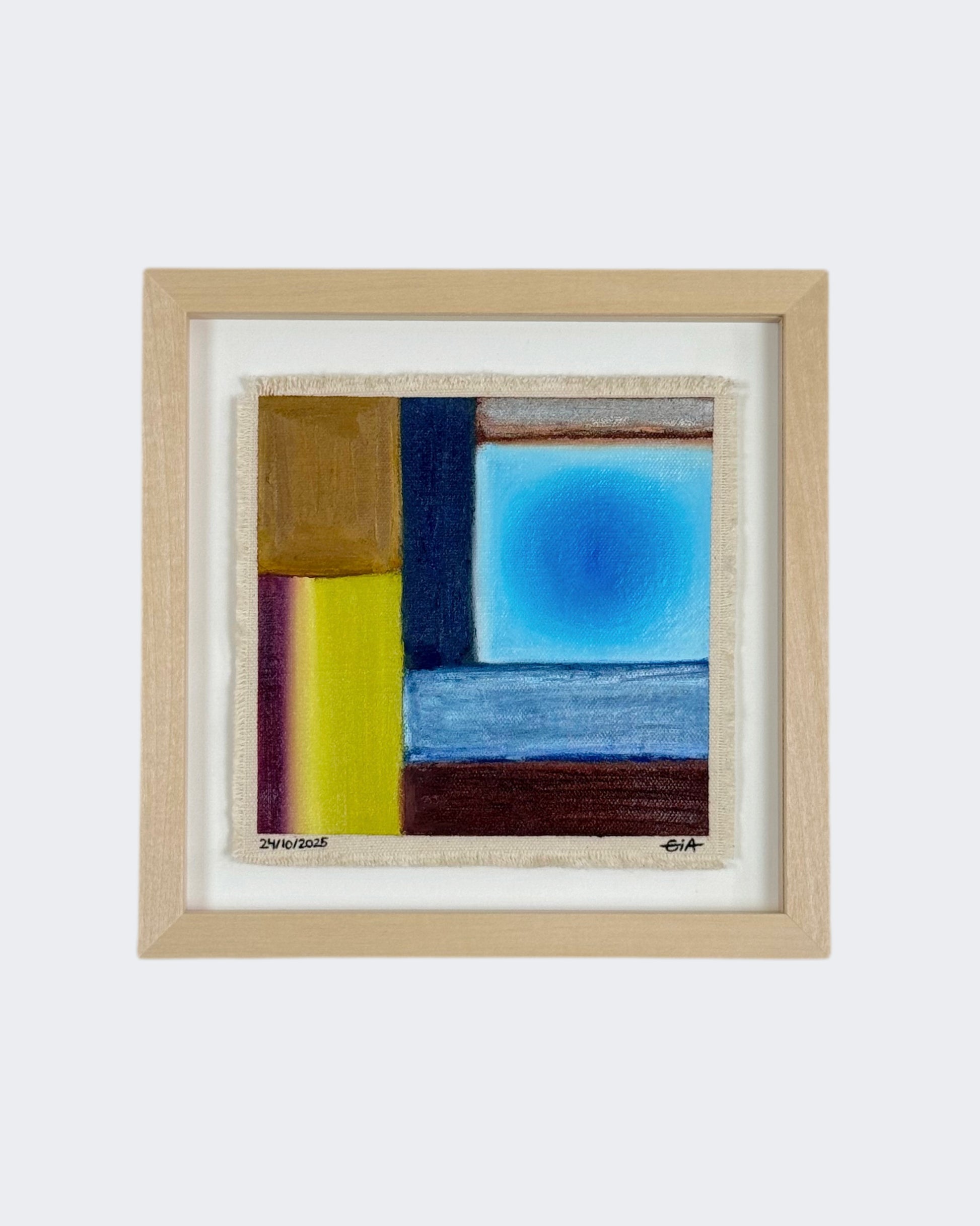 Painted with rich, vibrant oil pastels on raw heavy canvas, each artwork is signed, dated, and professionally framed in a wooden object frame behind glass. The compact frame is designed for versatility, it can be hung on the wall, stood upright on a shelf, or laid flat on a table.