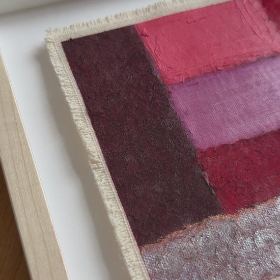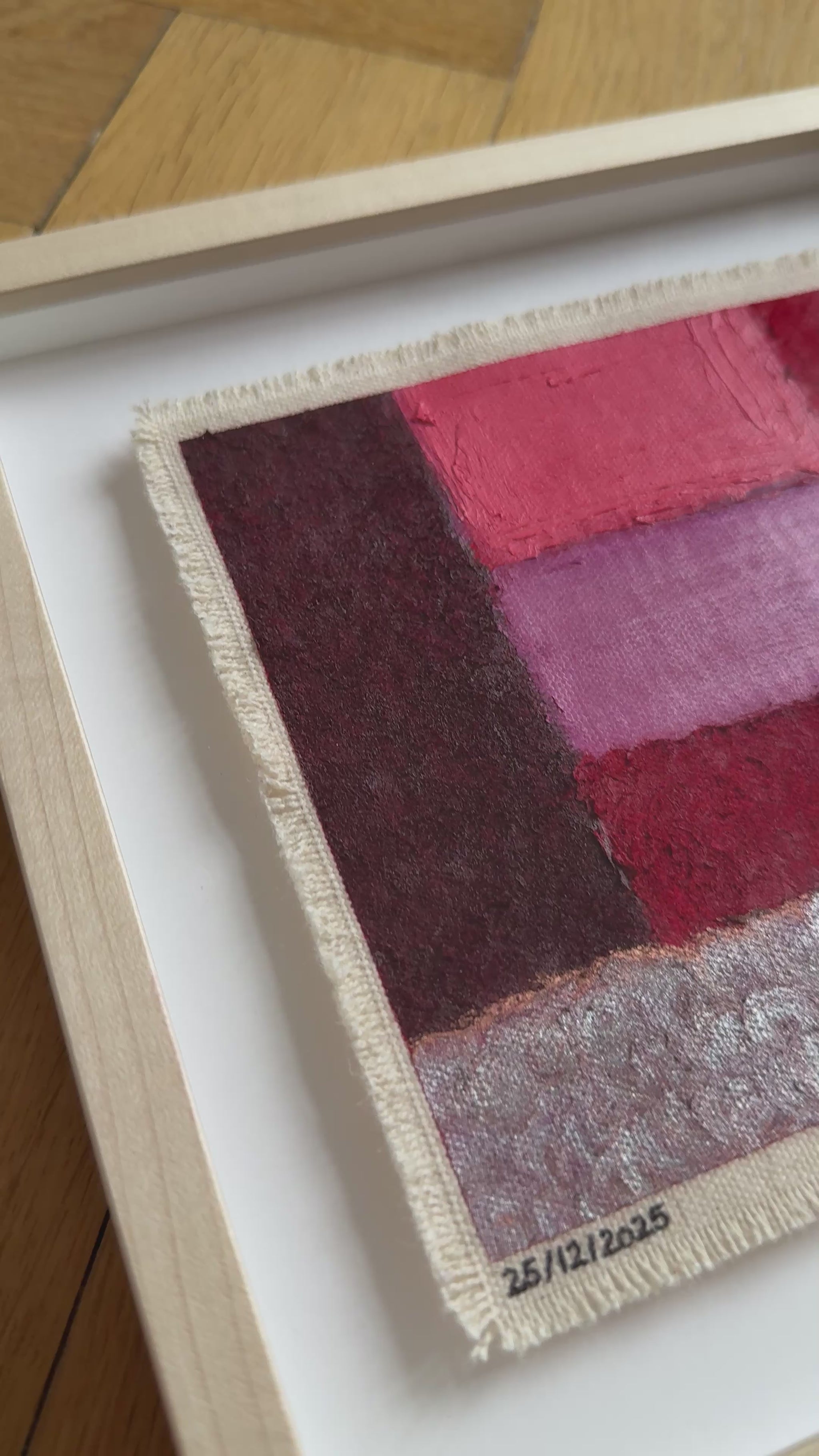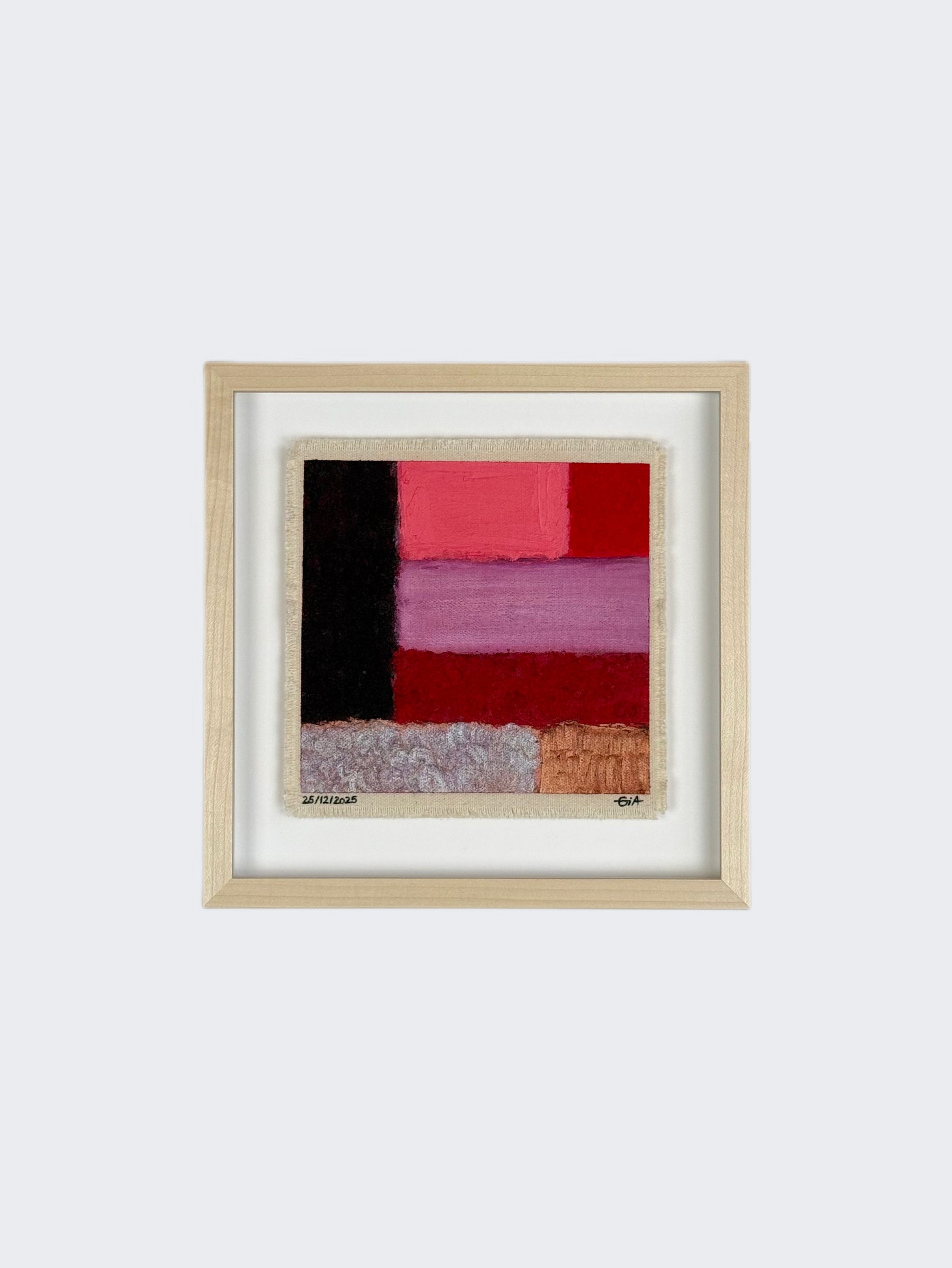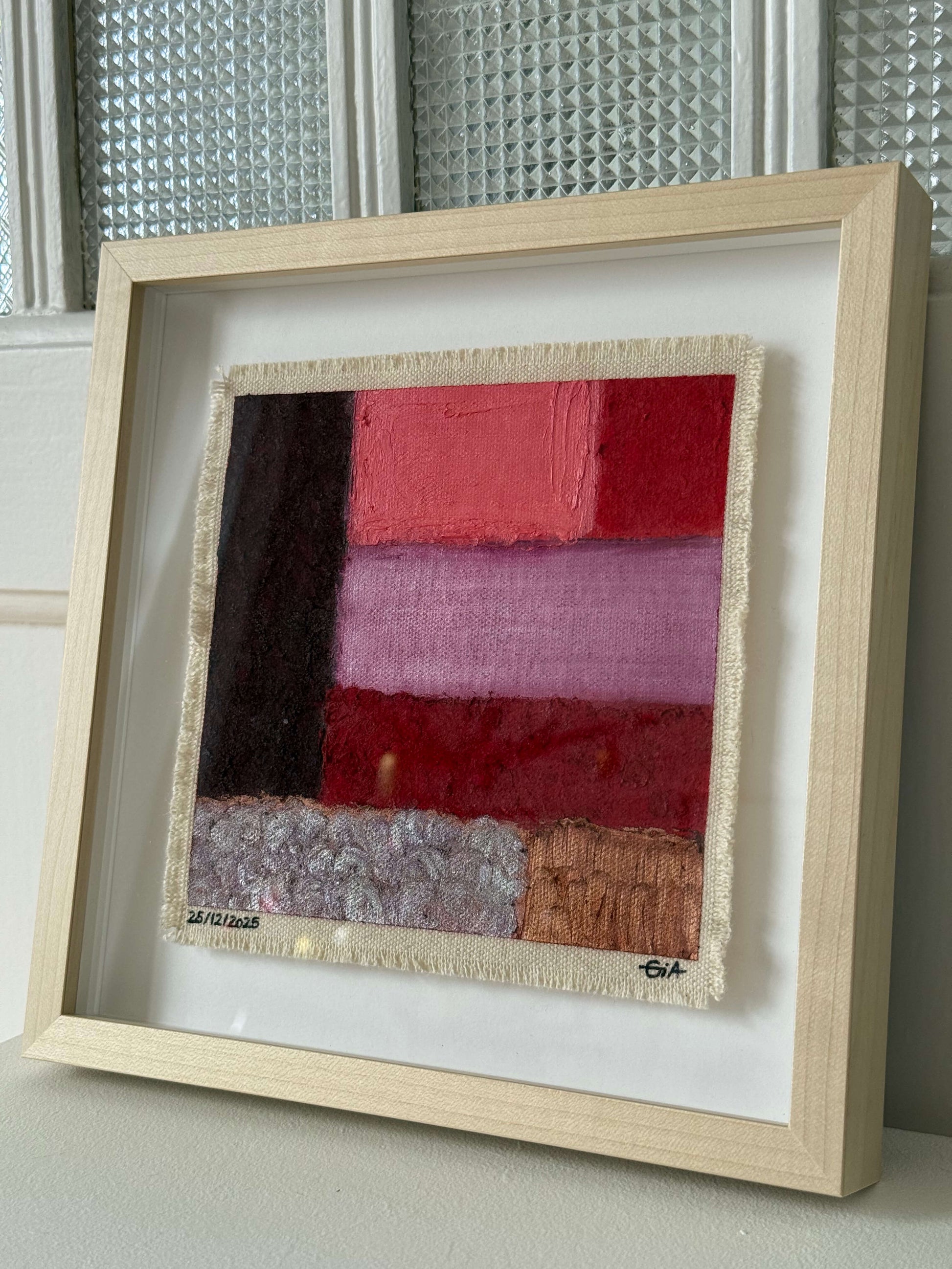 Painted with rich, vibrant oil pastels on raw heavy canvas, each artwork is signed and dated, then professionally framed in a natural maple wood object frame with a floating mount behind white glass. The compact frame includes professional hanging and wall stoppers on the back, and is designed for versatile display on the wall, standing upright on a shelf, or laid flat on a table.