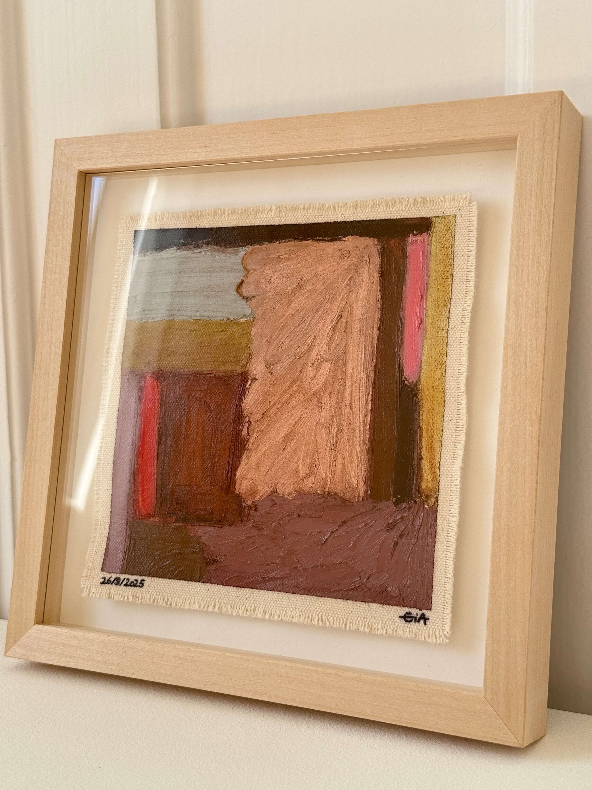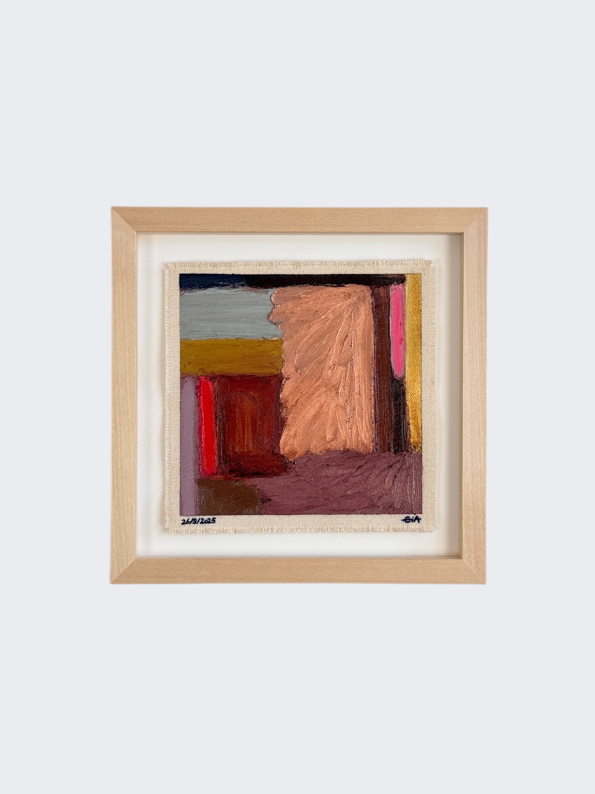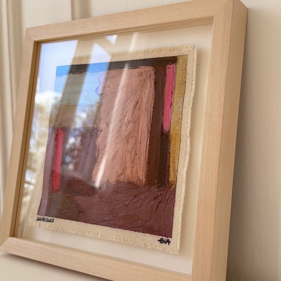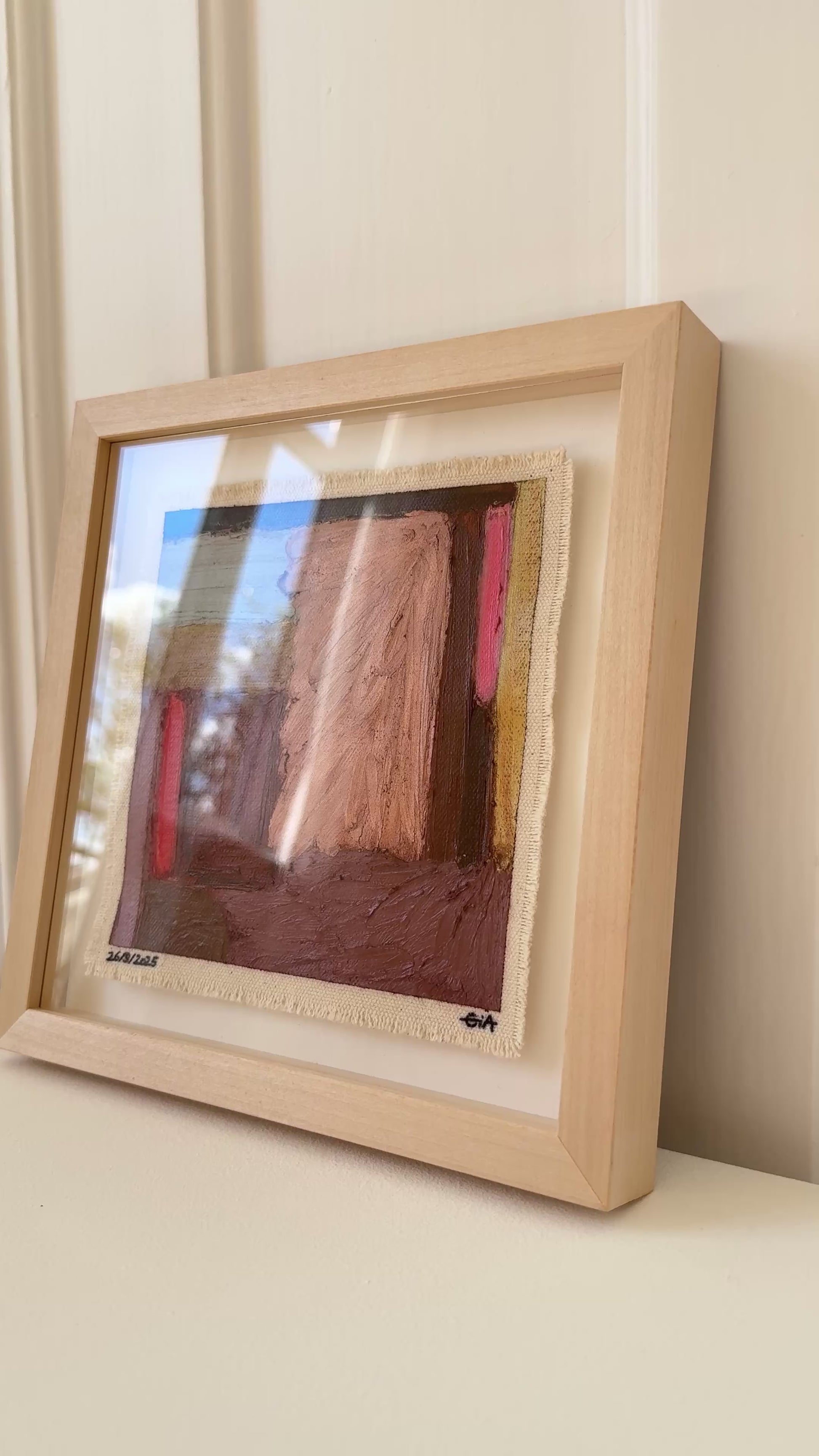 Painted with rich, vibrant oil pastels on raw heavy canvas, each artwork is signed, dated, and professionally framed in a wooden object frame behind glass. The compact frame is designed for versatility, it can be hung on the wall, stood upright on a shelf, or laid flat on a table.
