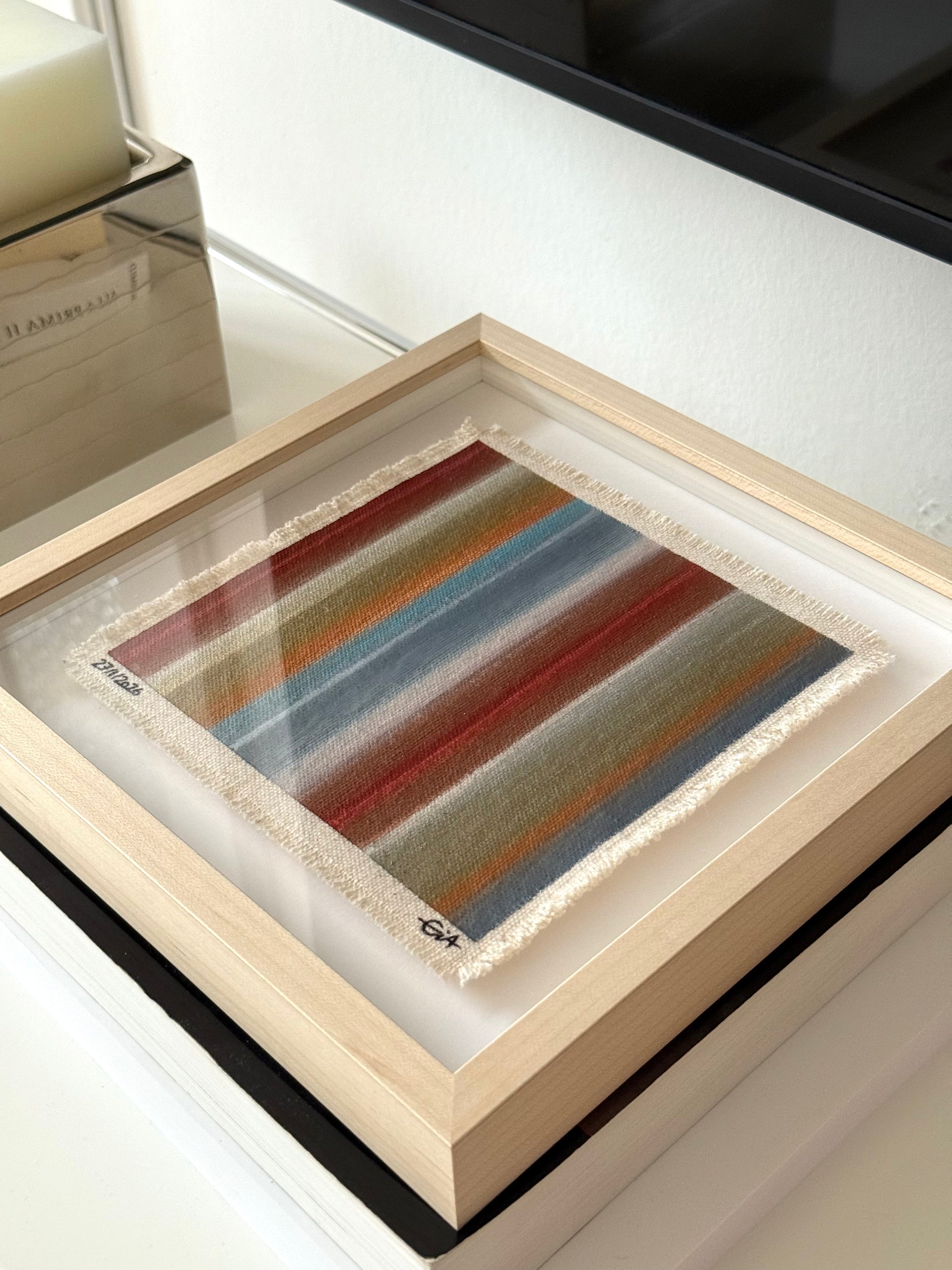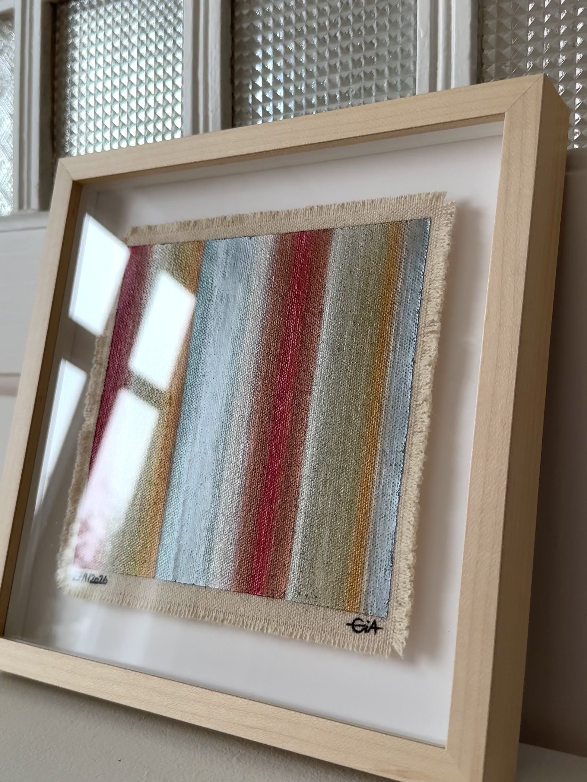 Painted with rich, vibrant oil pastels on raw heavy canvas, each artwork is signed and dated, then professionally framed in a natural maple wood object frame with a floating mount behind white glass. The compact frame includes professional hanging and wall stoppers on the back, and is designed for versatile display on the wall, standing upright on a shelf, or laid flat on a table.