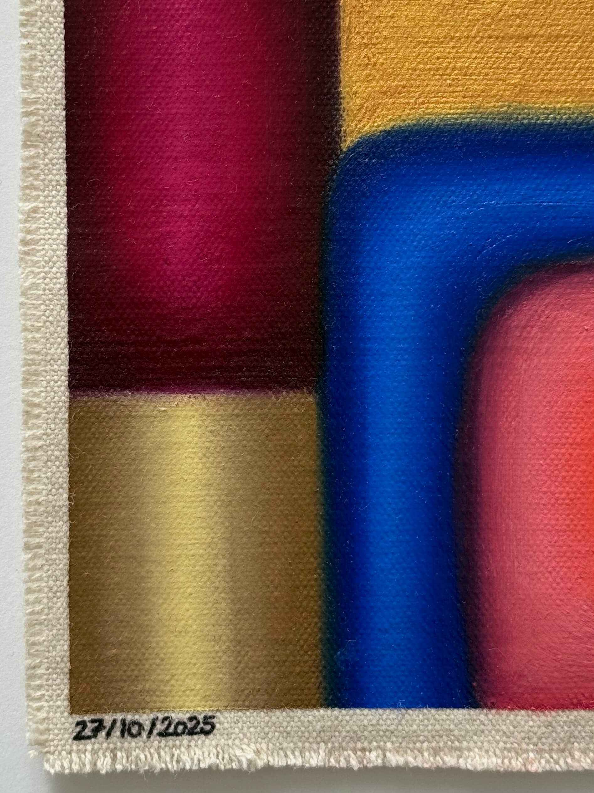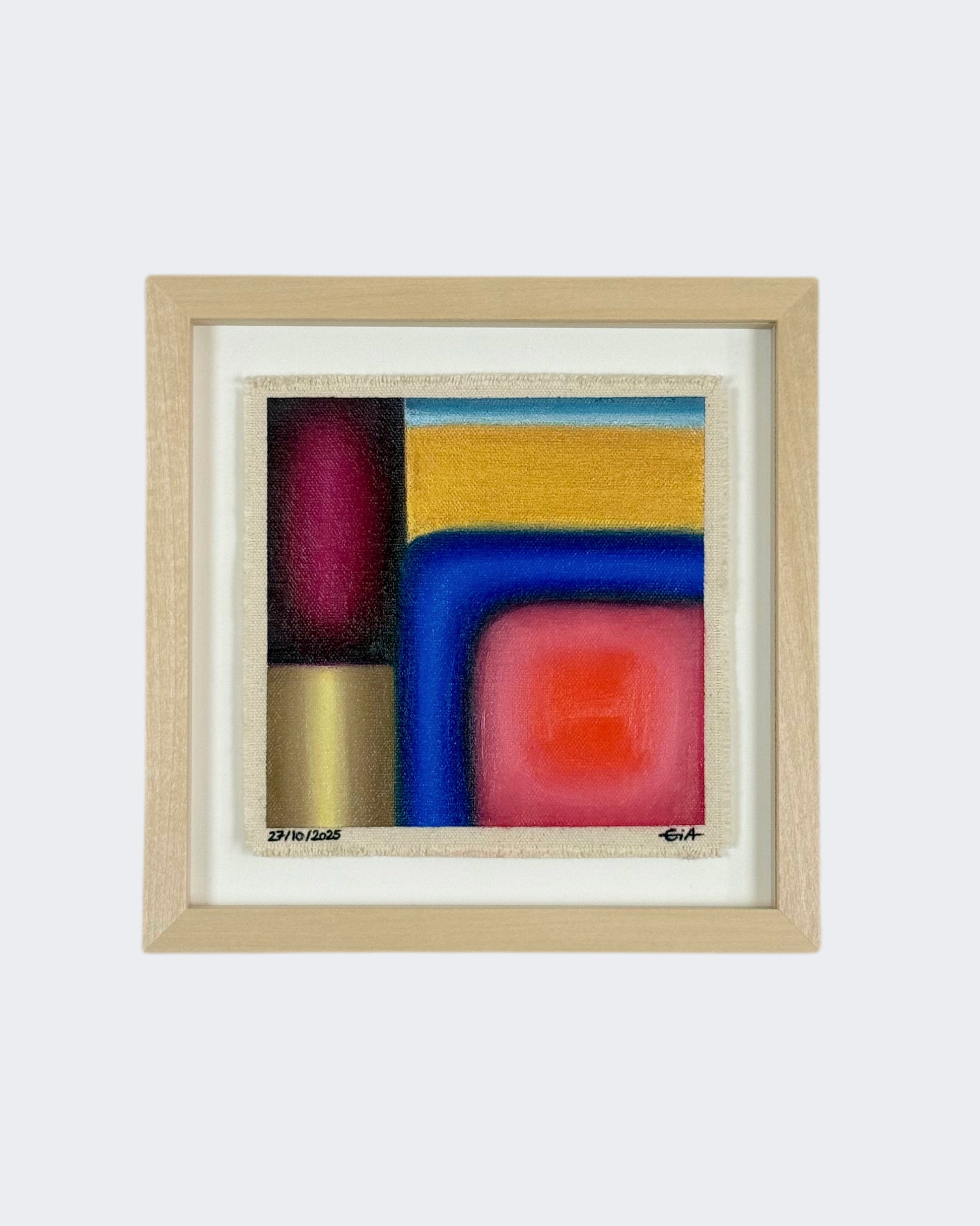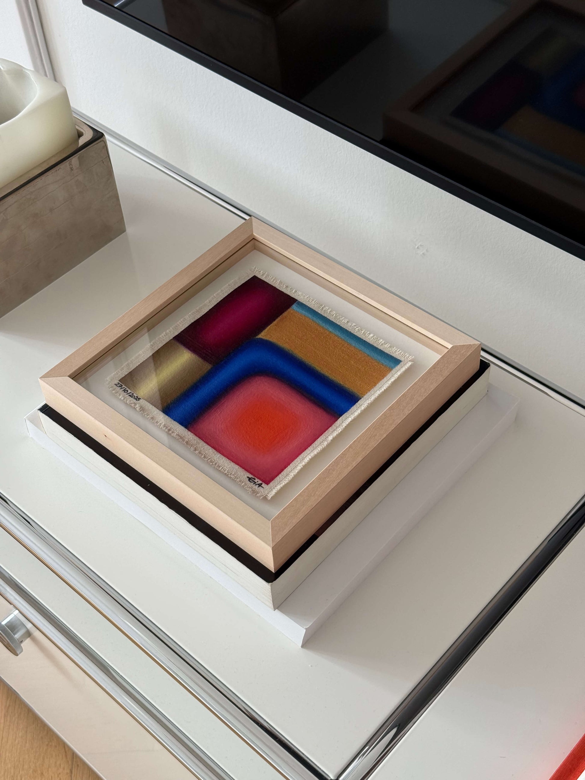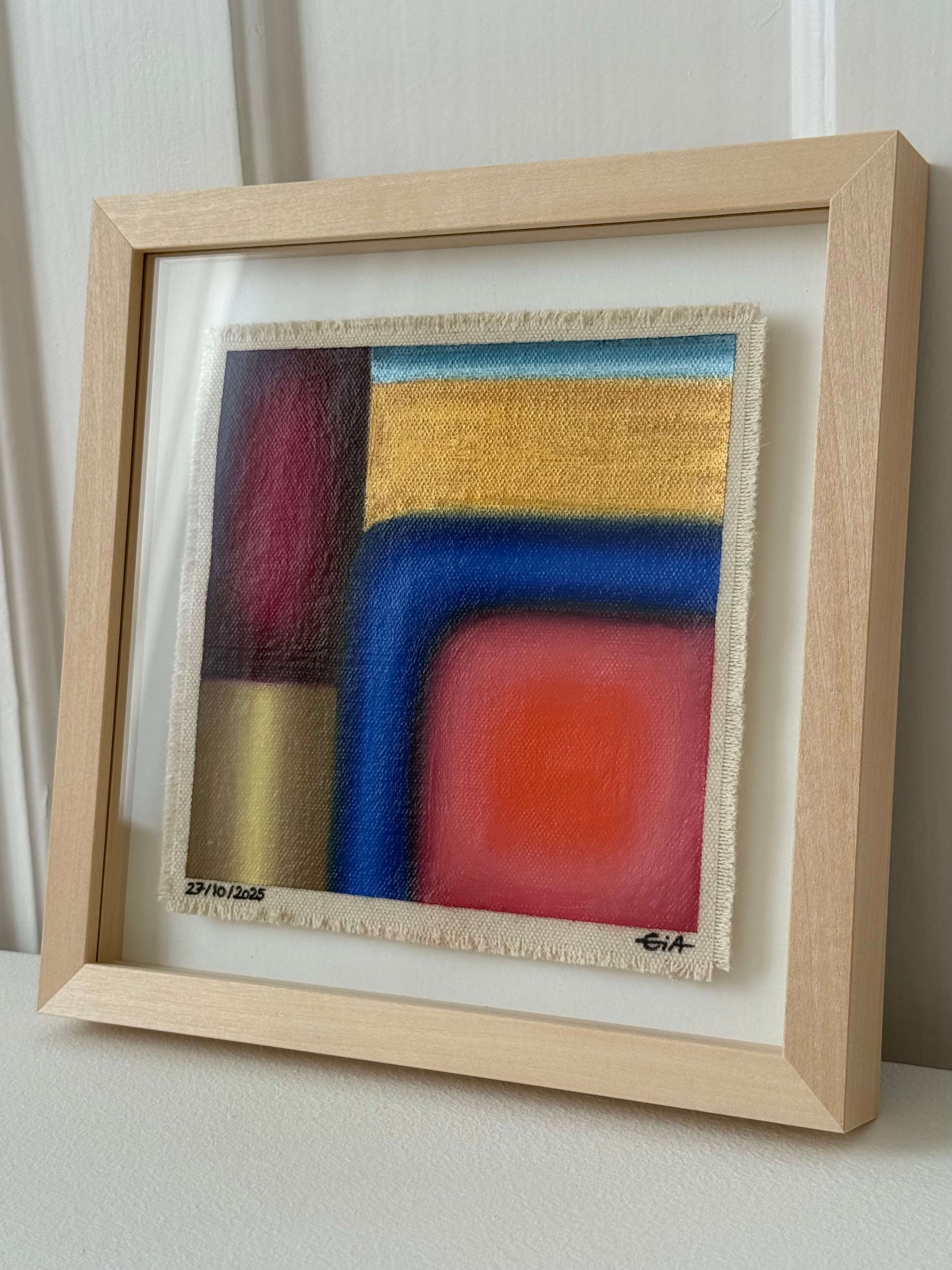 Painted with rich, vibrant oil pastels on raw heavy canvas, each artwork is signed, dated, and professionally framed in a wooden object frame behind glass. The compact frame is designed for versatility, it can be hung on the wall, stood upright on a shelf, or laid flat on a table.