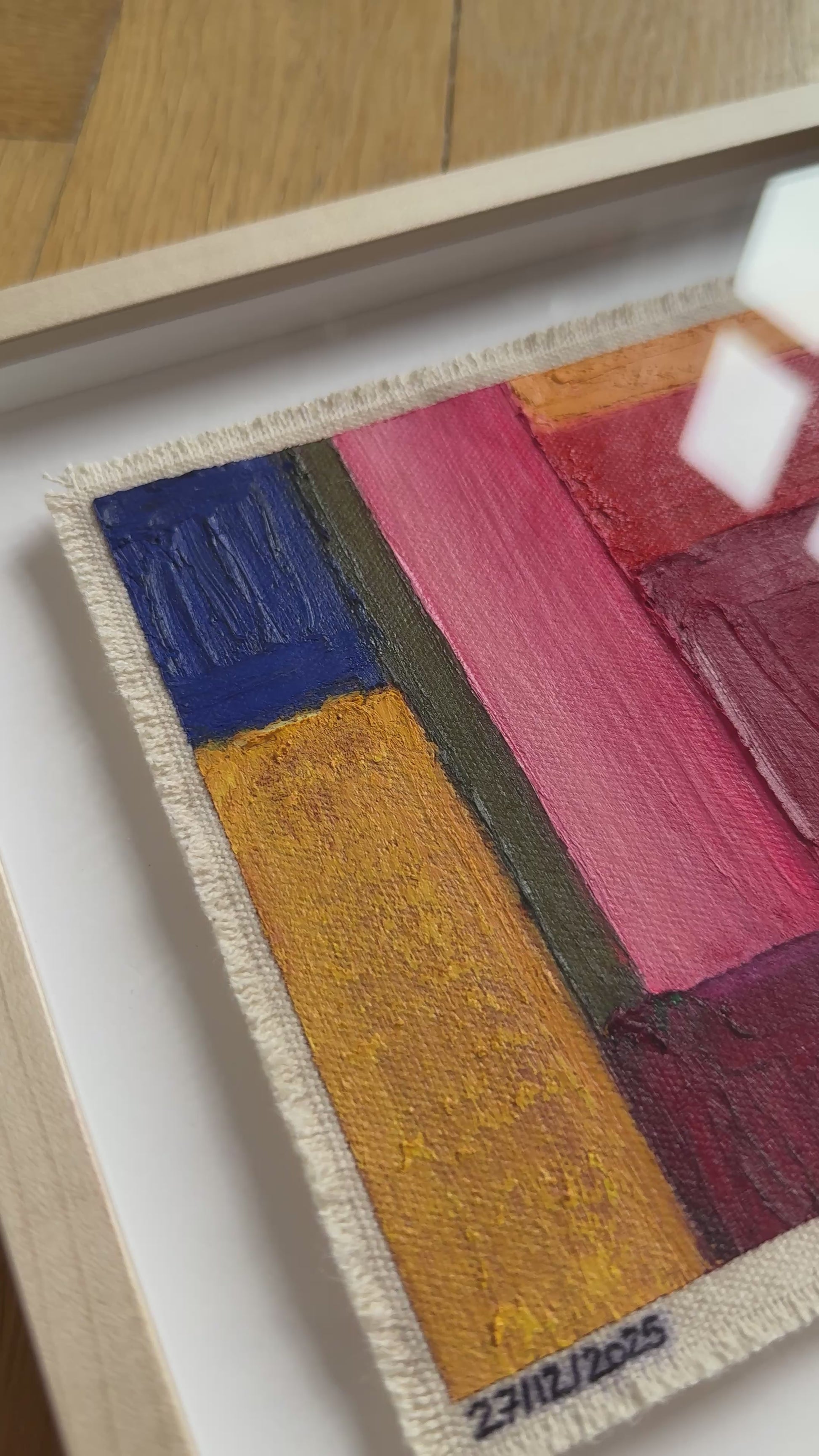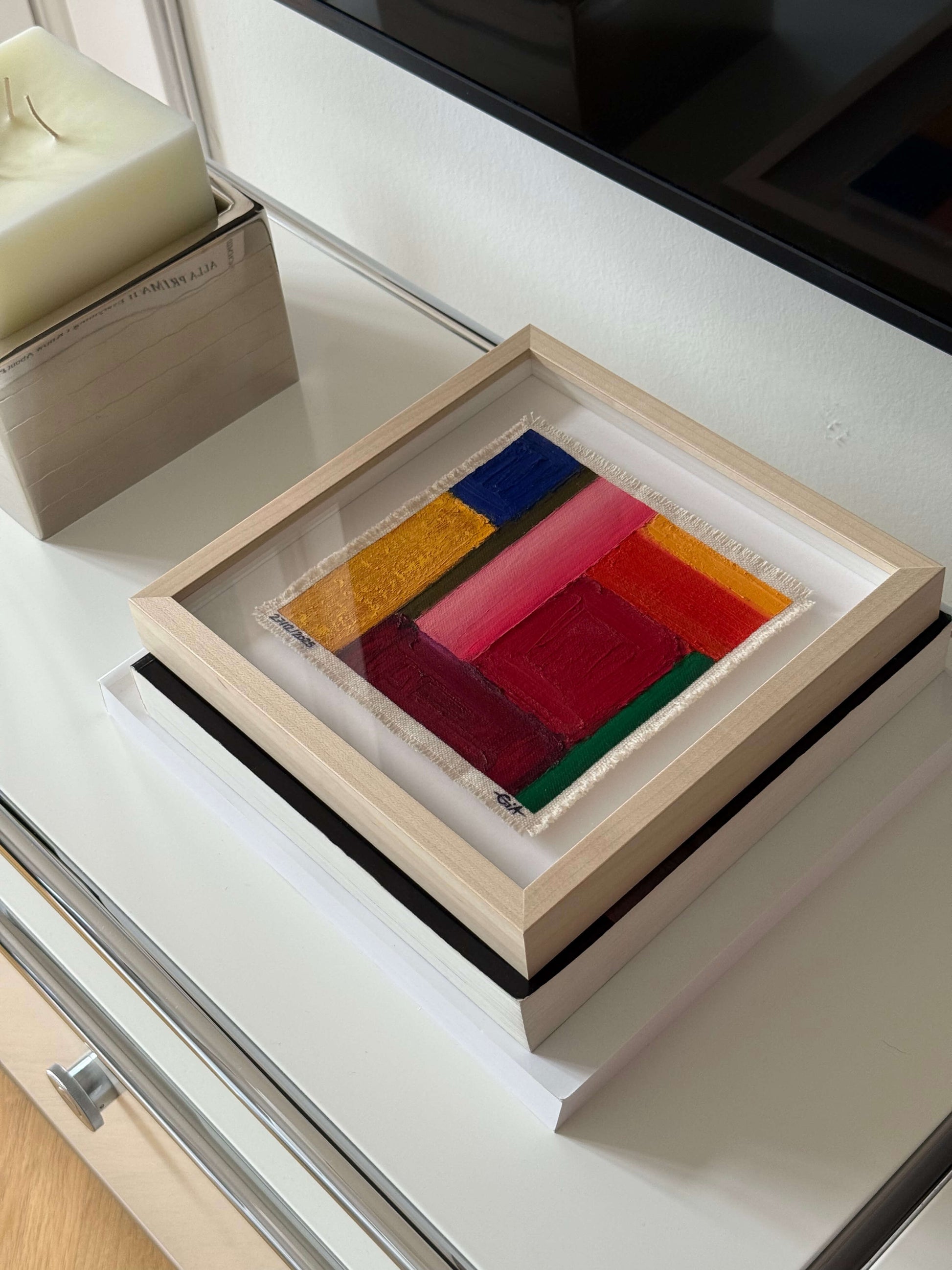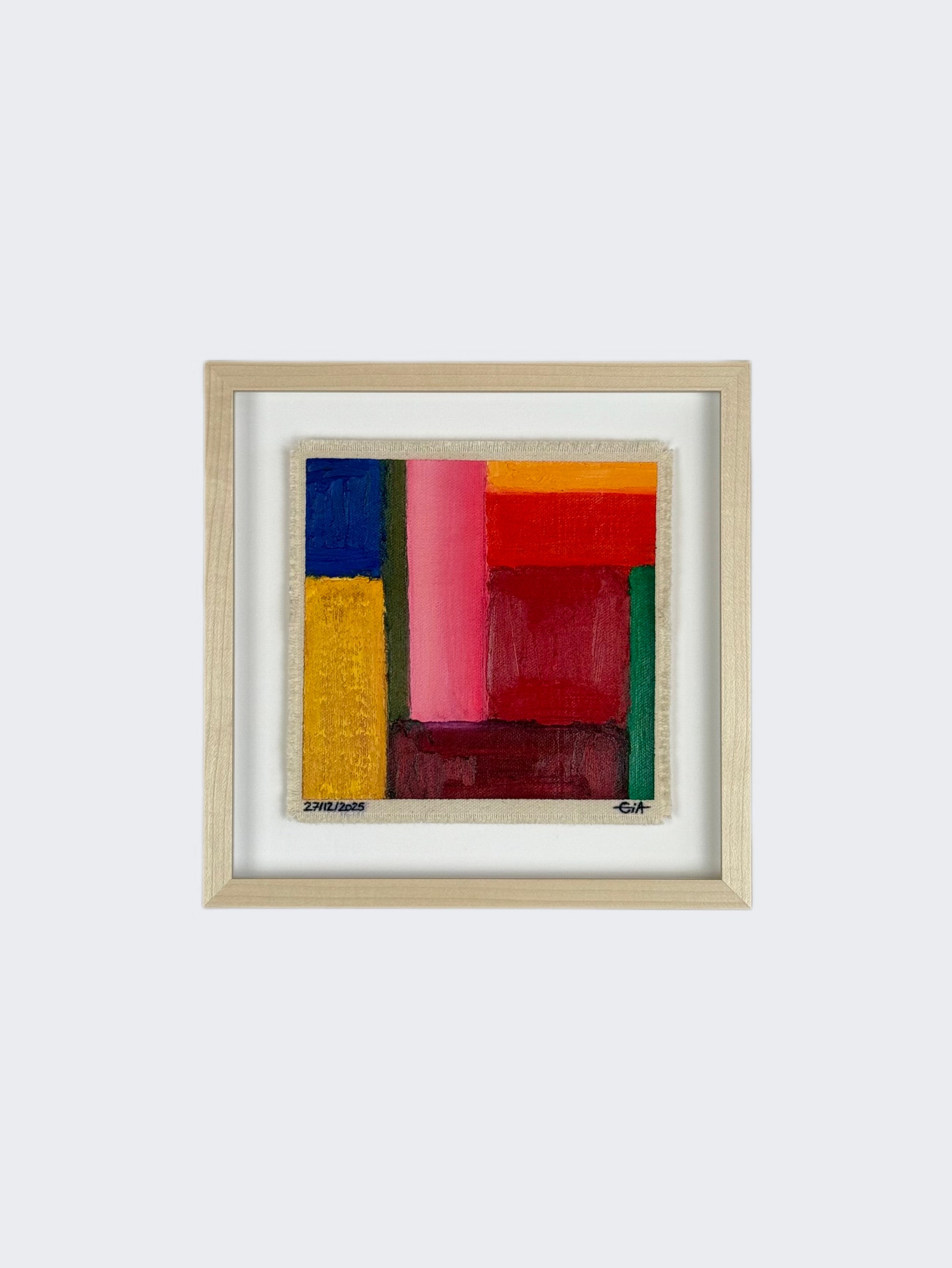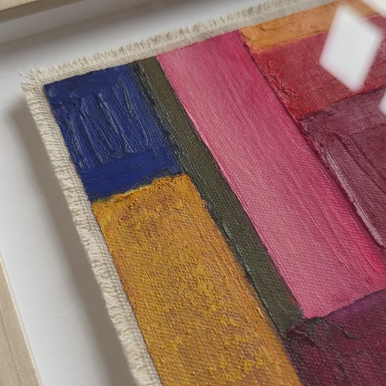 Painted with rich, vibrant oil pastels on raw heavy canvas, each artwork is signed and dated, then professionally framed in a natural maple wood object frame with a floating mount behind white glass. The compact frame includes professional hanging and wall stoppers on the back, and is designed for versatile display on the wall, standing upright on a shelf, or laid flat on a table.