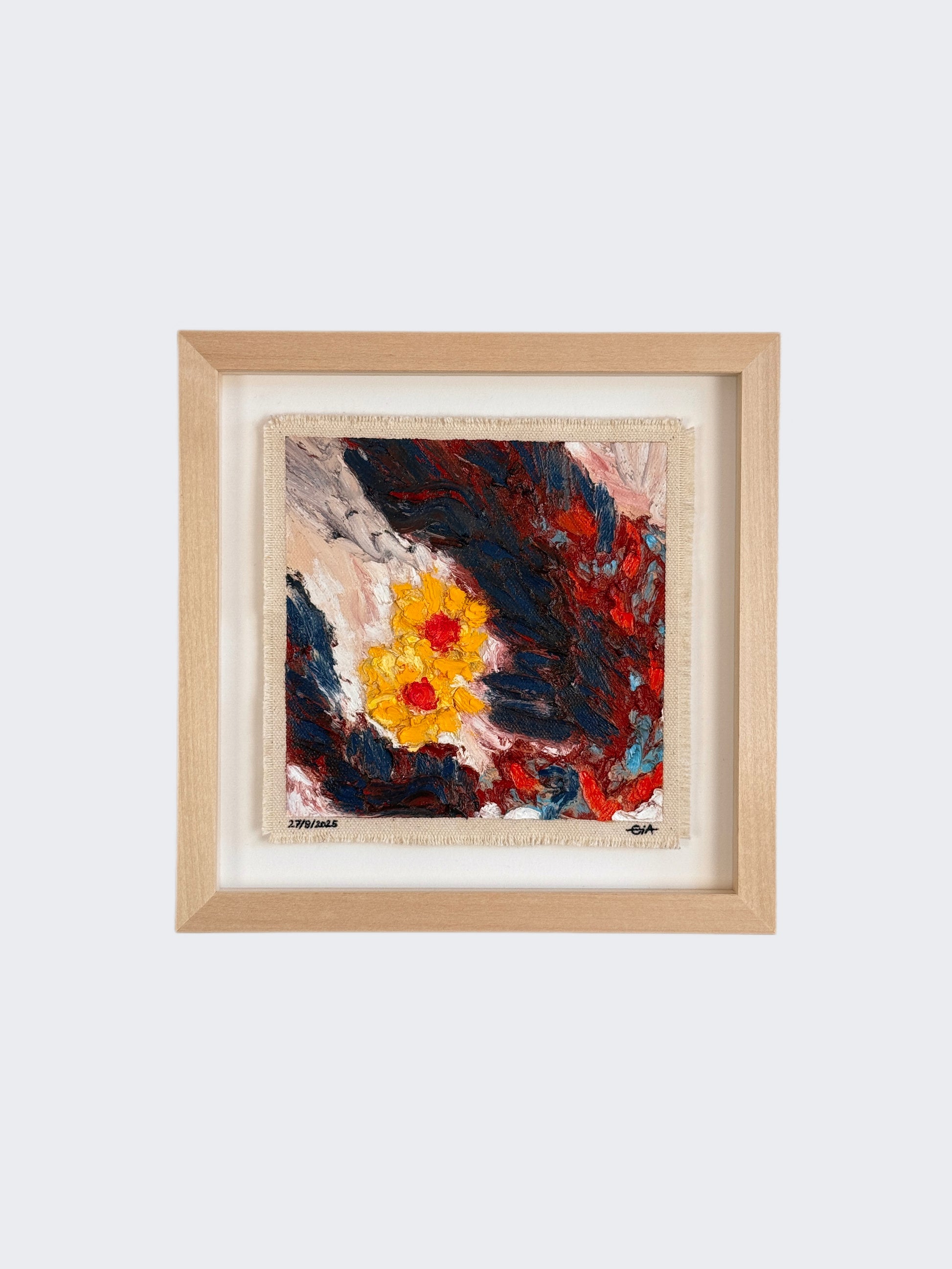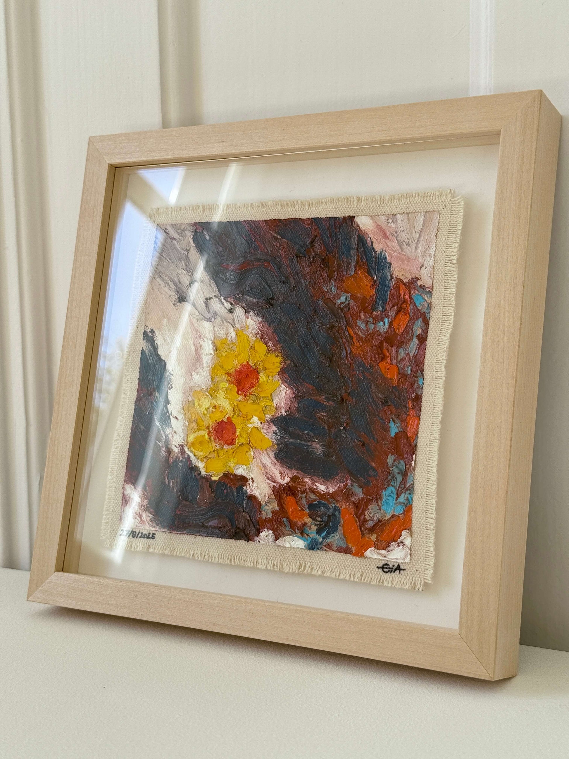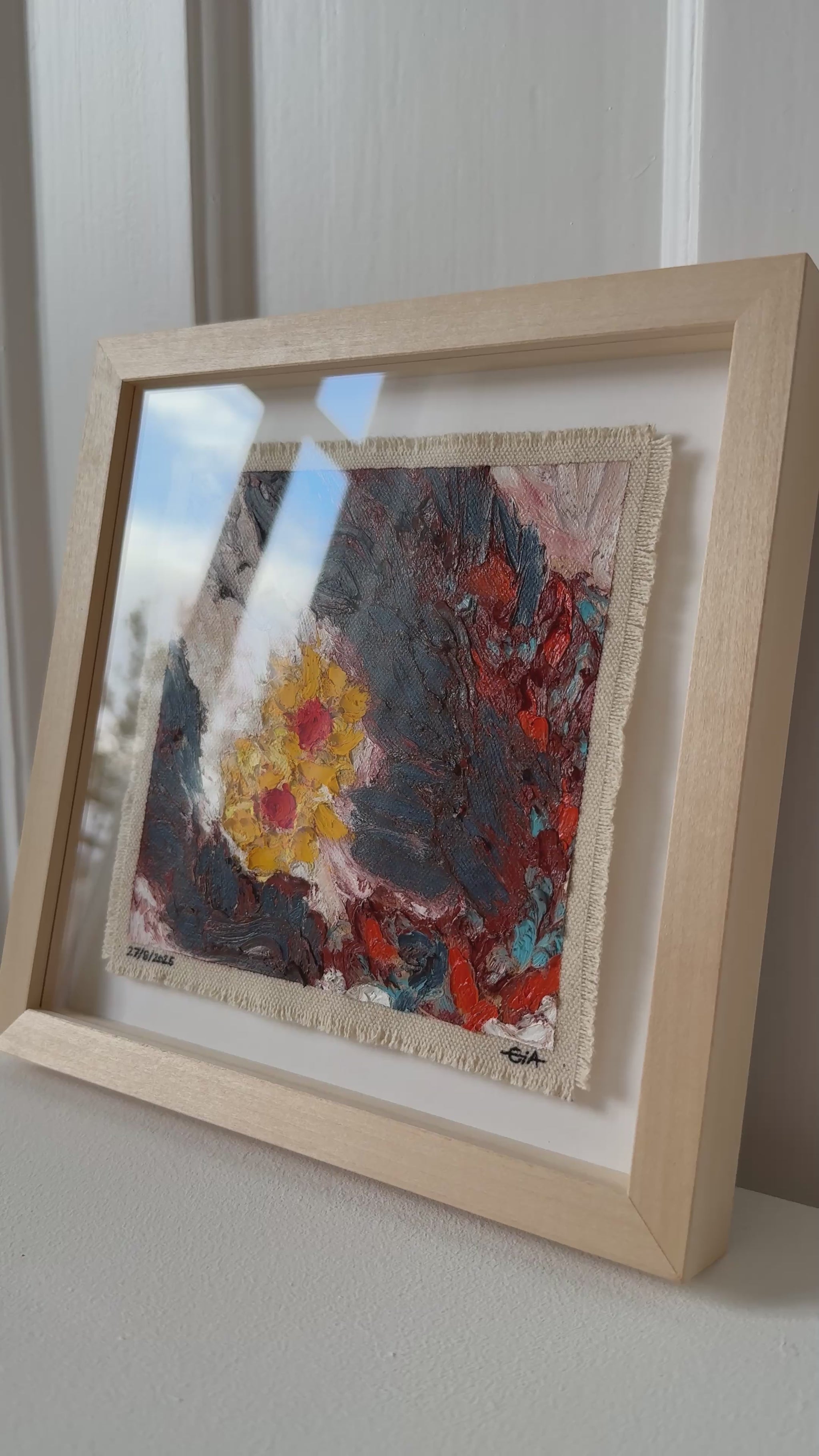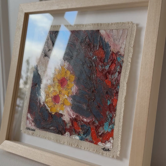 Painted with rich, vibrant oil pastels on raw heavy canvas, each artwork is signed, dated, and professionally framed in a wooden object frame behind glass. The compact frame is designed for versatility, it can be hung on the wall, stood upright on a shelf, or laid flat on a table.