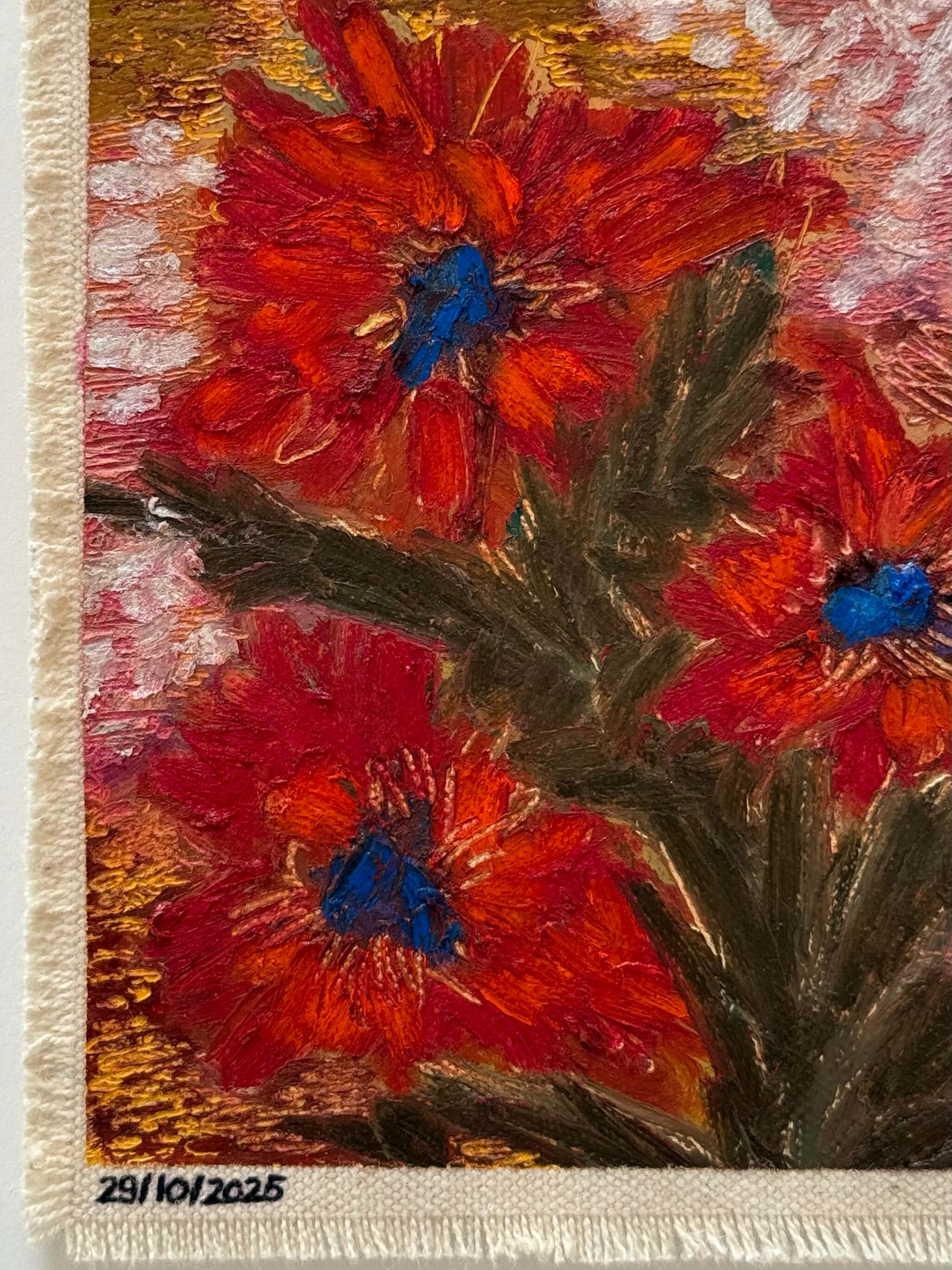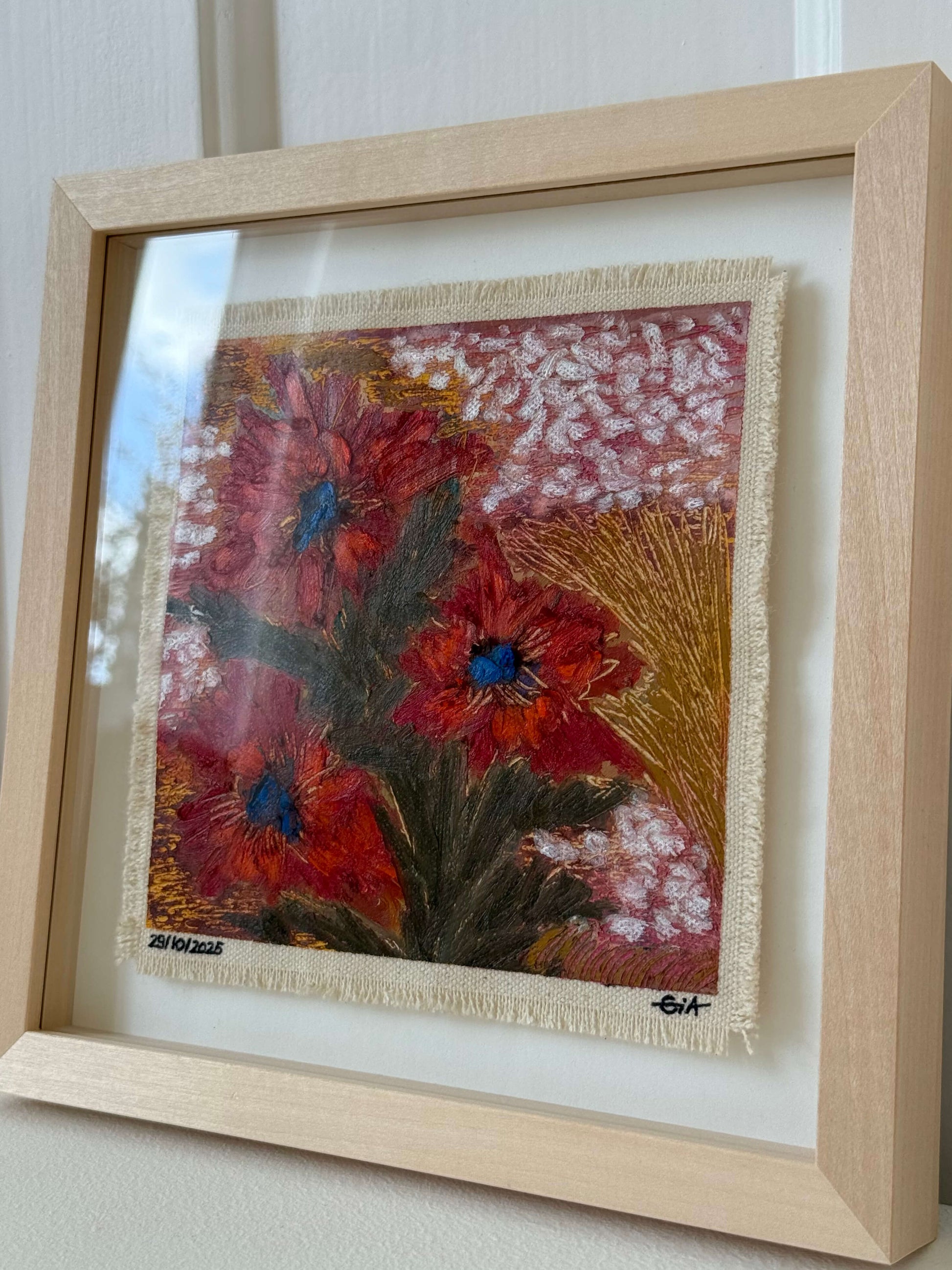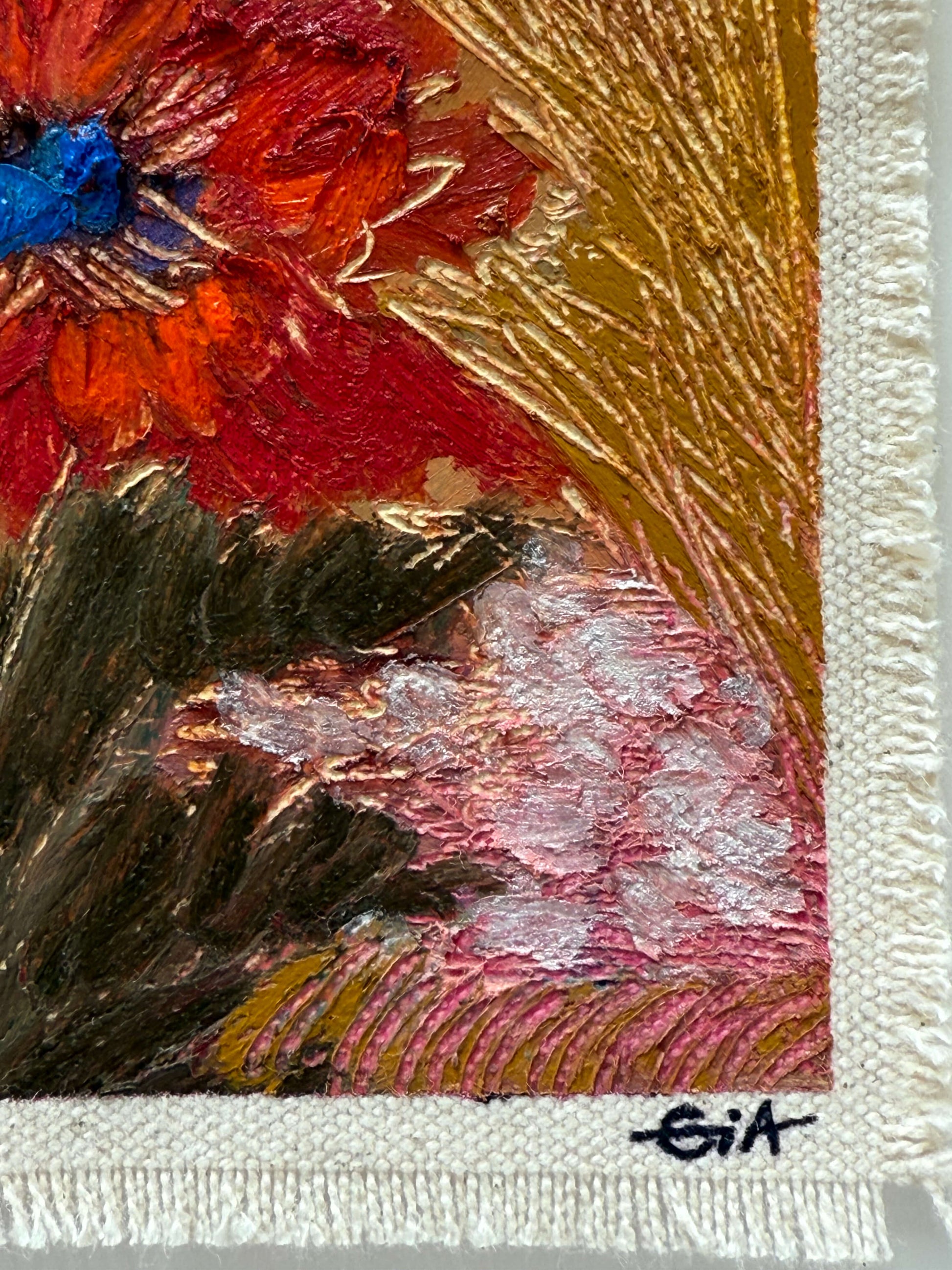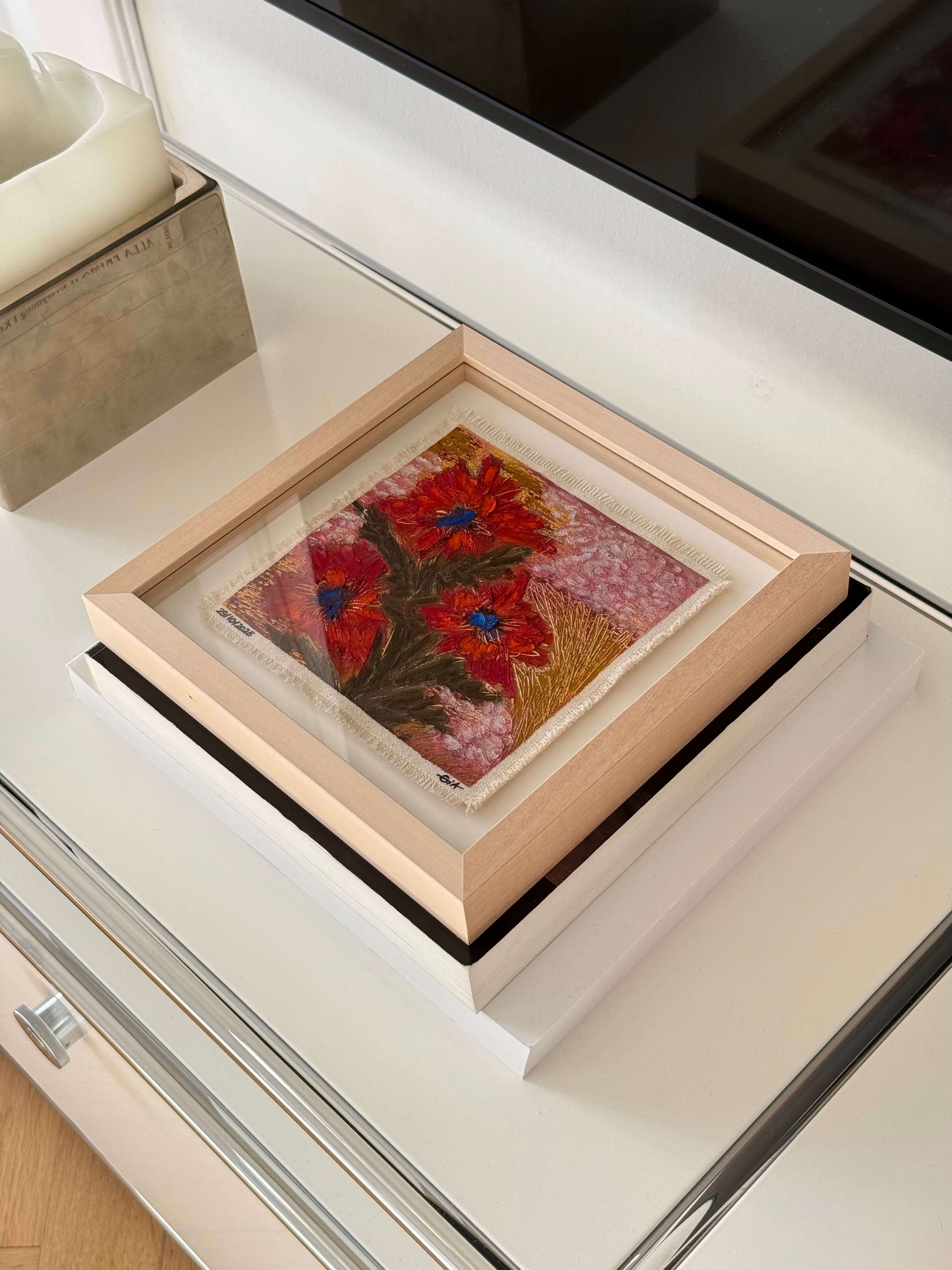 Painted with rich, vibrant oil pastels on raw heavy canvas, each artwork is signed, dated, and professionally framed in a wooden object frame behind glass. The compact frame is designed for versatility, it can be hung on the wall, stood upright on a shelf, or laid flat on a table.