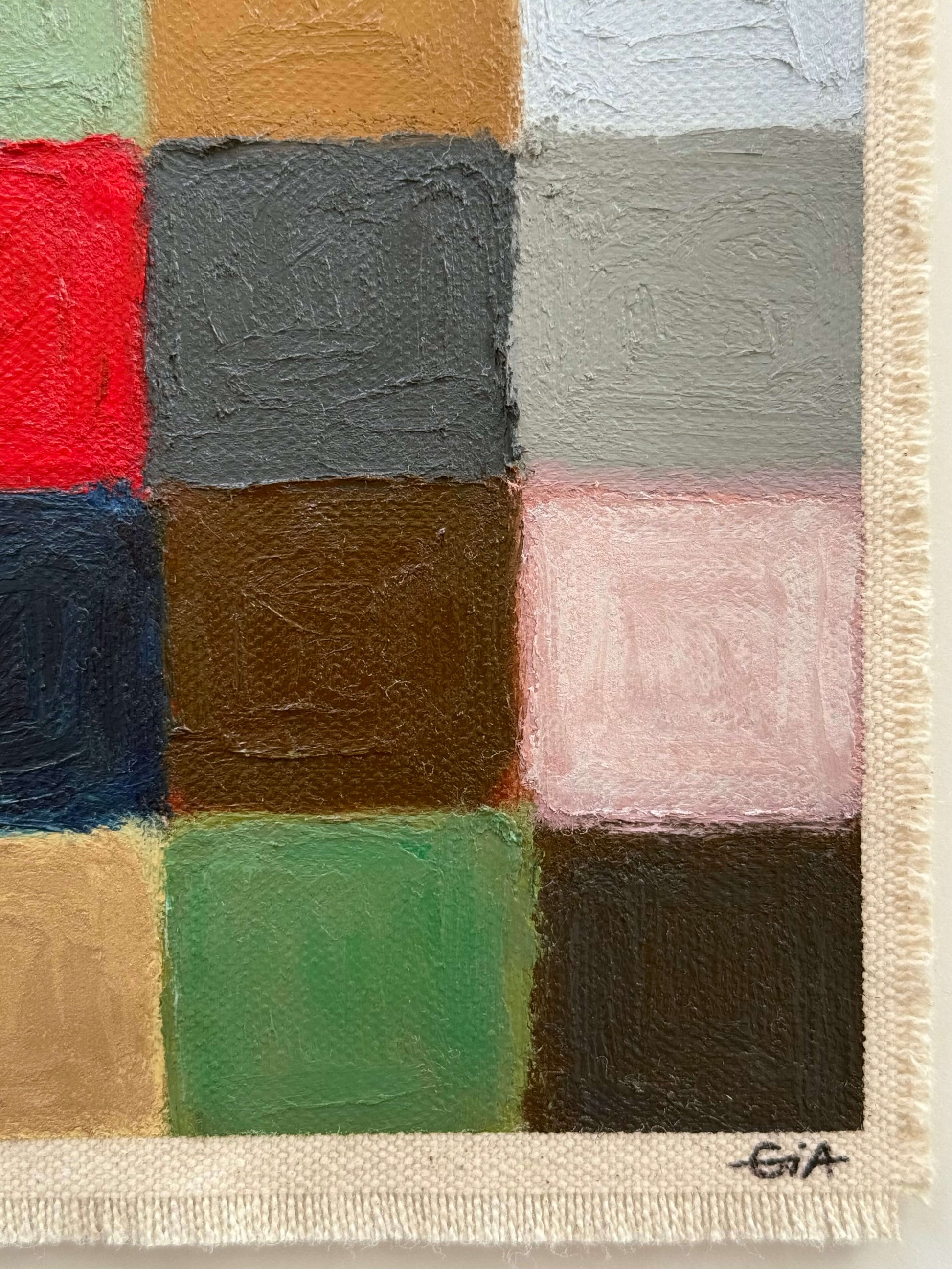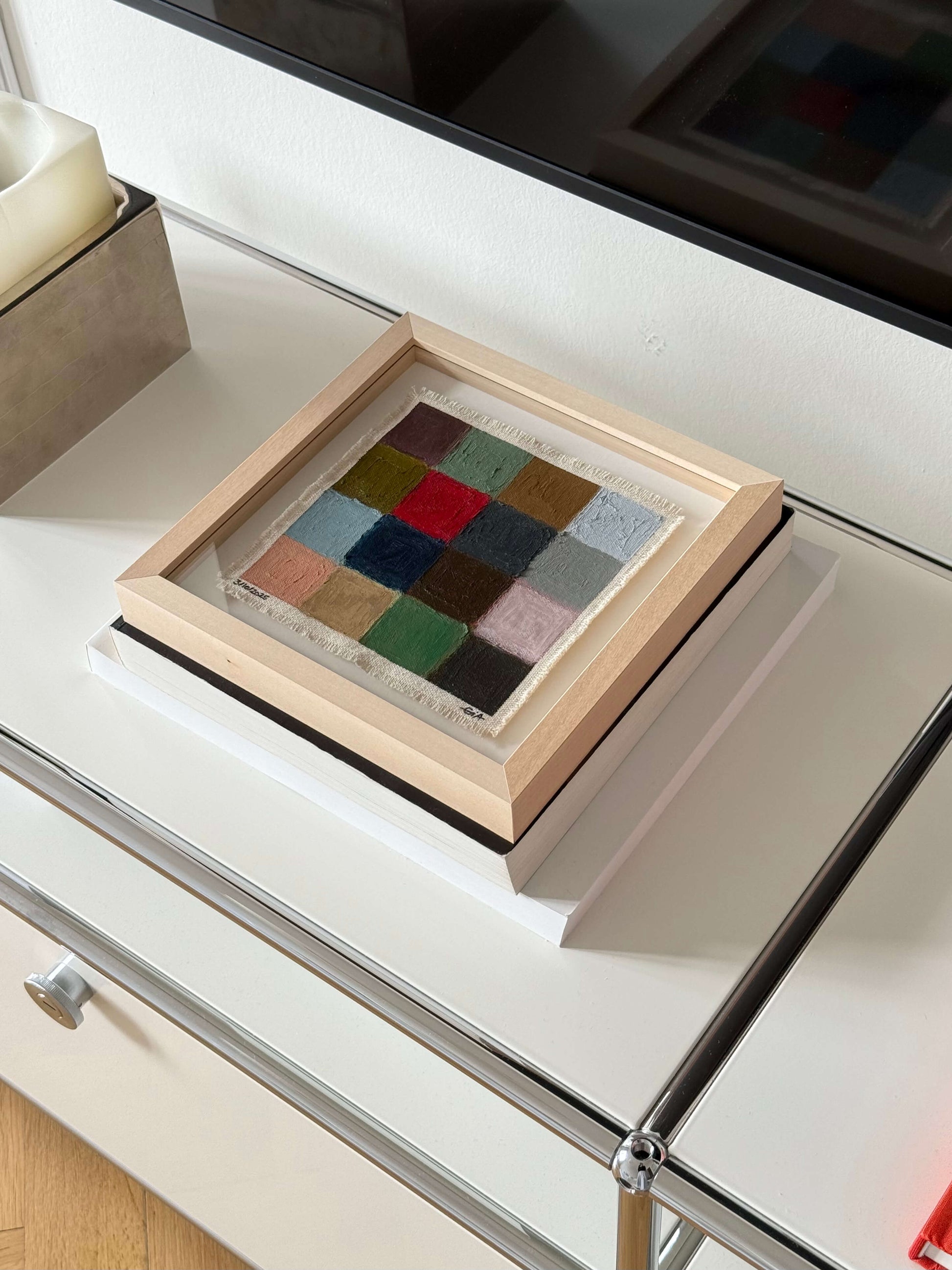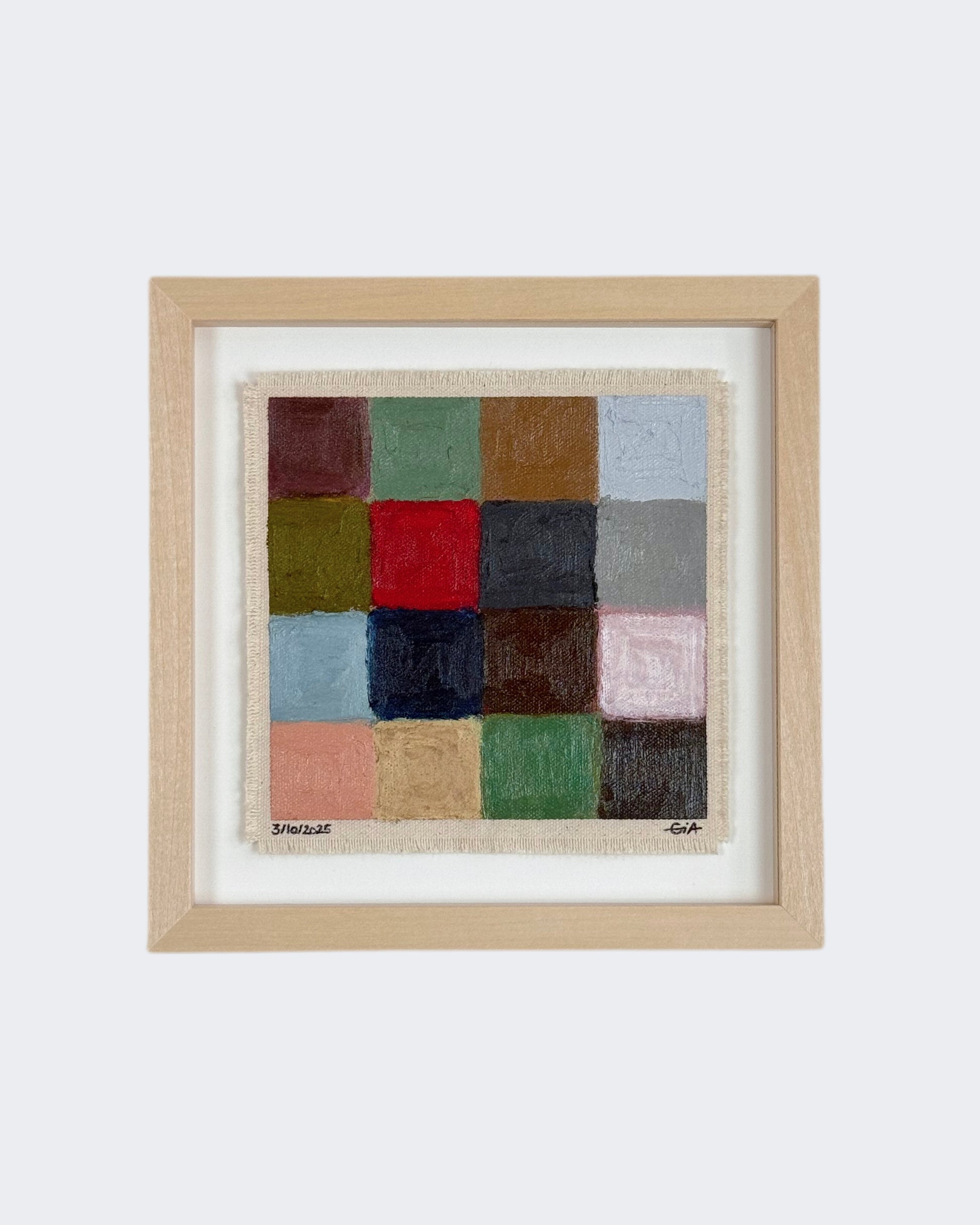 Painted with rich, vibrant oil pastels on raw heavy canvas, each artwork is signed, dated, and professionally framed in a wooden object frame behind glass. The compact frame is designed for versatility, it can be hung on the wall, stood upright on a shelf, or laid flat on a table.