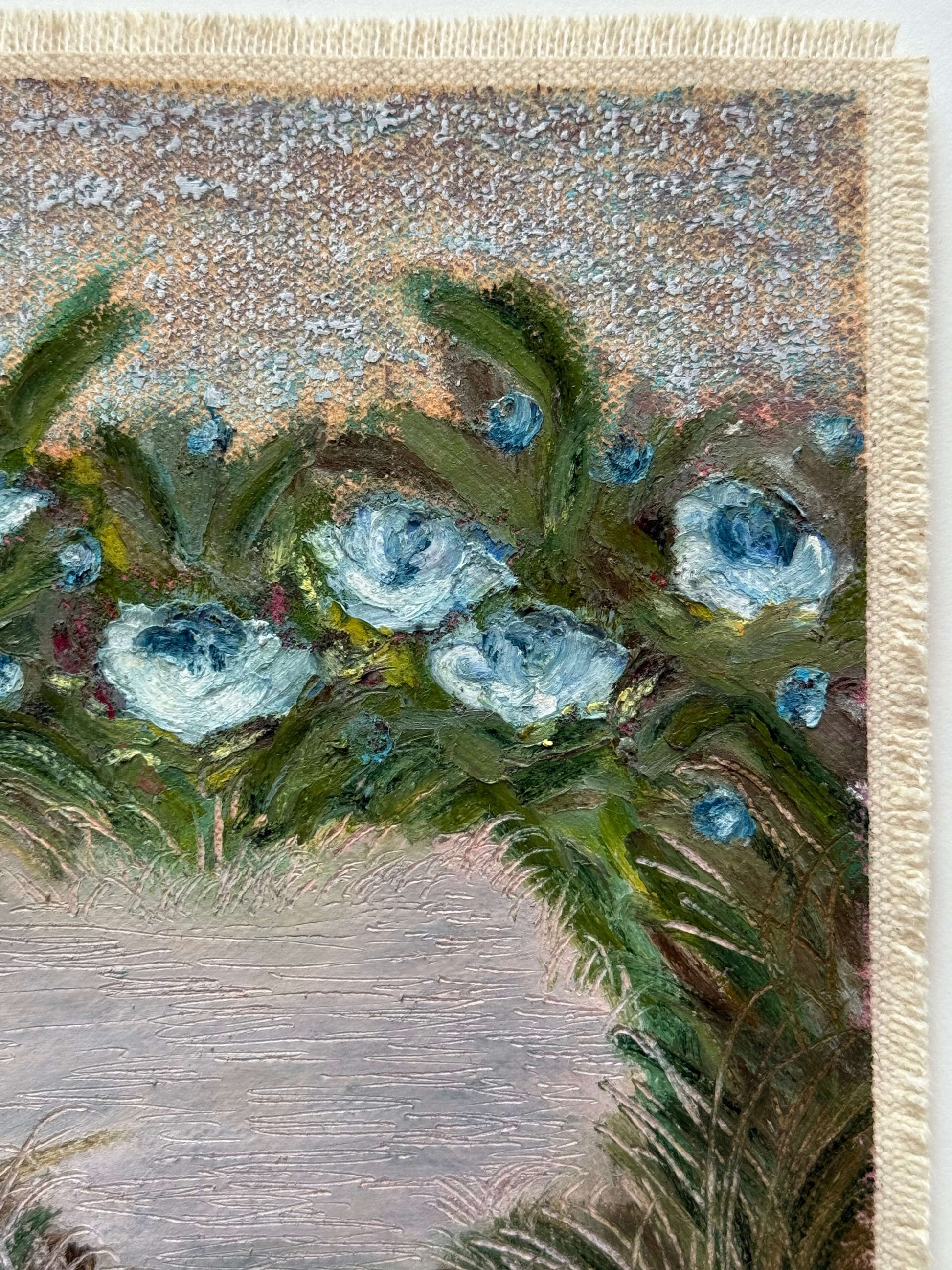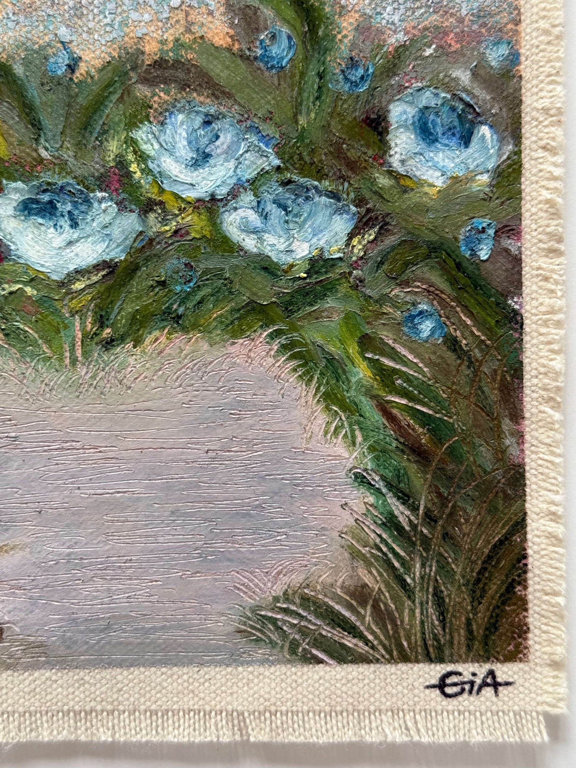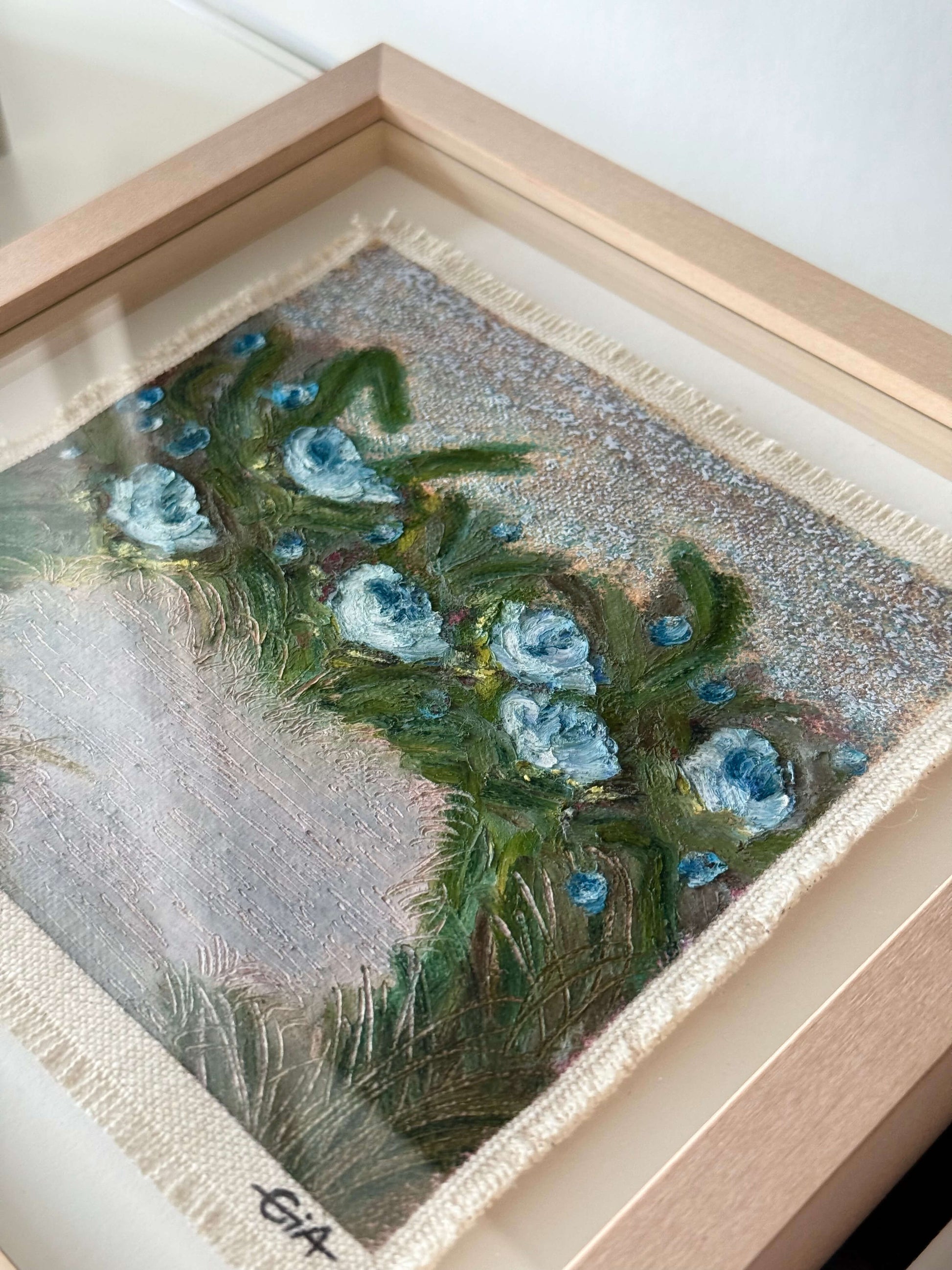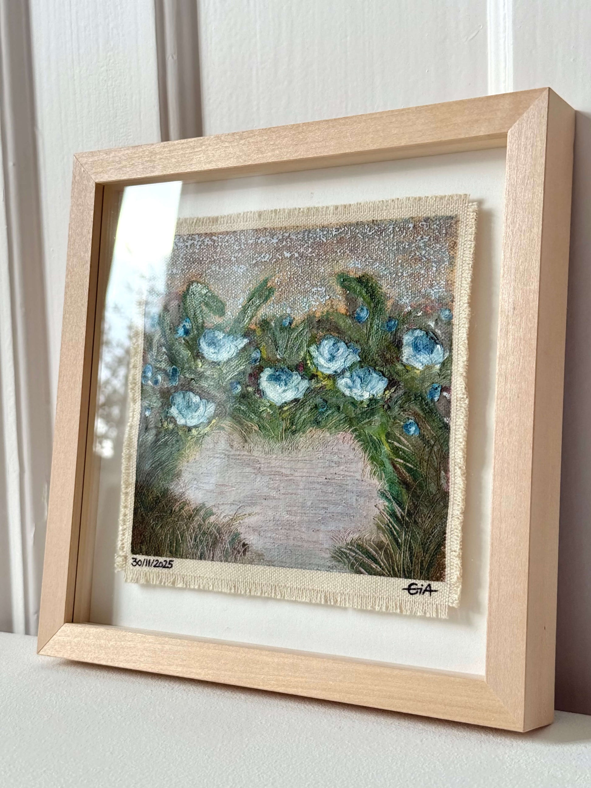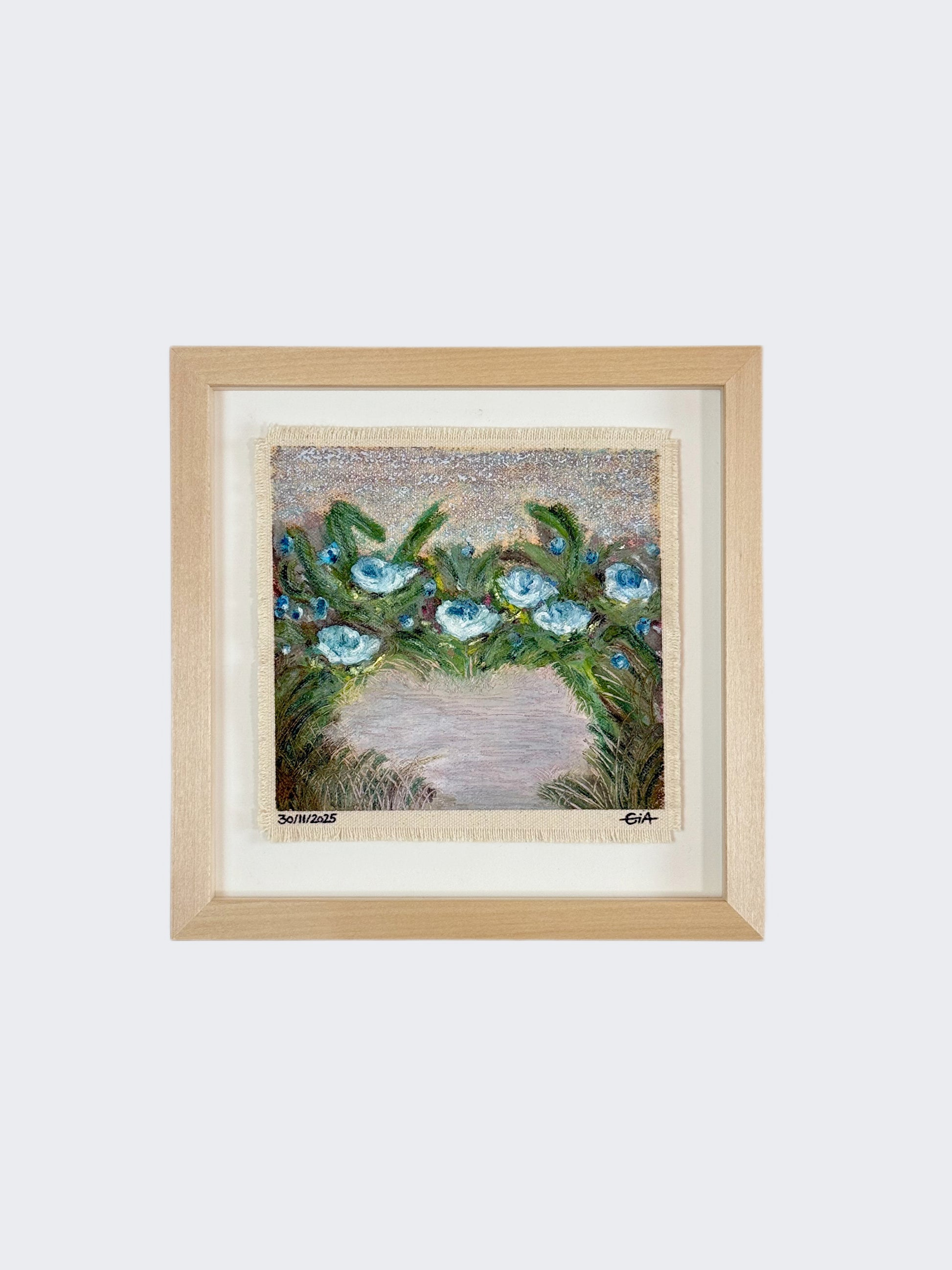 Painted with rich, vibrant oil pastels on raw heavy canvas, each artwork is signed, dated, and professionally framed in a wooden object frame behind glass. The compact frame is designed for versatility, it can be hung on the wall, stood upright on a shelf, or laid flat on a table.
