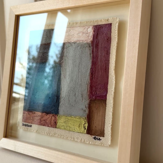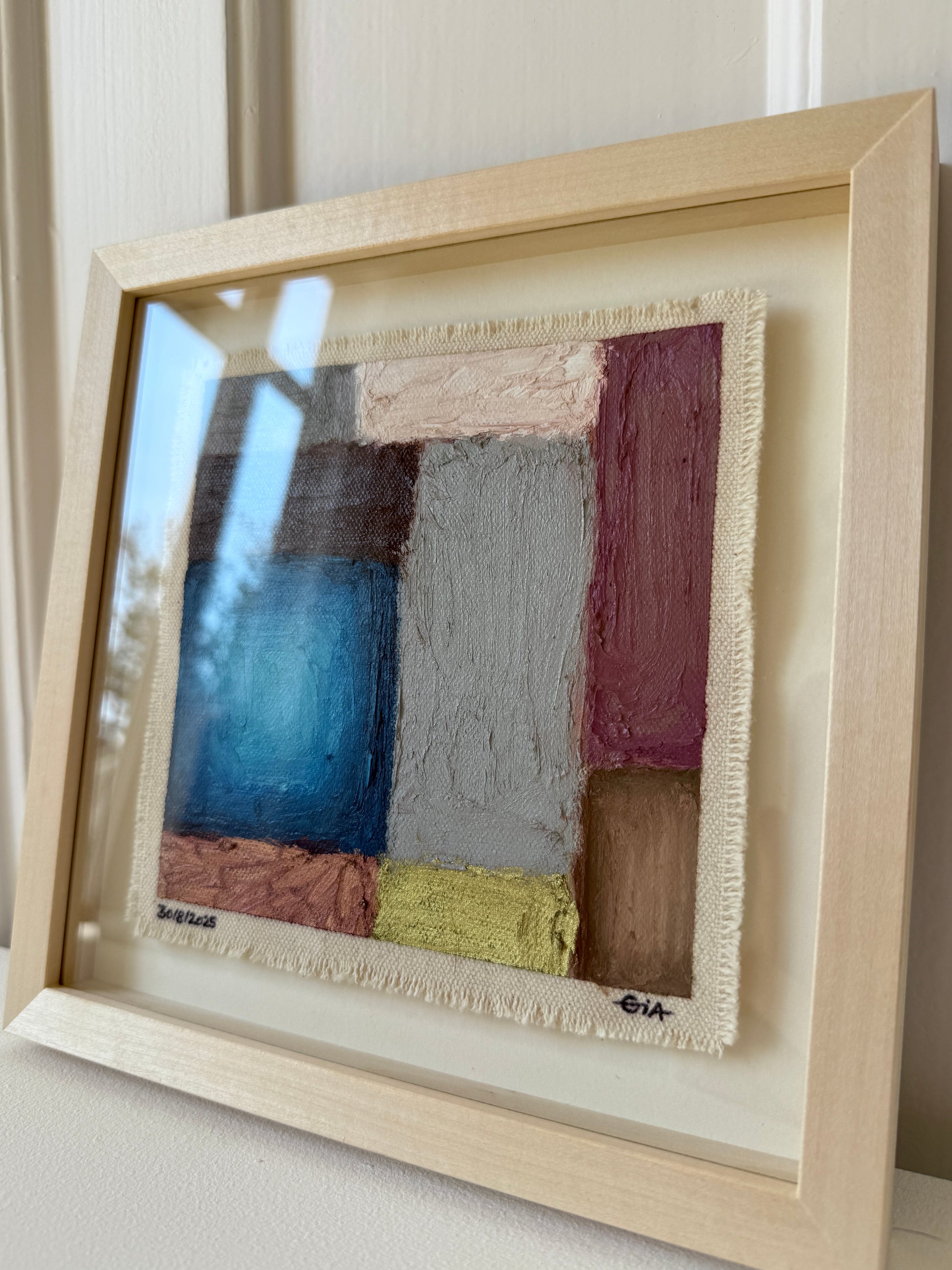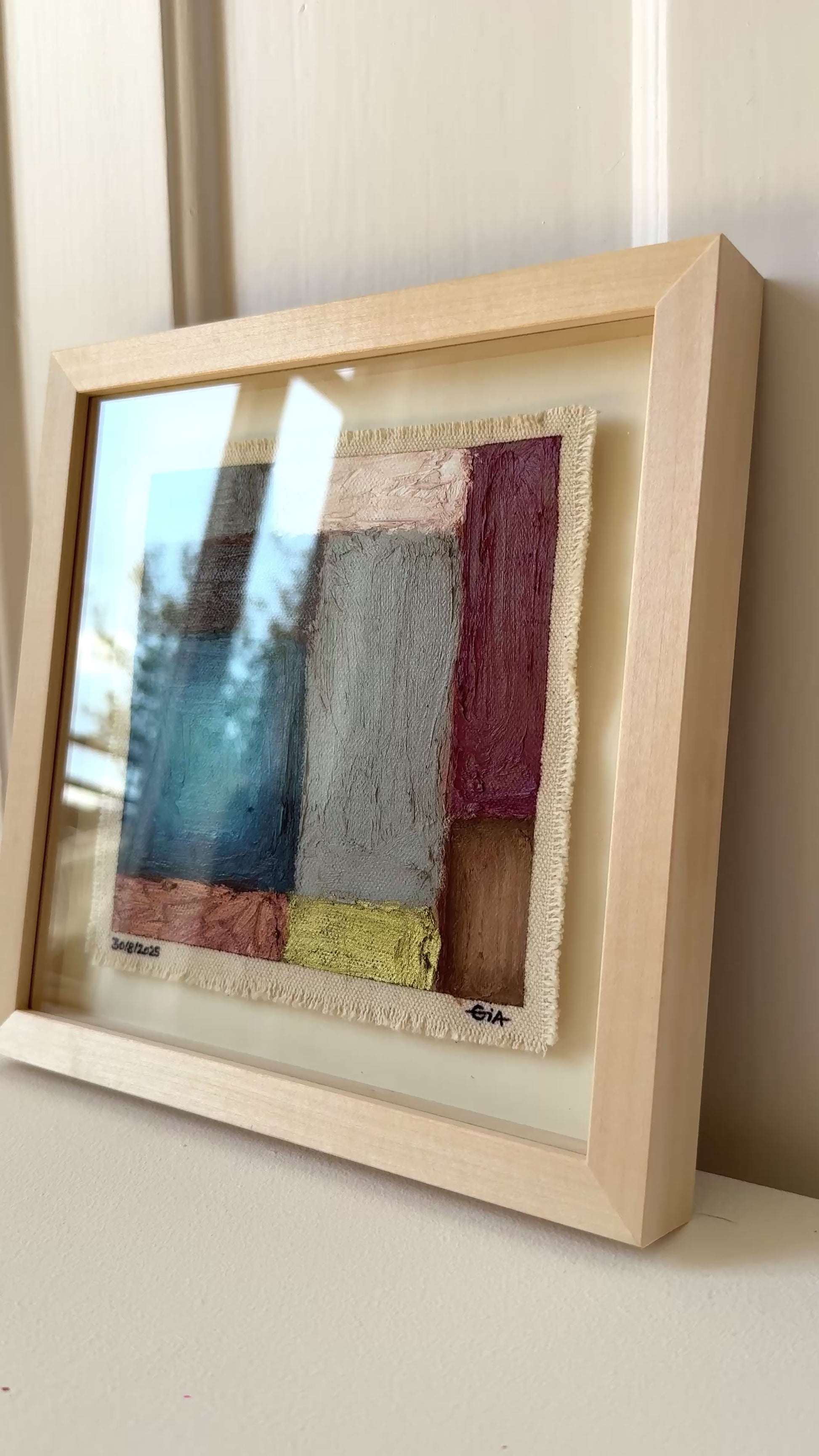 Painted with rich, vibrant oil pastels on raw heavy canvas, each artwork is signed, dated, and professionally framed in a wooden object frame behind glass. The compact frame is designed for versatility, it can be hung on the wall, stood upright on a shelf, or laid flat on a table.