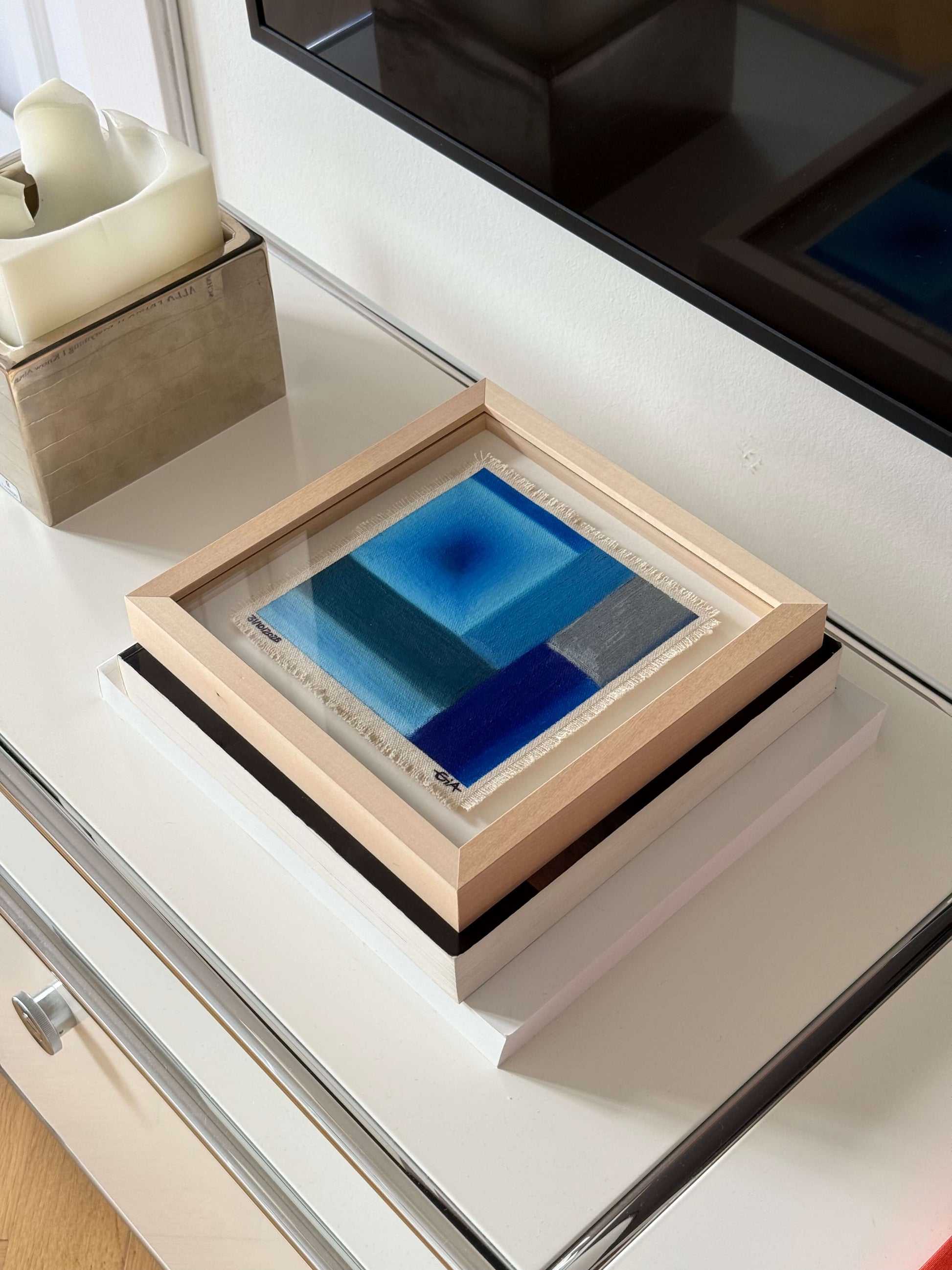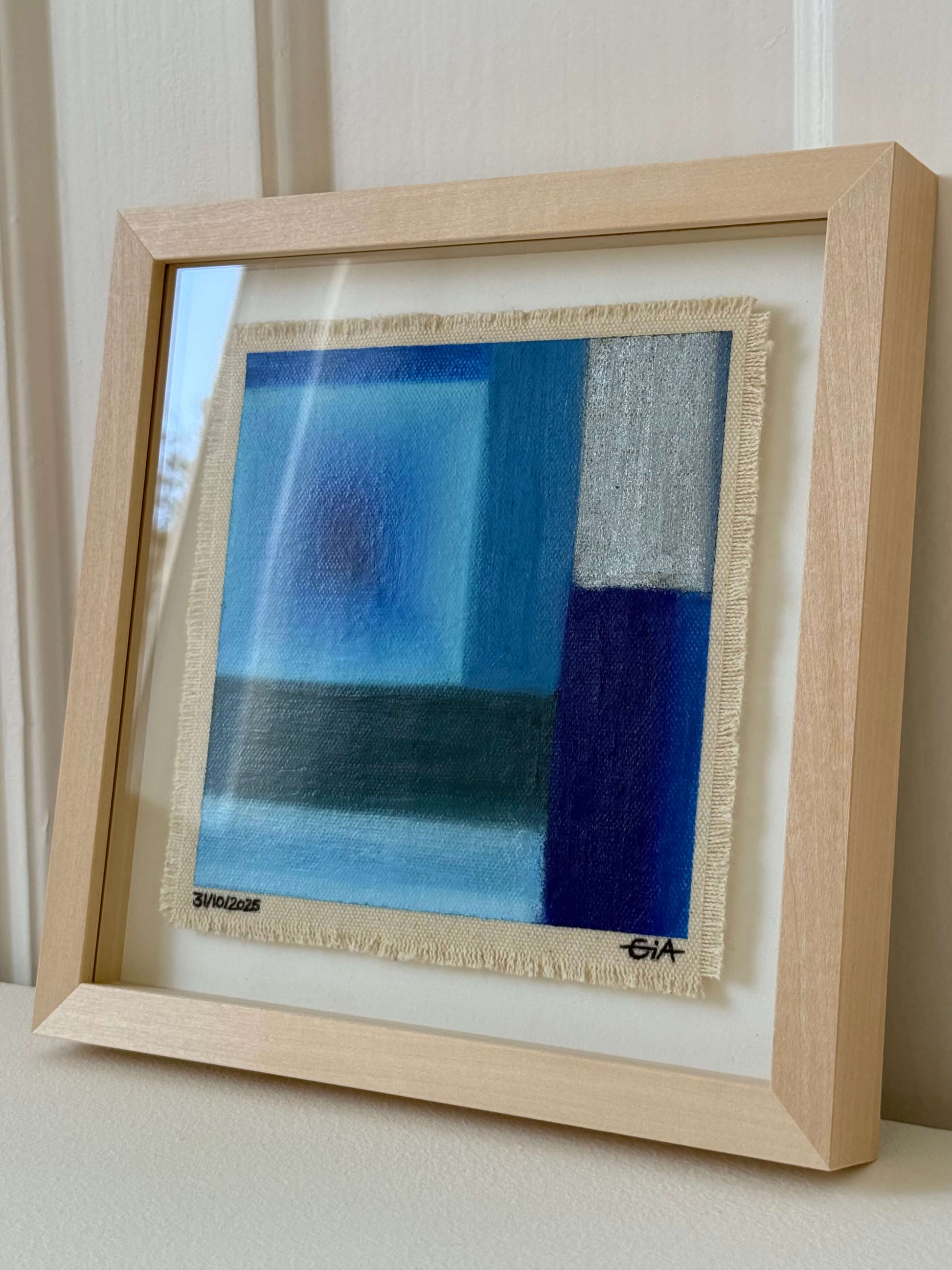 Painted with rich, vibrant oil pastels on raw heavy canvas, each artwork is signed, dated, and professionally framed in a wooden object frame behind glass. The compact frame is designed for versatility, it can be hung on the wall, stood upright on a shelf, or laid flat on a table.