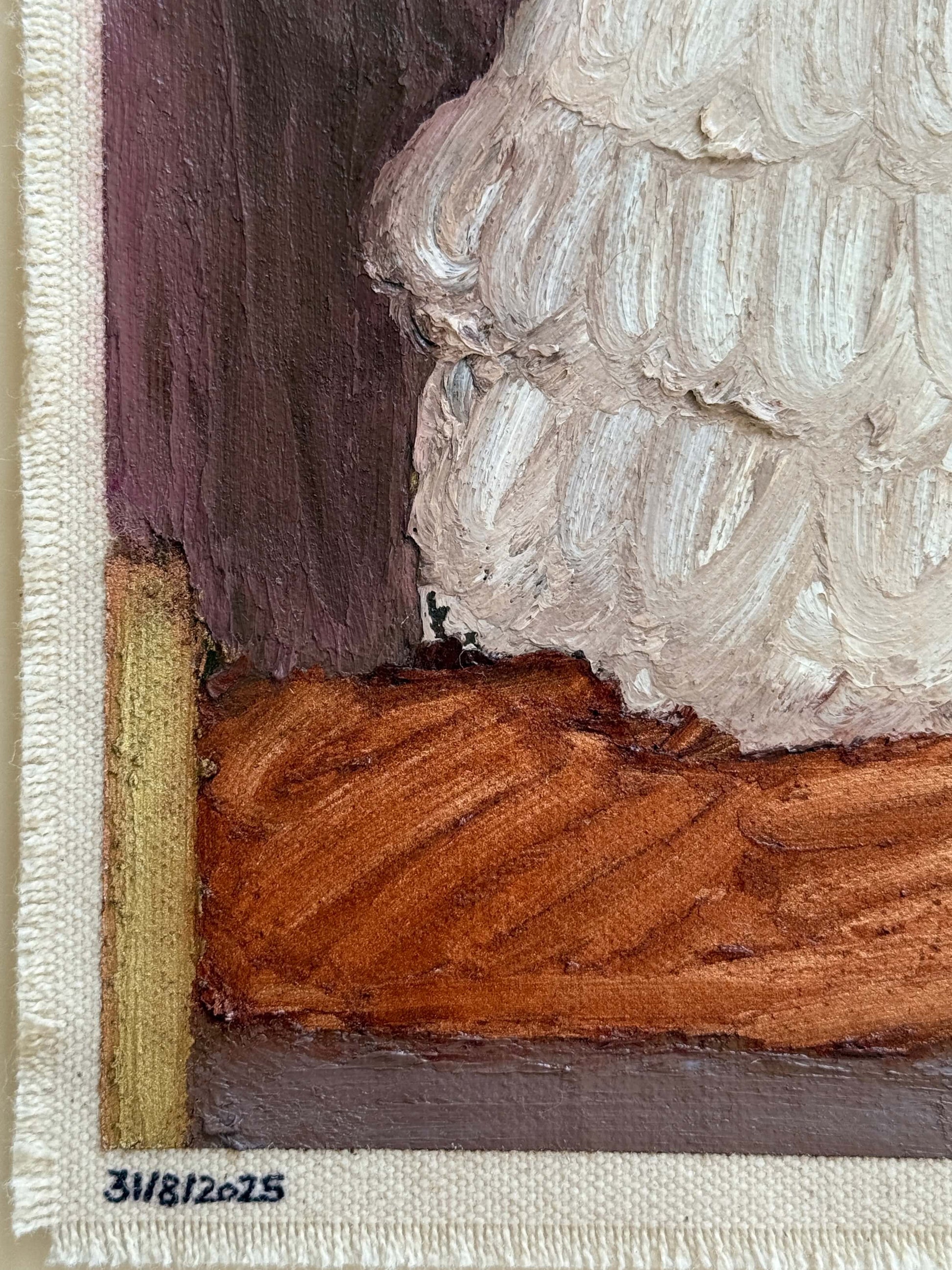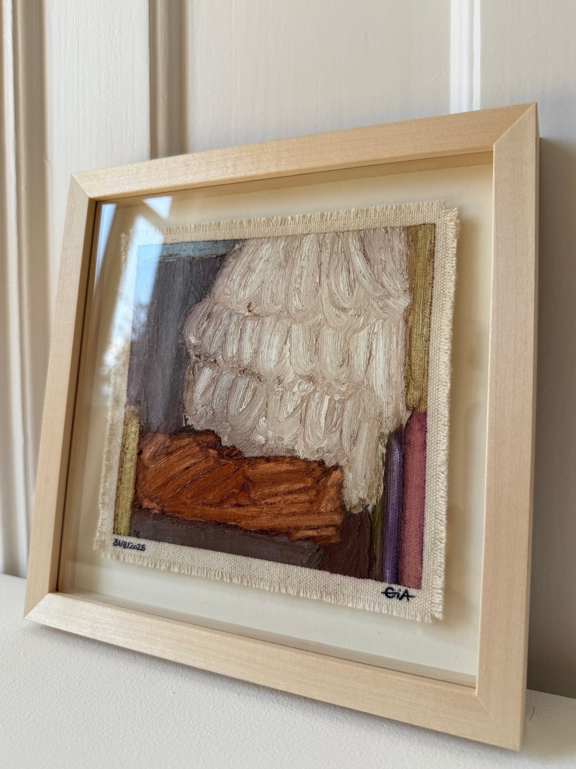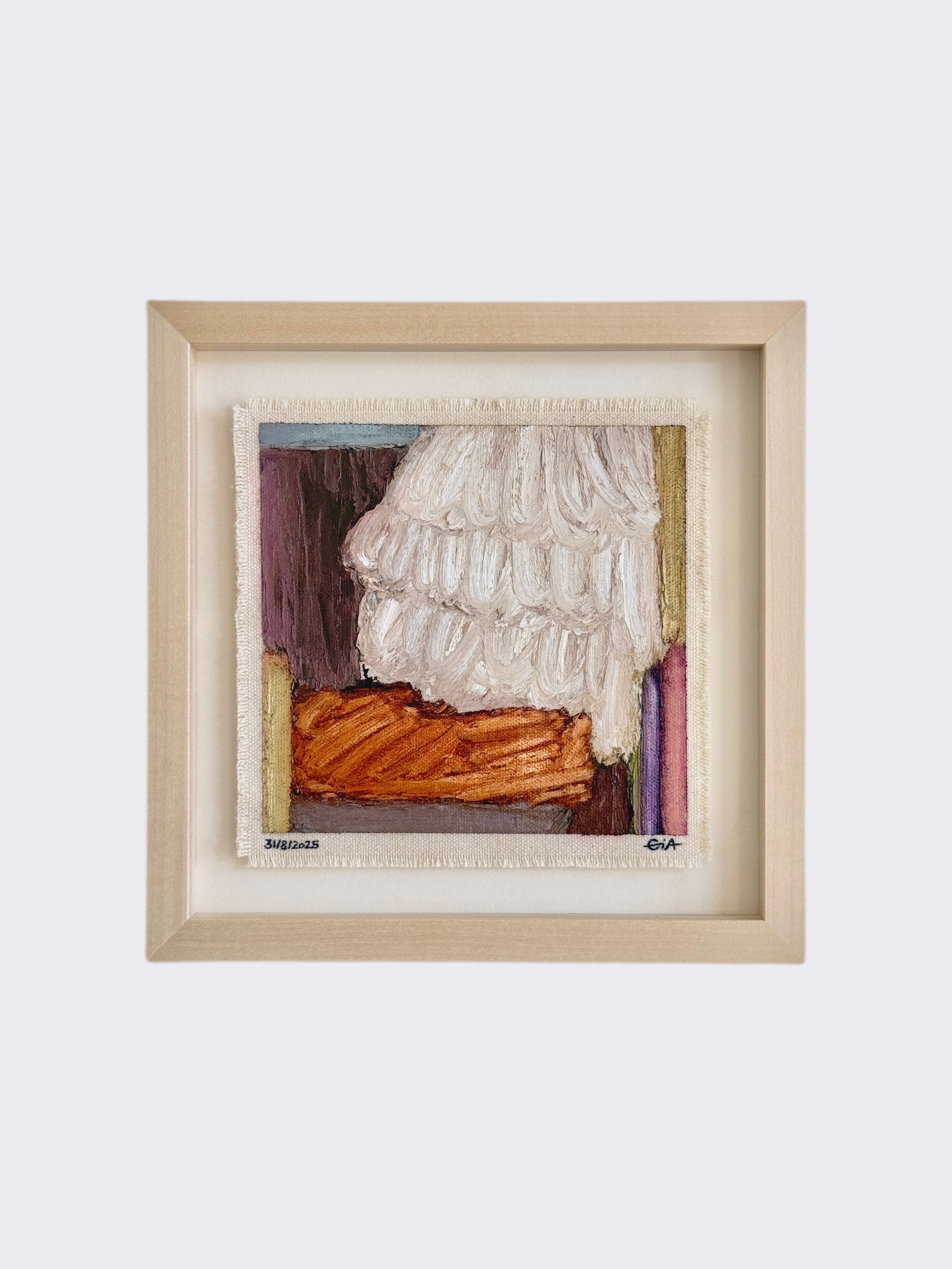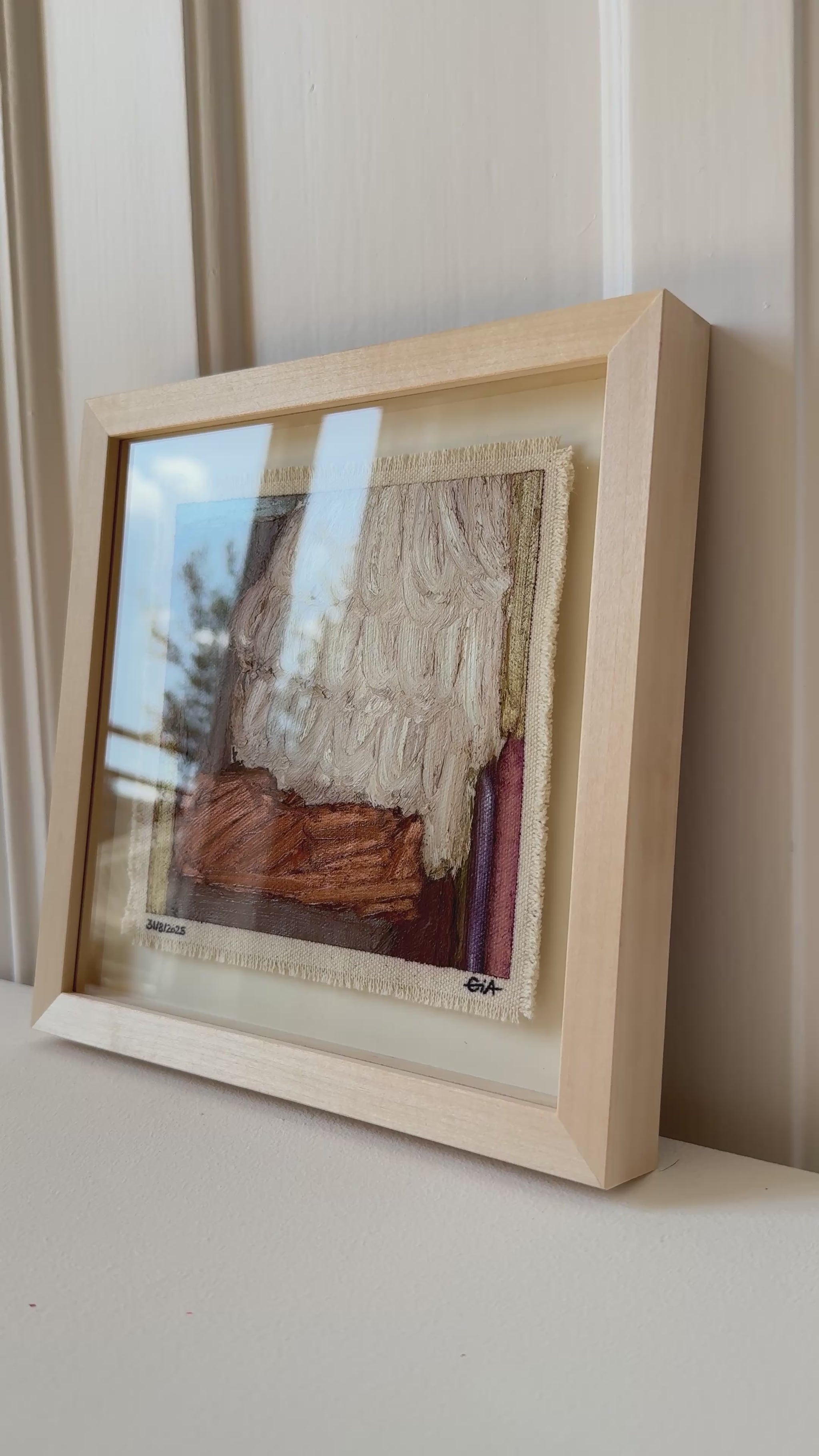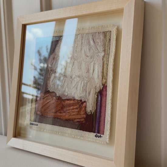 Painted with rich, vibrant oil pastels on raw heavy canvas, each artwork is signed, dated, and professionally framed in a wooden object frame behind glass. The compact frame is designed for versatility, it can be hung on the wall, stood upright on a shelf, or laid flat on a table.