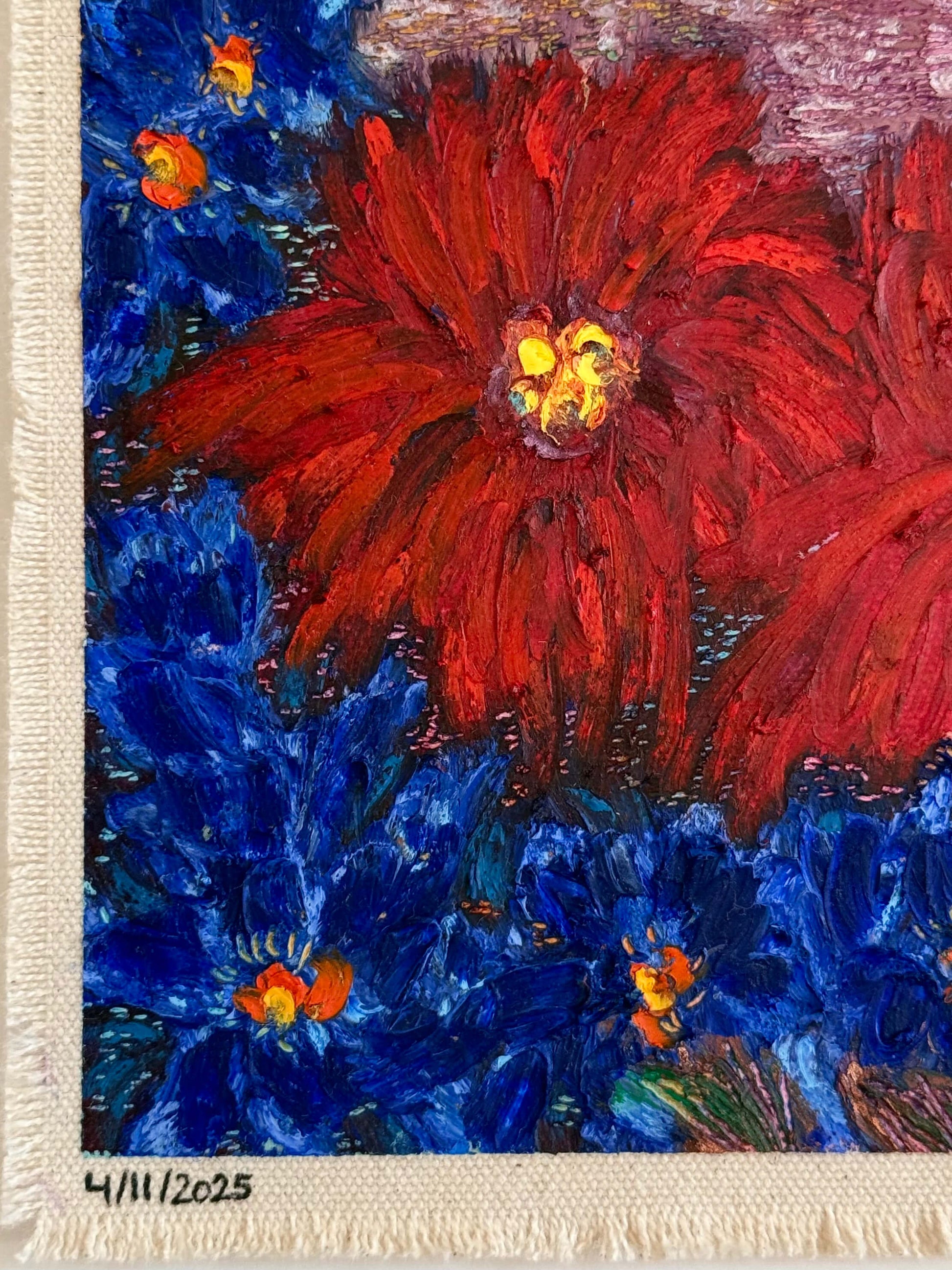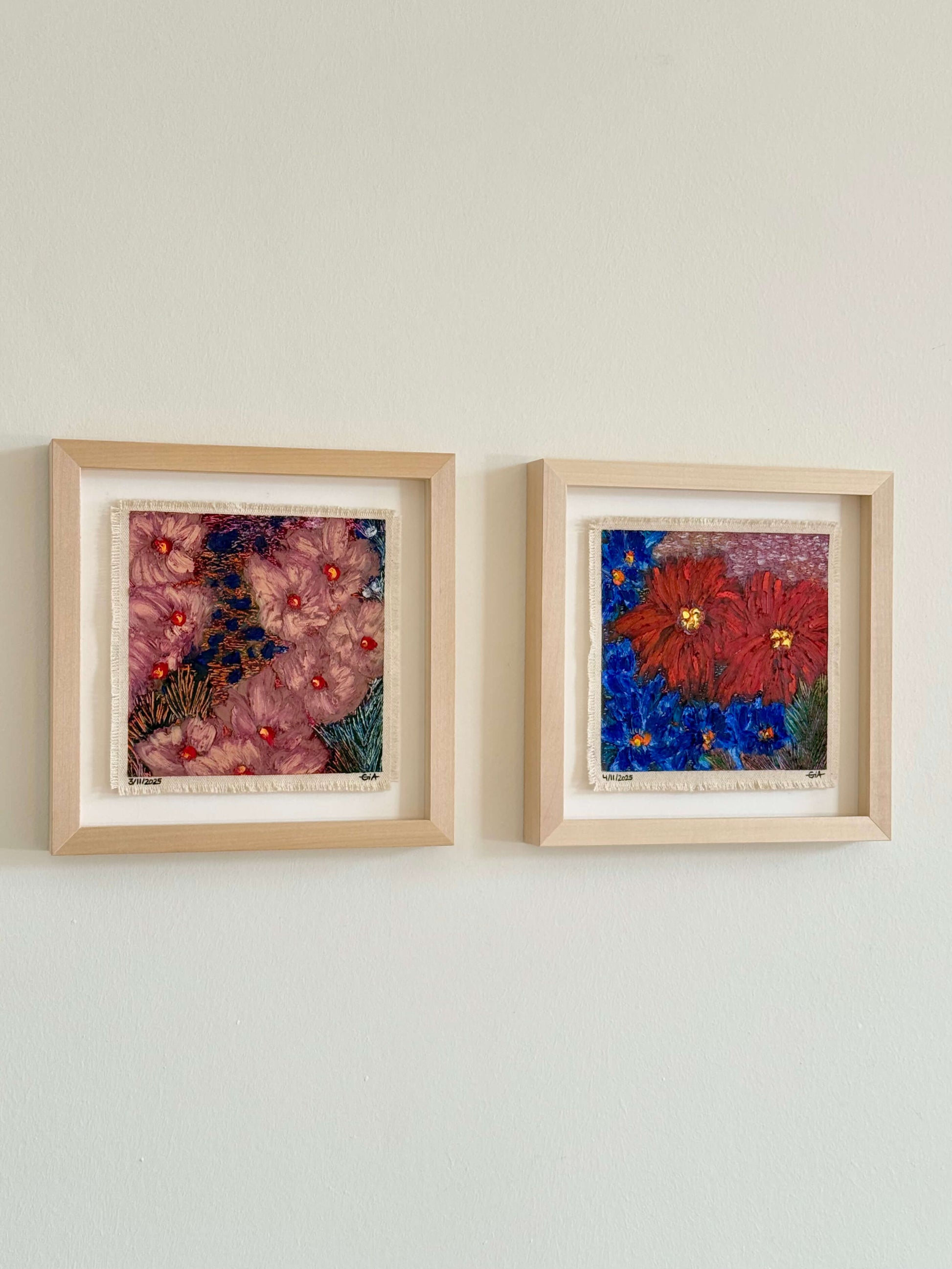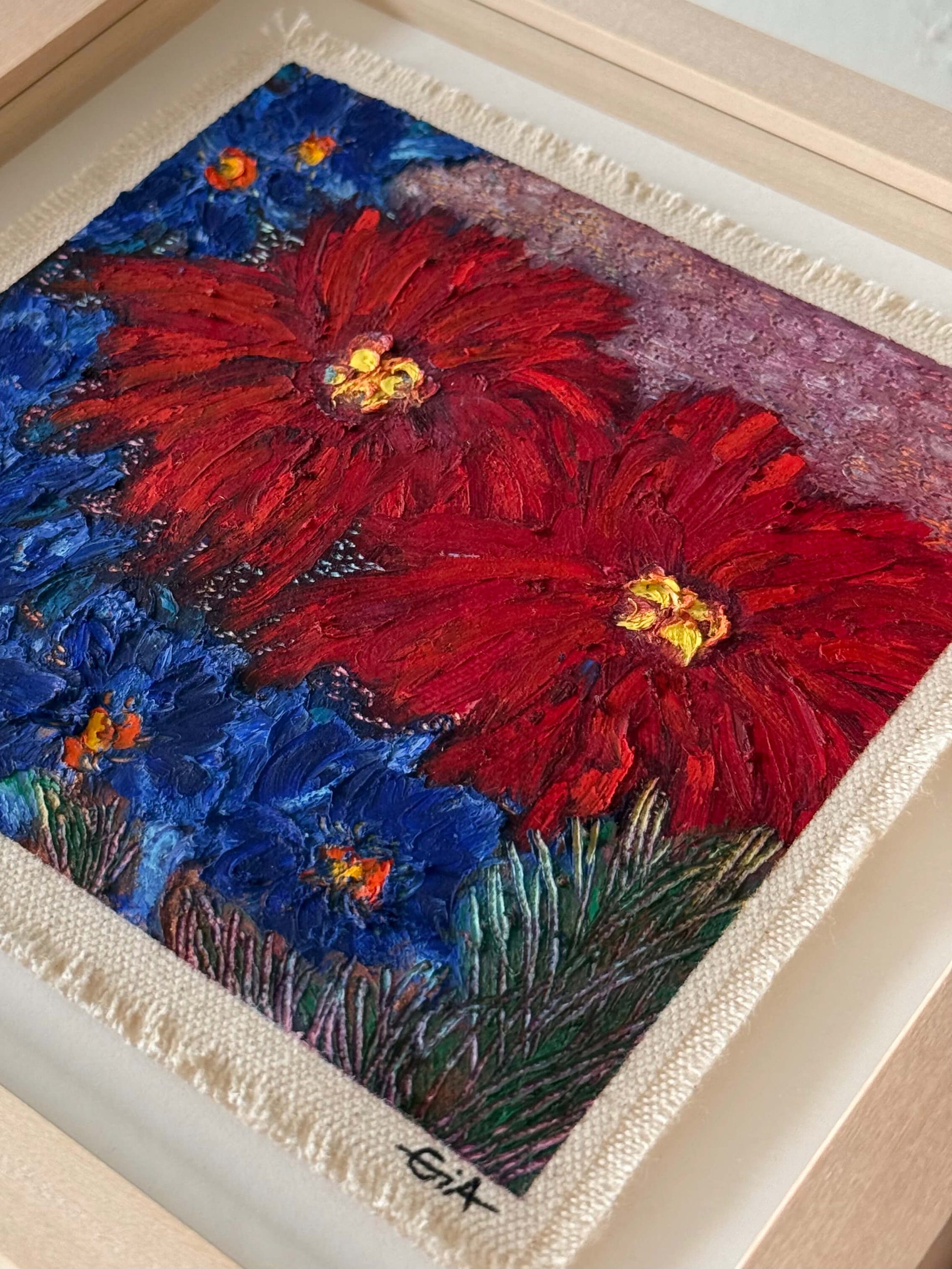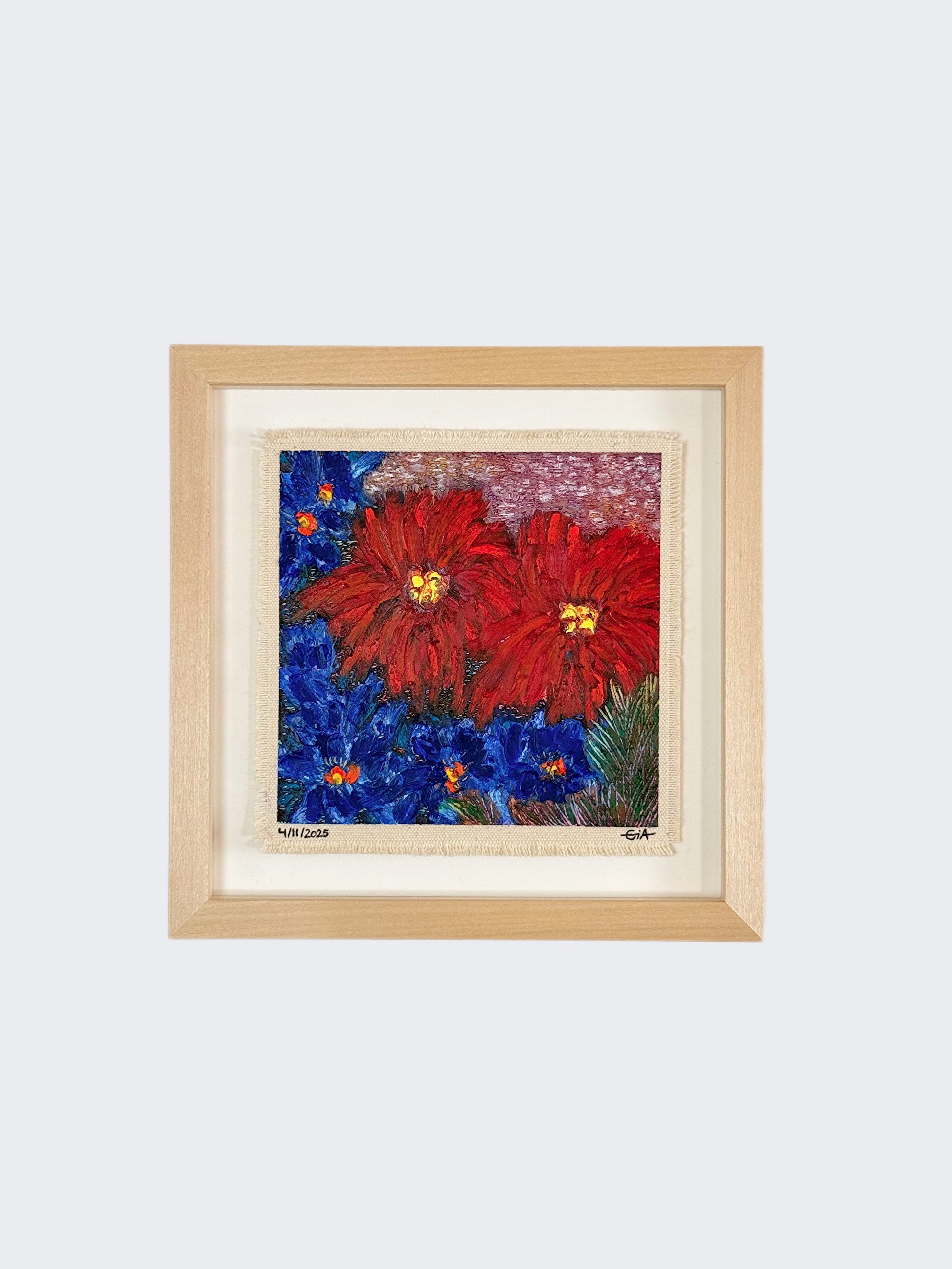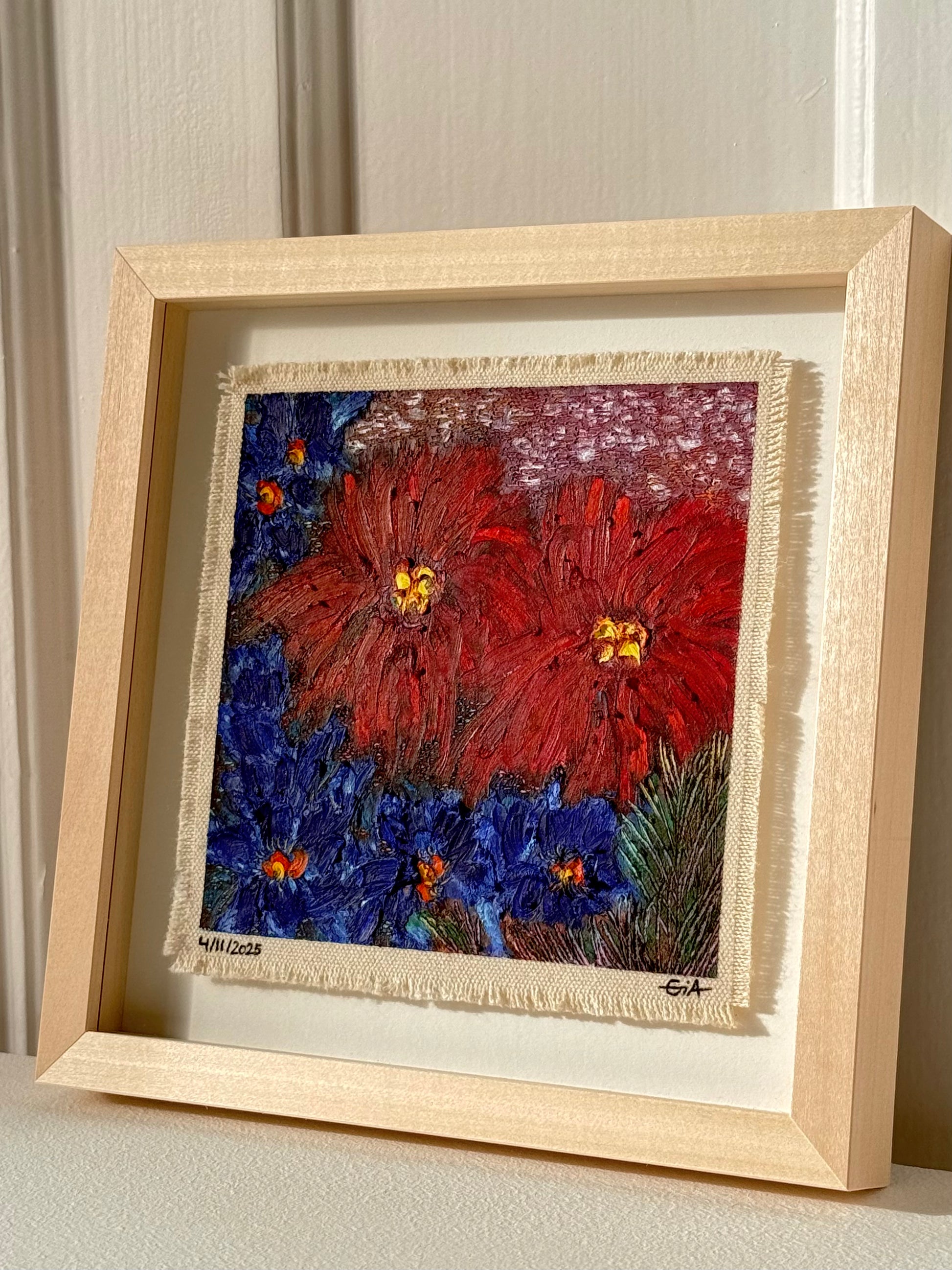 Painted with rich, vibrant oil pastels on raw heavy canvas, each artwork is signed, dated, and professionally framed in a wooden object frame behind glass. The compact frame is designed for versatility, it can be hung on the wall, stood upright on a shelf, or laid flat on a table.