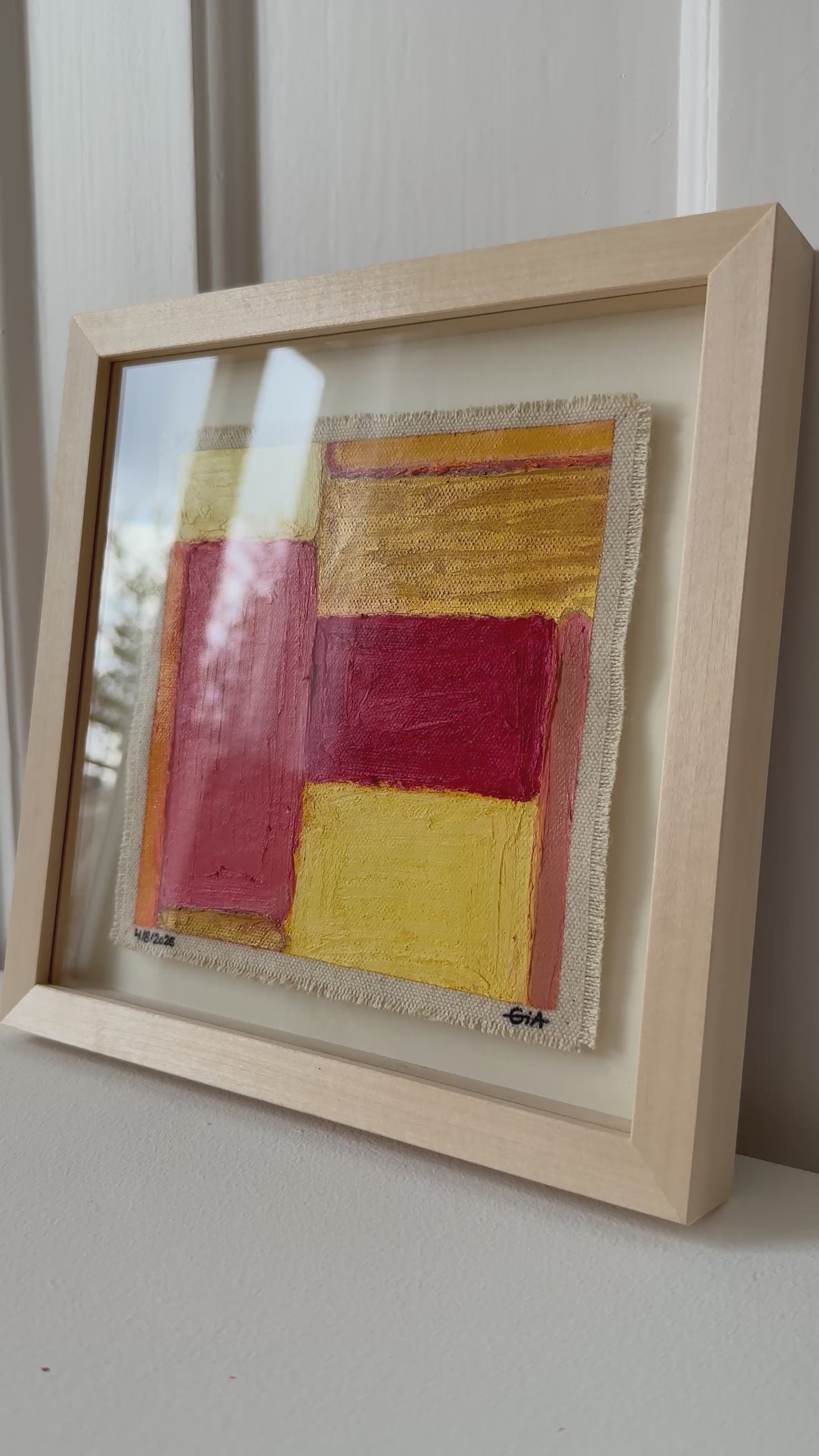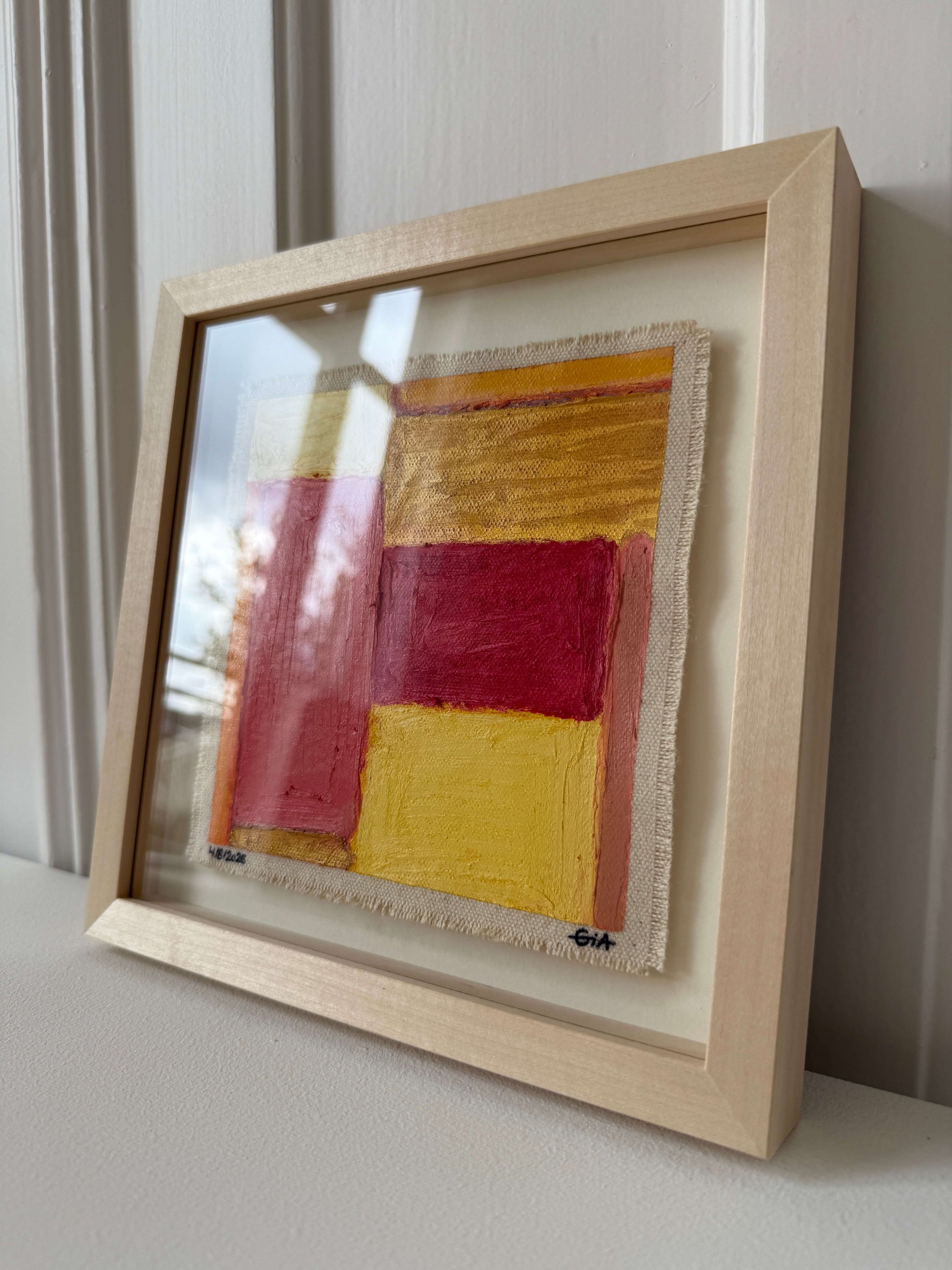 Painted with rich, vibrant oil pastels on raw heavy canvas, each artwork is signed, dated, and professionally framed in a wooden object frame behind glass. The compact frame is designed for versatility, it can be hung on the wall, stood upright on a shelf, or laid flat on a table.
