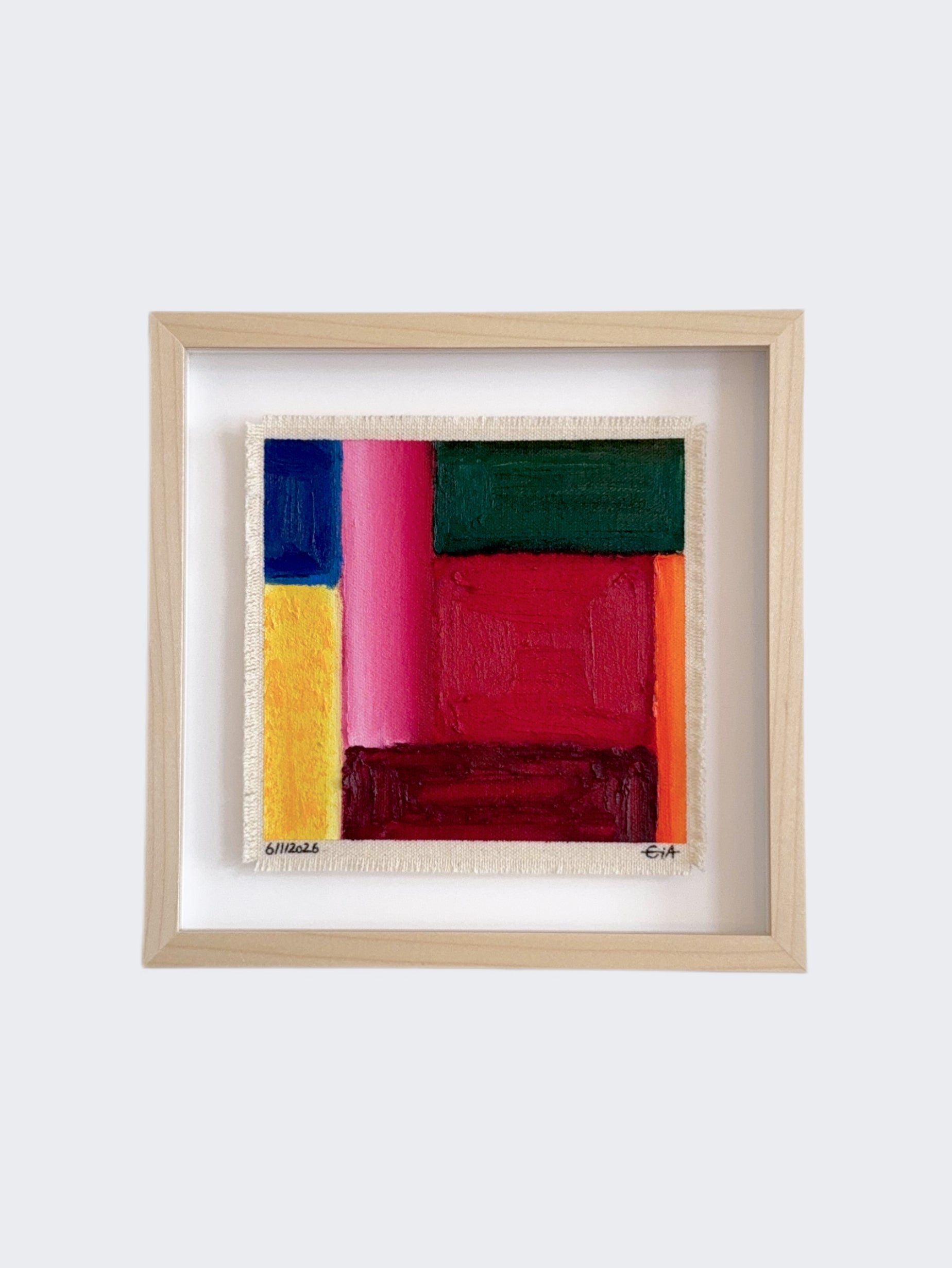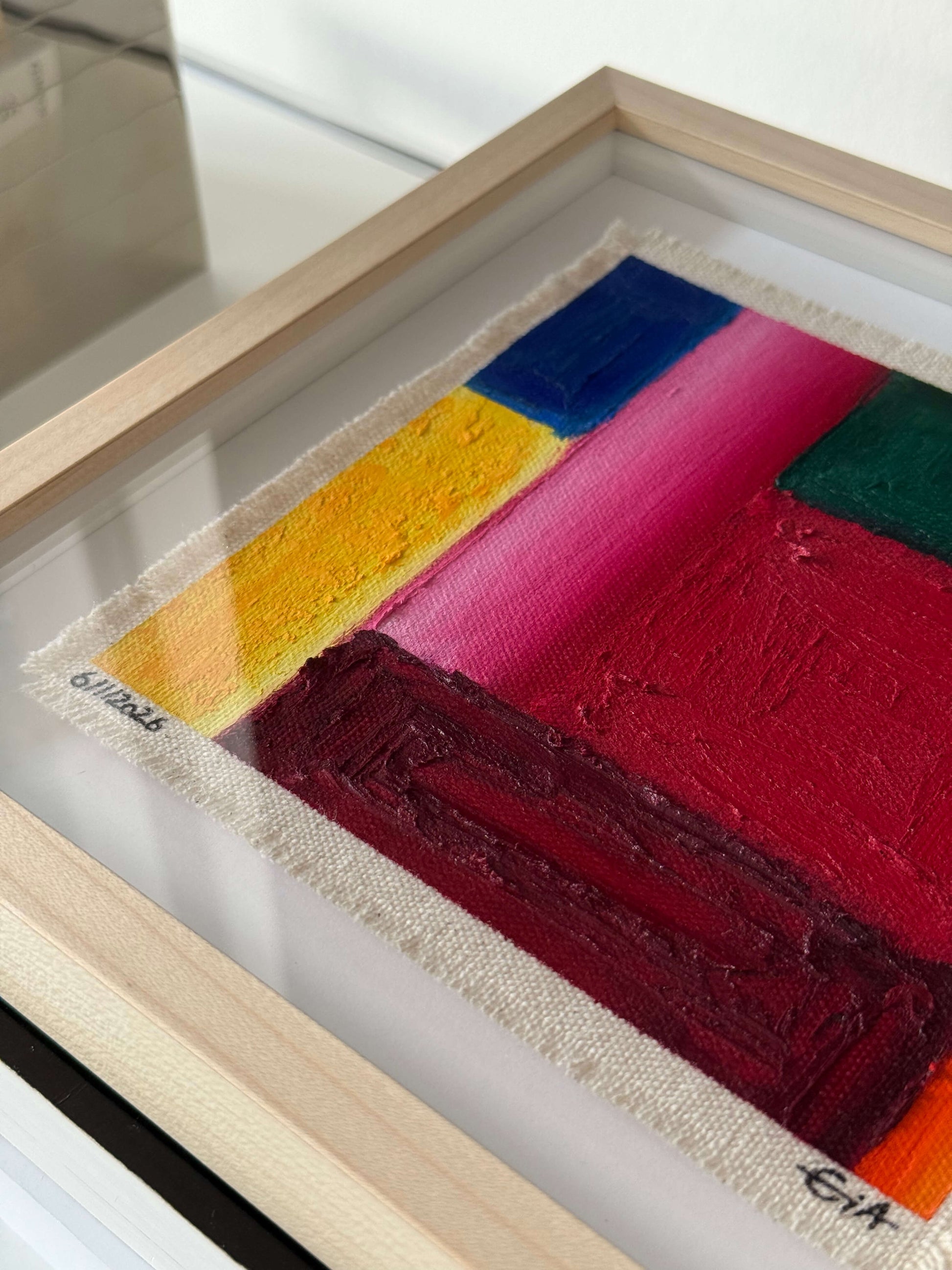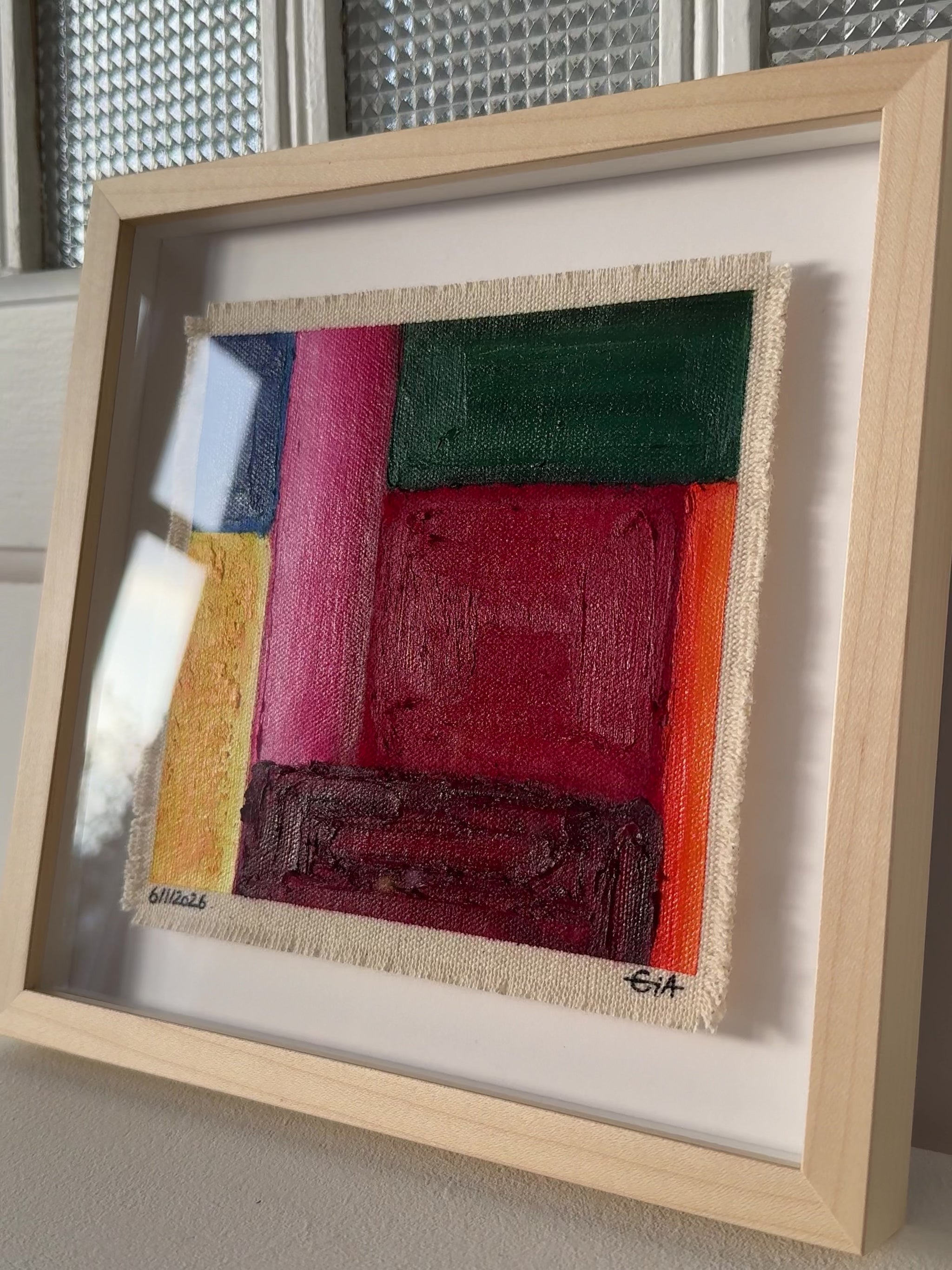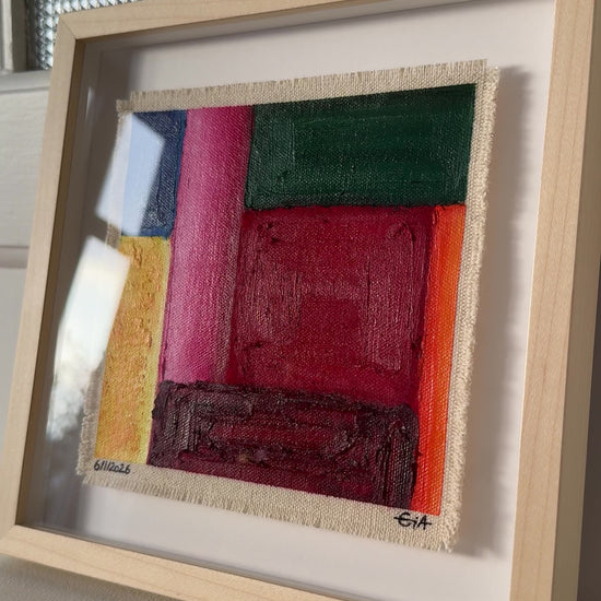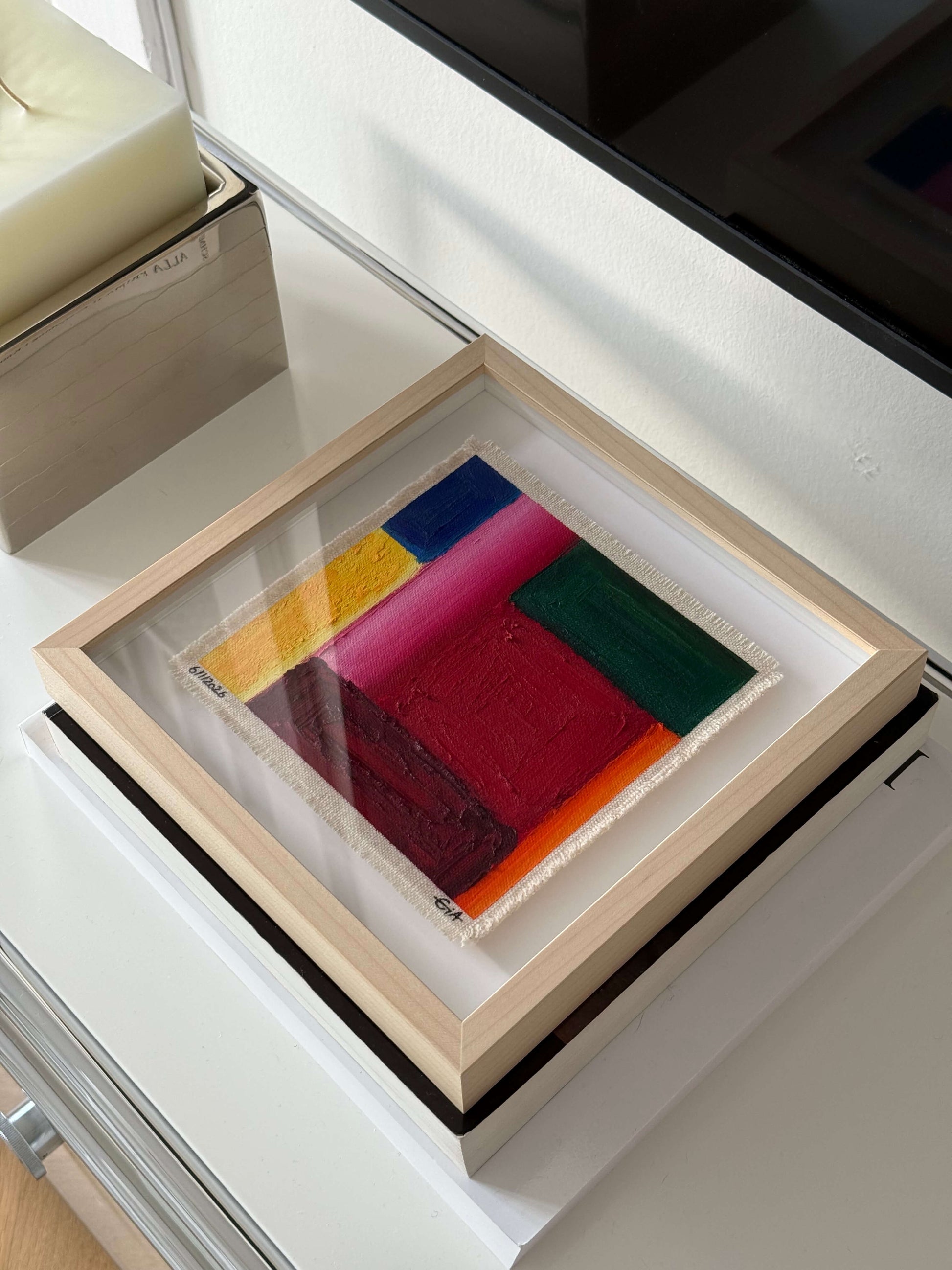 Painted with rich, vibrant oil pastels on raw heavy canvas, each artwork is signed and dated, then professionally framed in a natural maple wood object frame with a floating mount behind white glass. The compact frame includes professional hanging and wall stoppers on the back, and is designed for versatile display on the wall, standing upright on a shelf, or laid flat on a table.