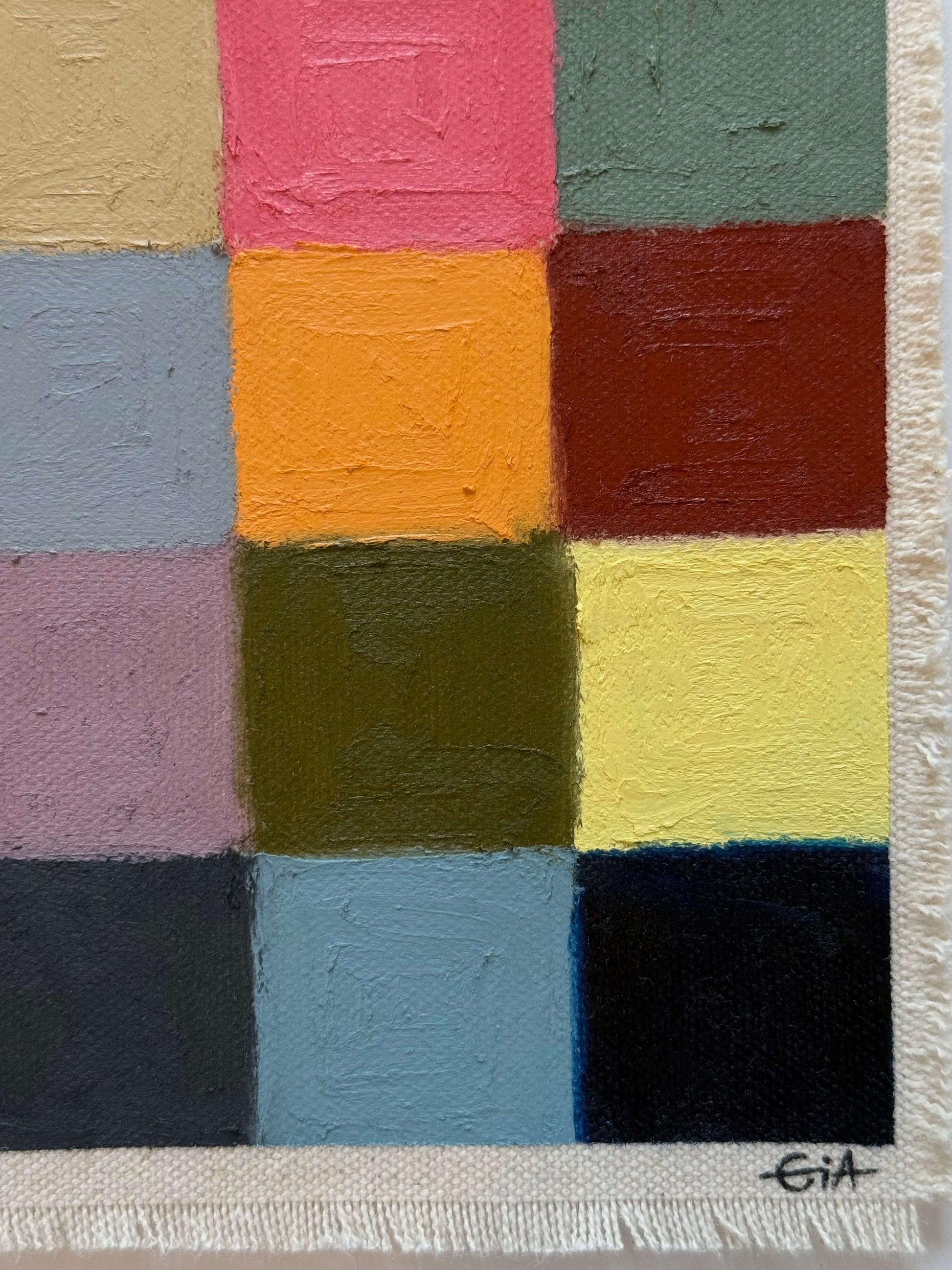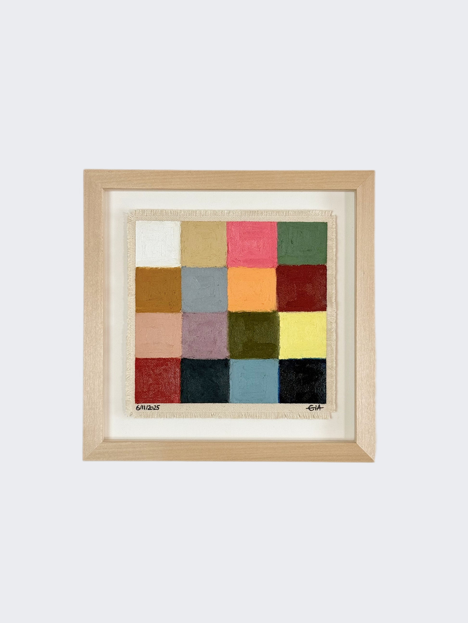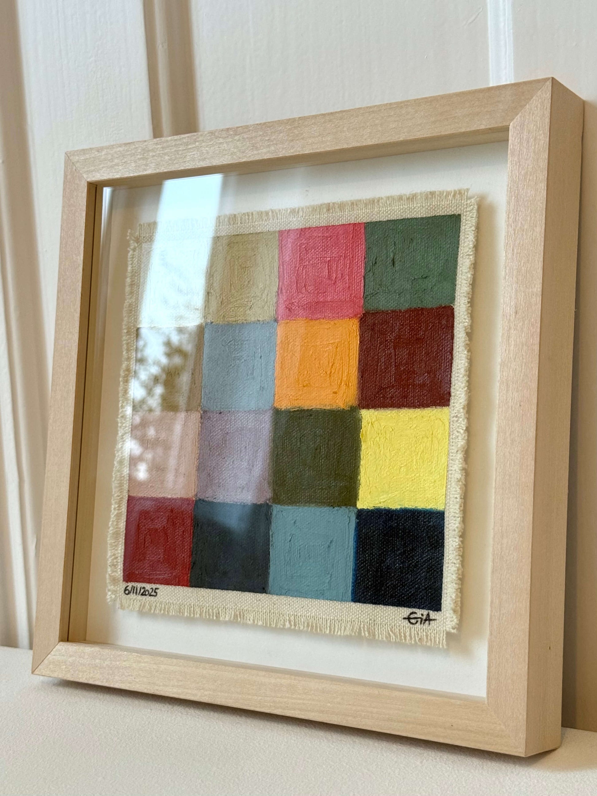 Painted with rich, vibrant oil pastels on raw heavy canvas, each artwork is signed, dated, and professionally framed in a wooden object frame behind glass. The compact frame is designed for versatility, it can be hung on the wall, stood upright on a shelf, or laid flat on a table.