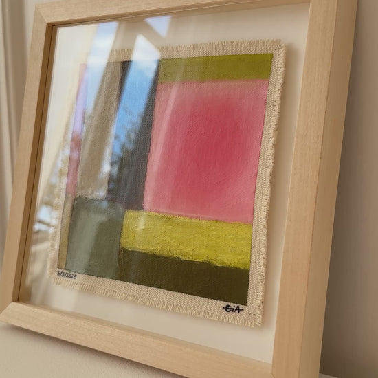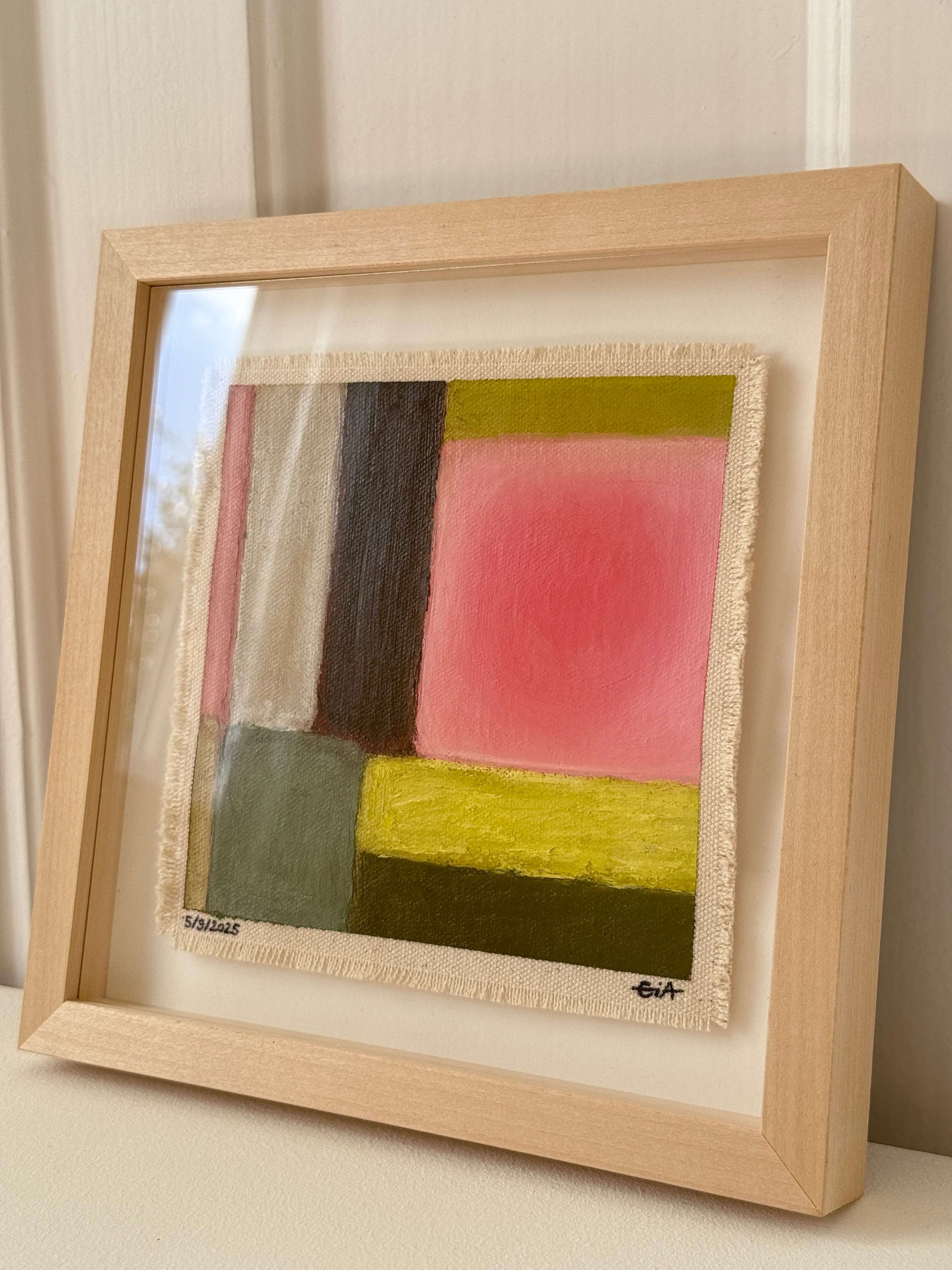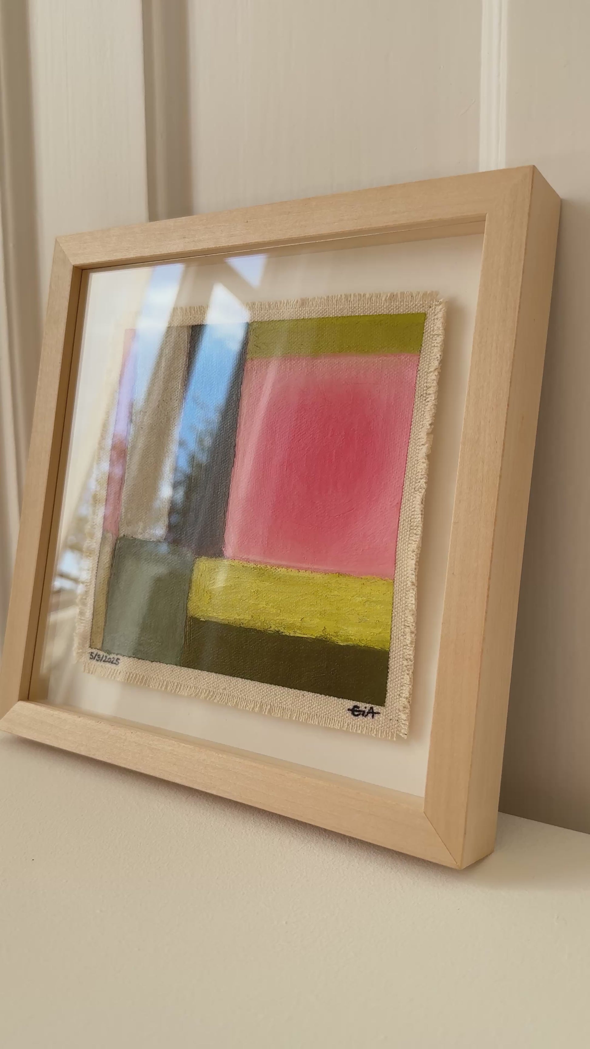 Painted with rich, vibrant oil pastels on raw heavy canvas, each artwork is signed, dated, and professionally framed in a wooden object frame behind glass. The compact frame is designed for versatility, it can be hung on the wall, stood upright on a shelf, or laid flat on a table.