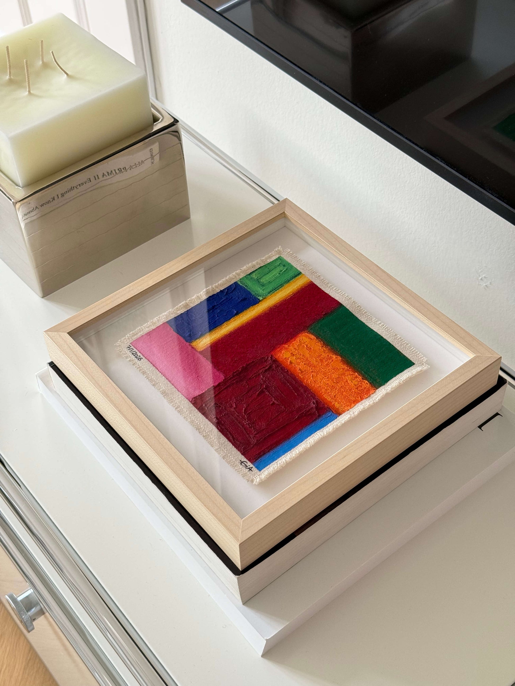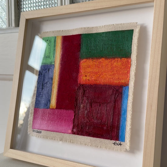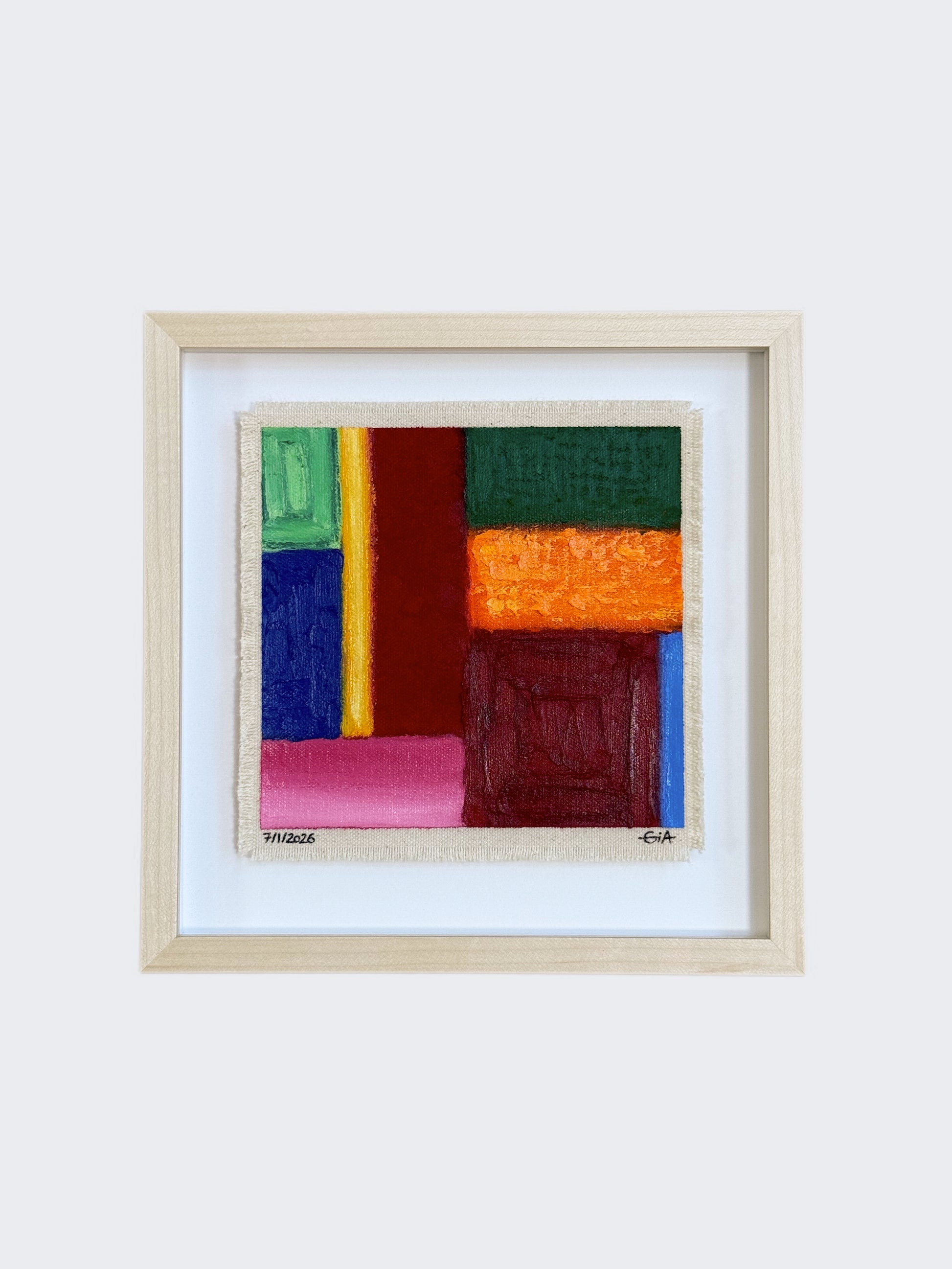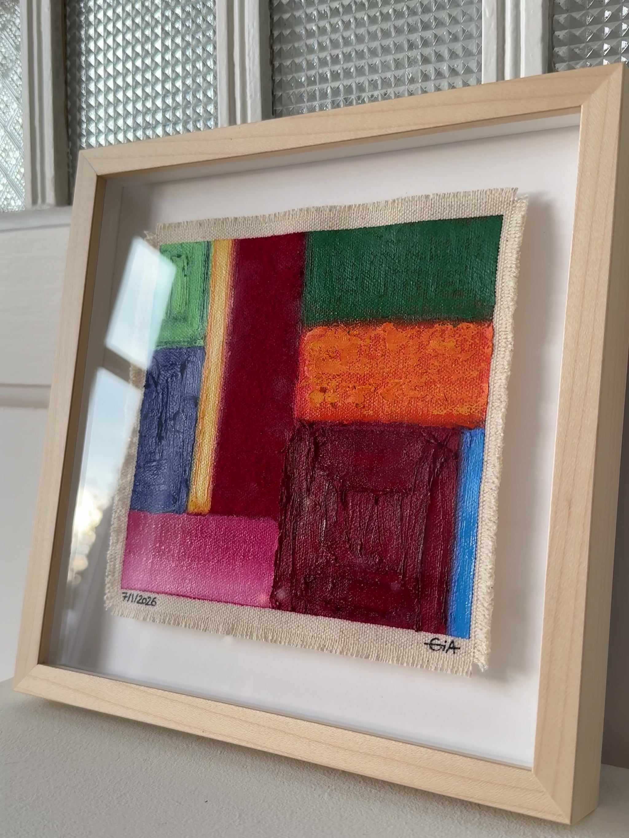 Painted with rich, vibrant oil pastels on raw heavy canvas, each artwork is signed and dated, then professionally framed in a natural maple wood object frame with a floating mount behind white glass. The compact frame includes professional hanging and wall stoppers on the back, and is designed for versatile display on the wall, standing upright on a shelf, or laid flat on a table.