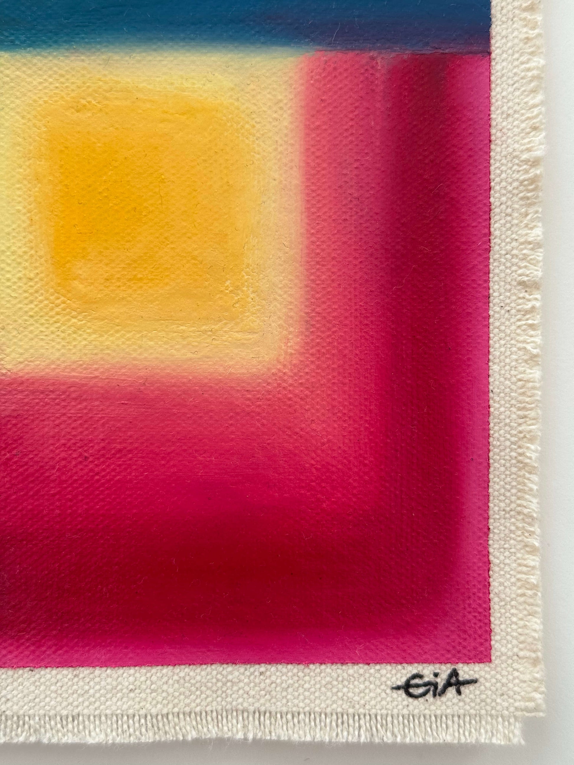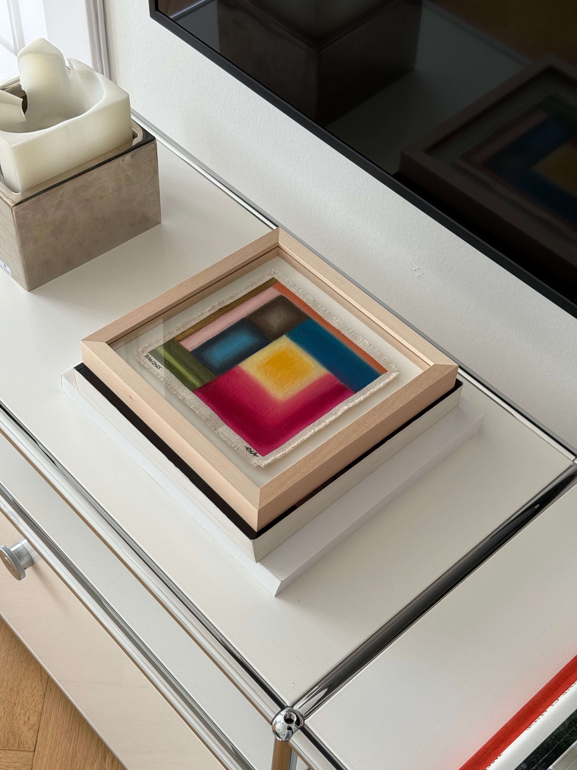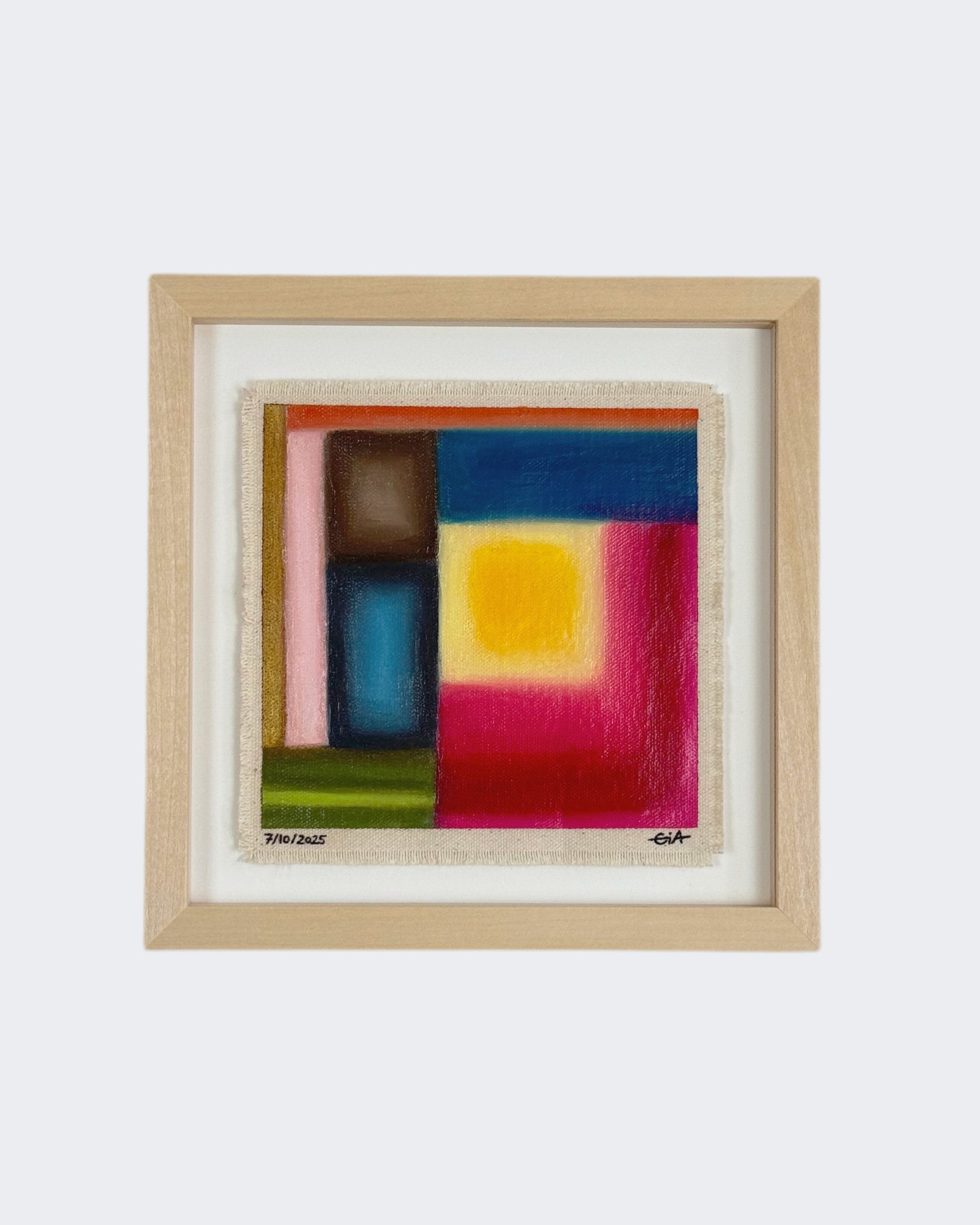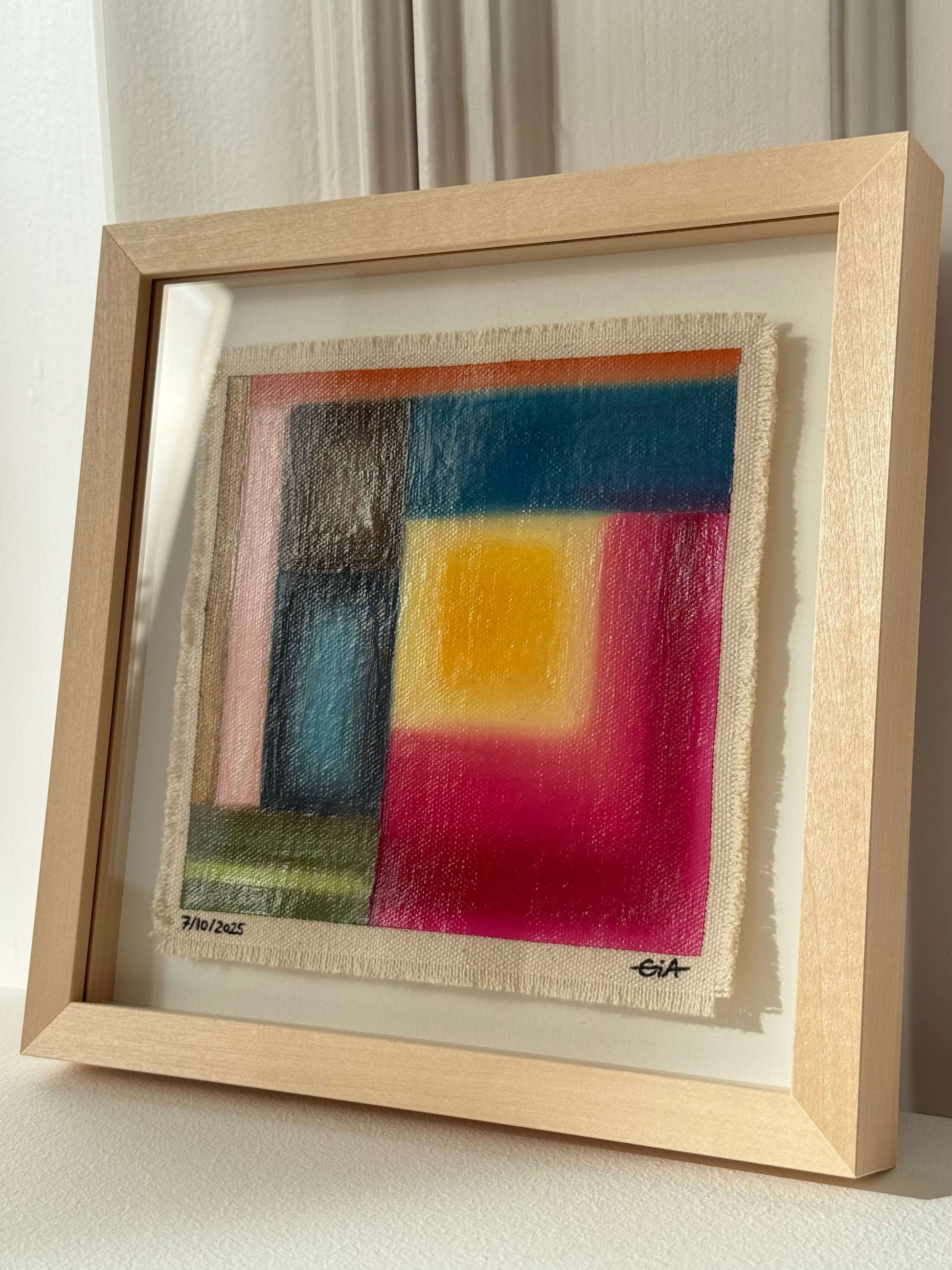 Painted with rich, vibrant oil pastels on raw heavy canvas, each artwork is signed, dated, and professionally framed in a wooden object frame behind glass. The compact frame is designed for versatility, it can be hung on the wall, stood upright on a shelf, or laid flat on a table.
