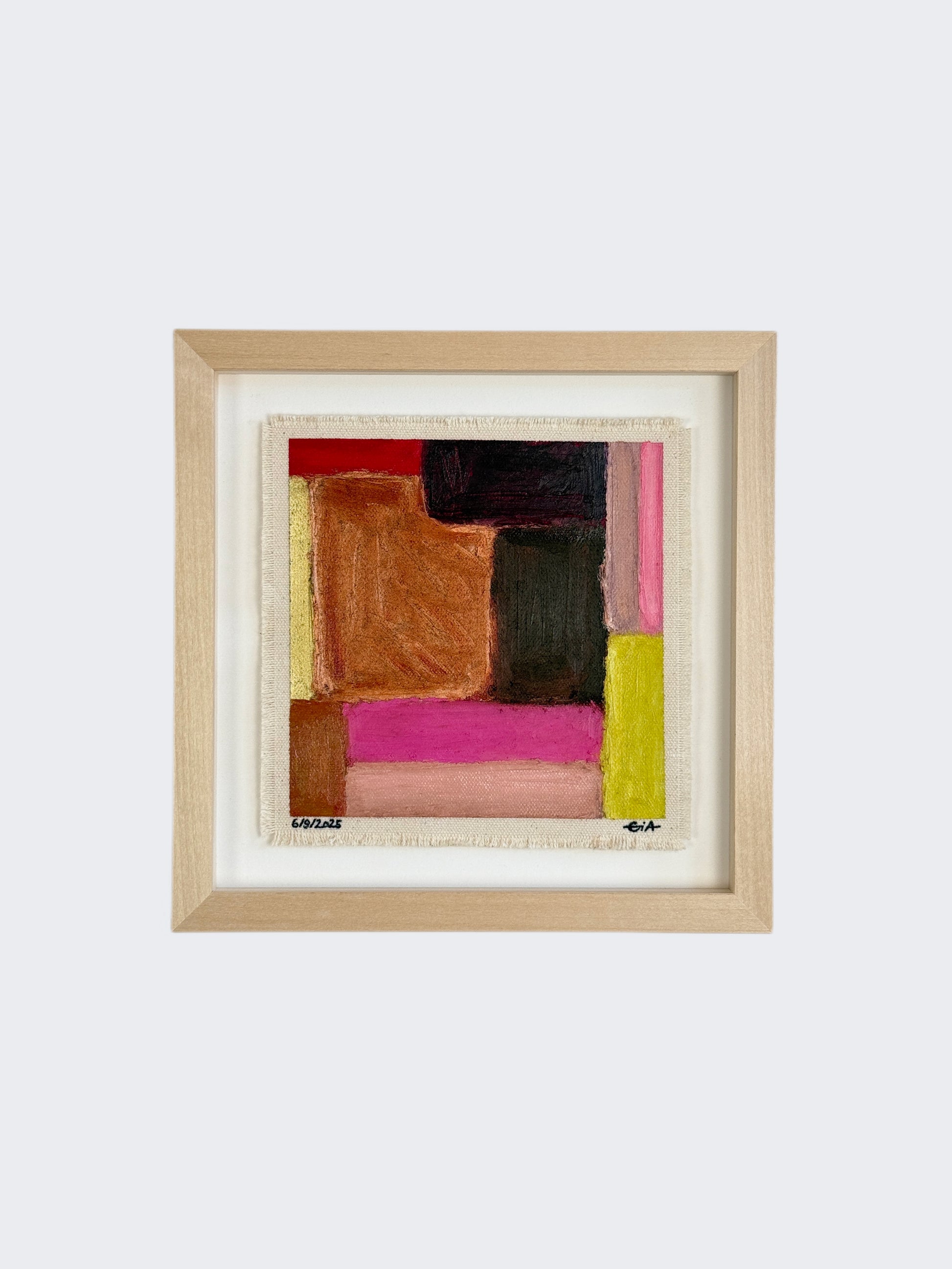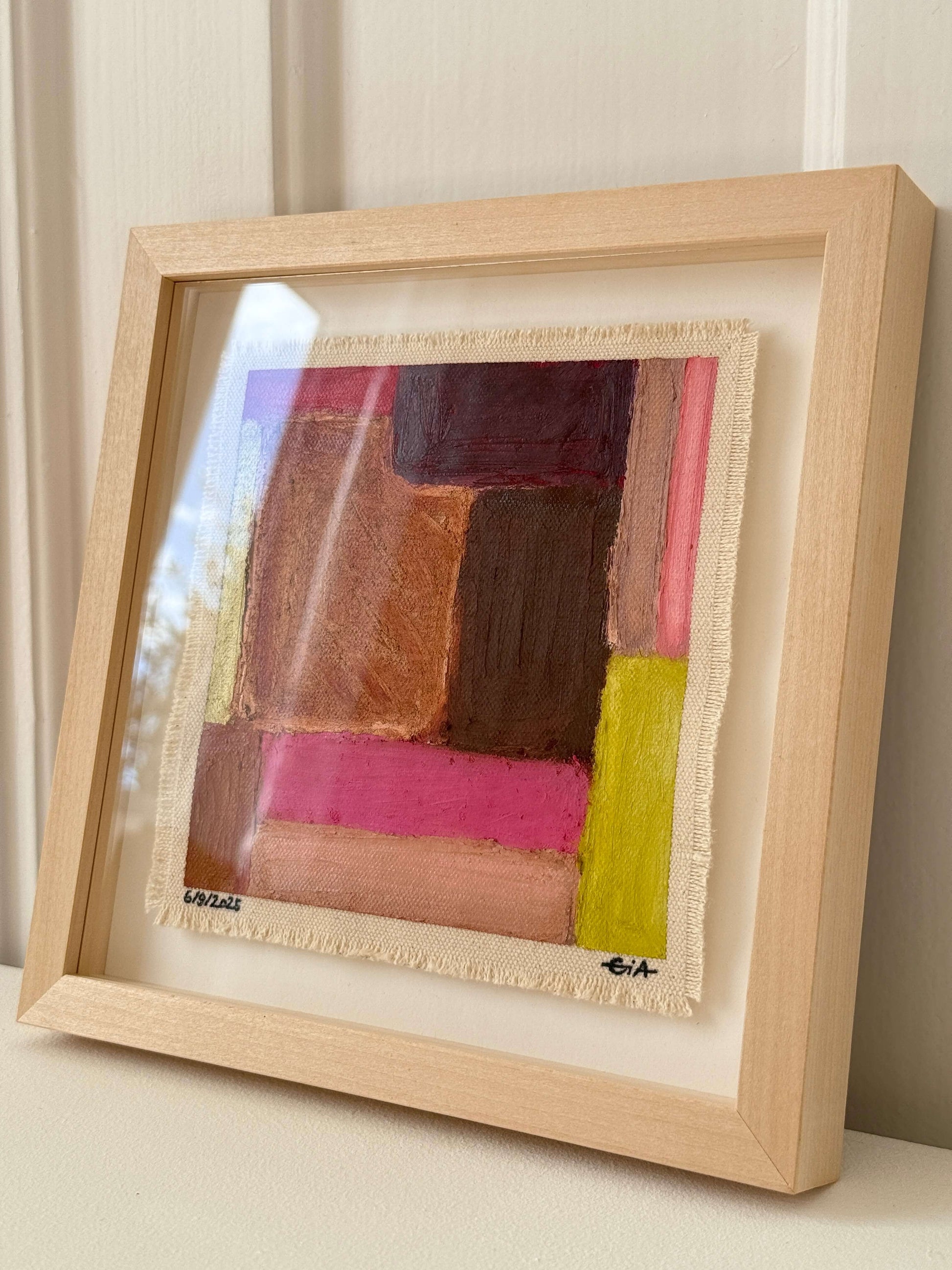 Painted with rich, vibrant oil pastels on raw heavy canvas, each artwork is signed, dated, and professionally framed in a wooden object frame behind glass. The compact frame is designed for versatility, it can be hung on the wall, stood upright on a shelf, or laid flat on a table.