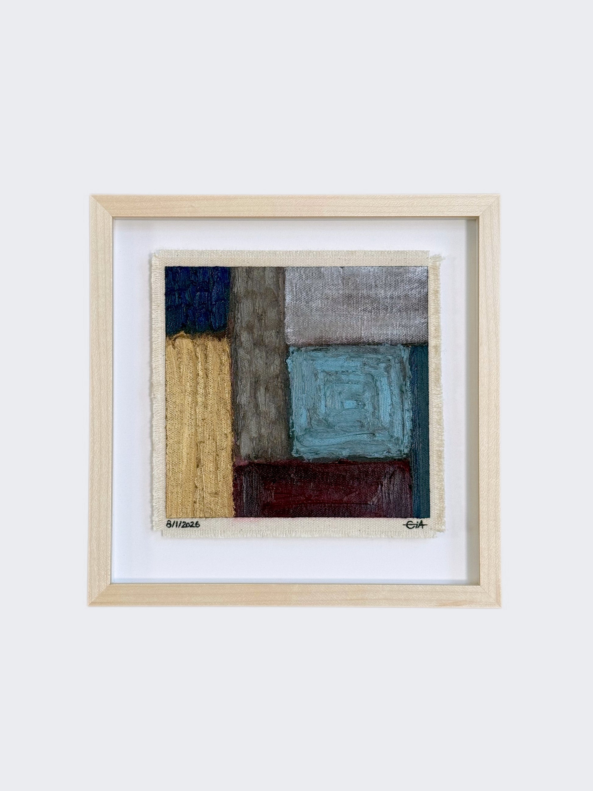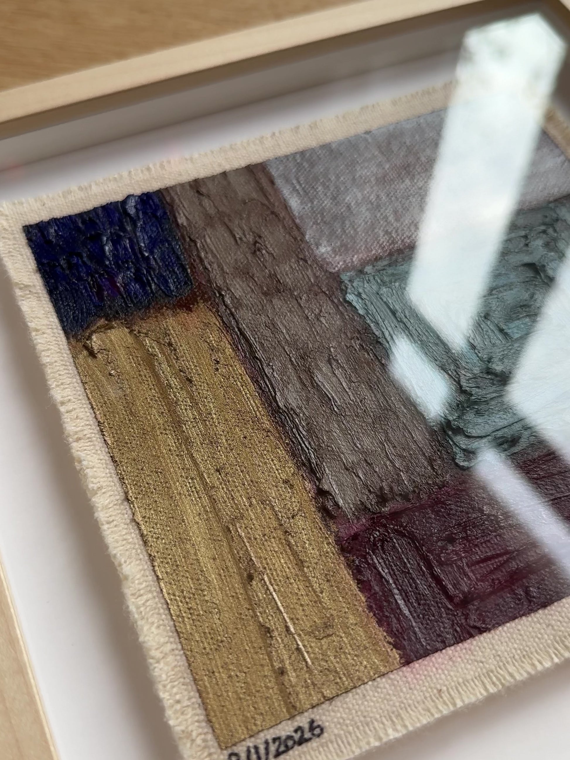 Painted with rich, vibrant oil pastels on raw heavy canvas, each artwork is signed and dated, then professionally framed in a natural maple wood object frame with a floating mount behind white glass. The compact frame includes professional hanging and wall stoppers on the back, and is designed for versatile display on the wall, standing upright on a shelf, or laid flat on a table.