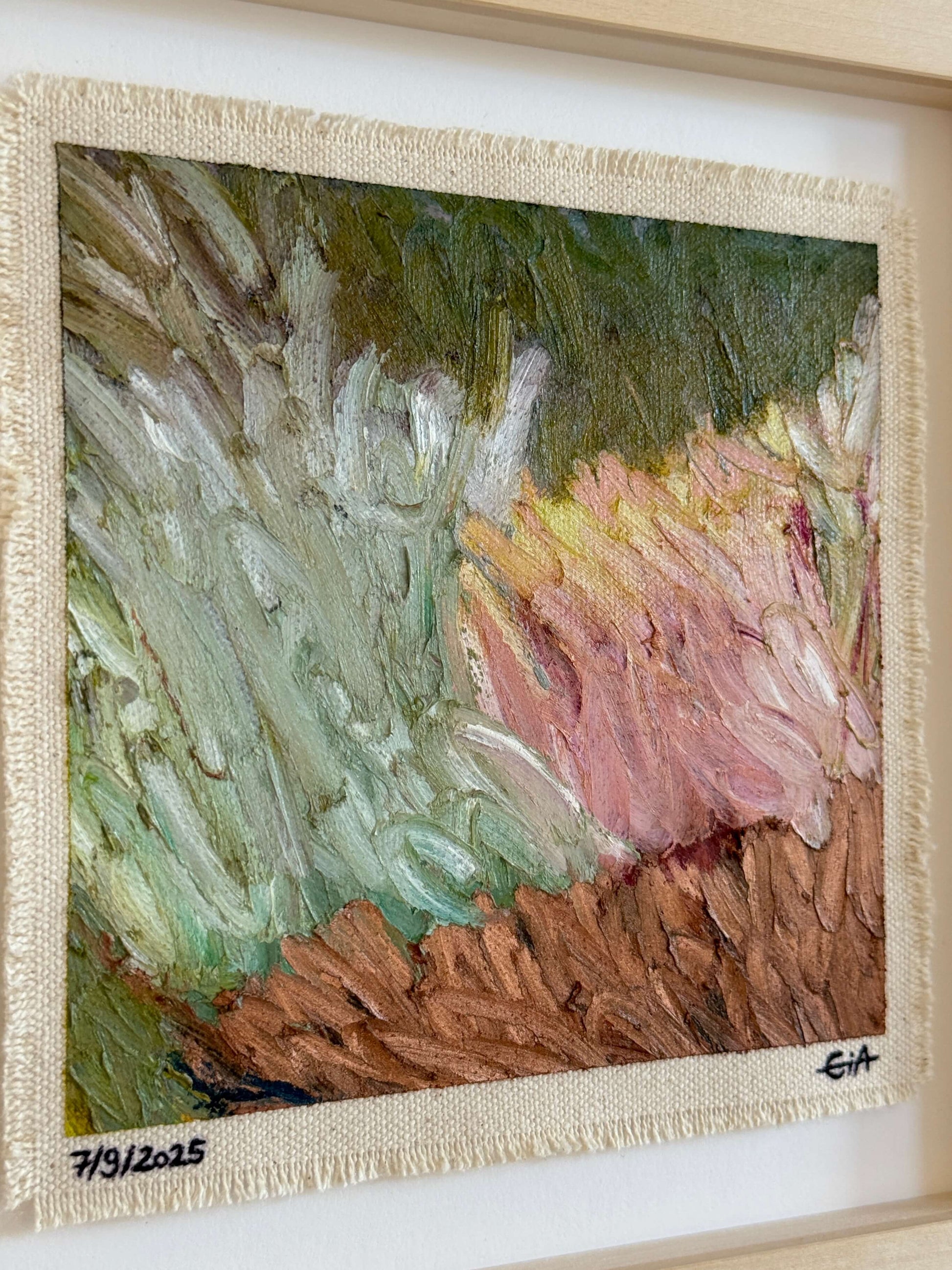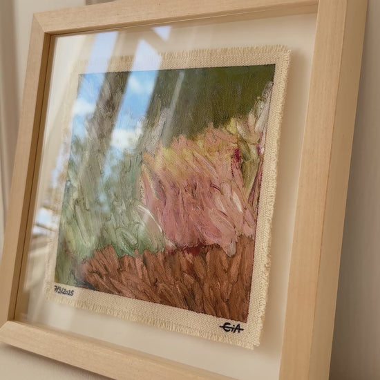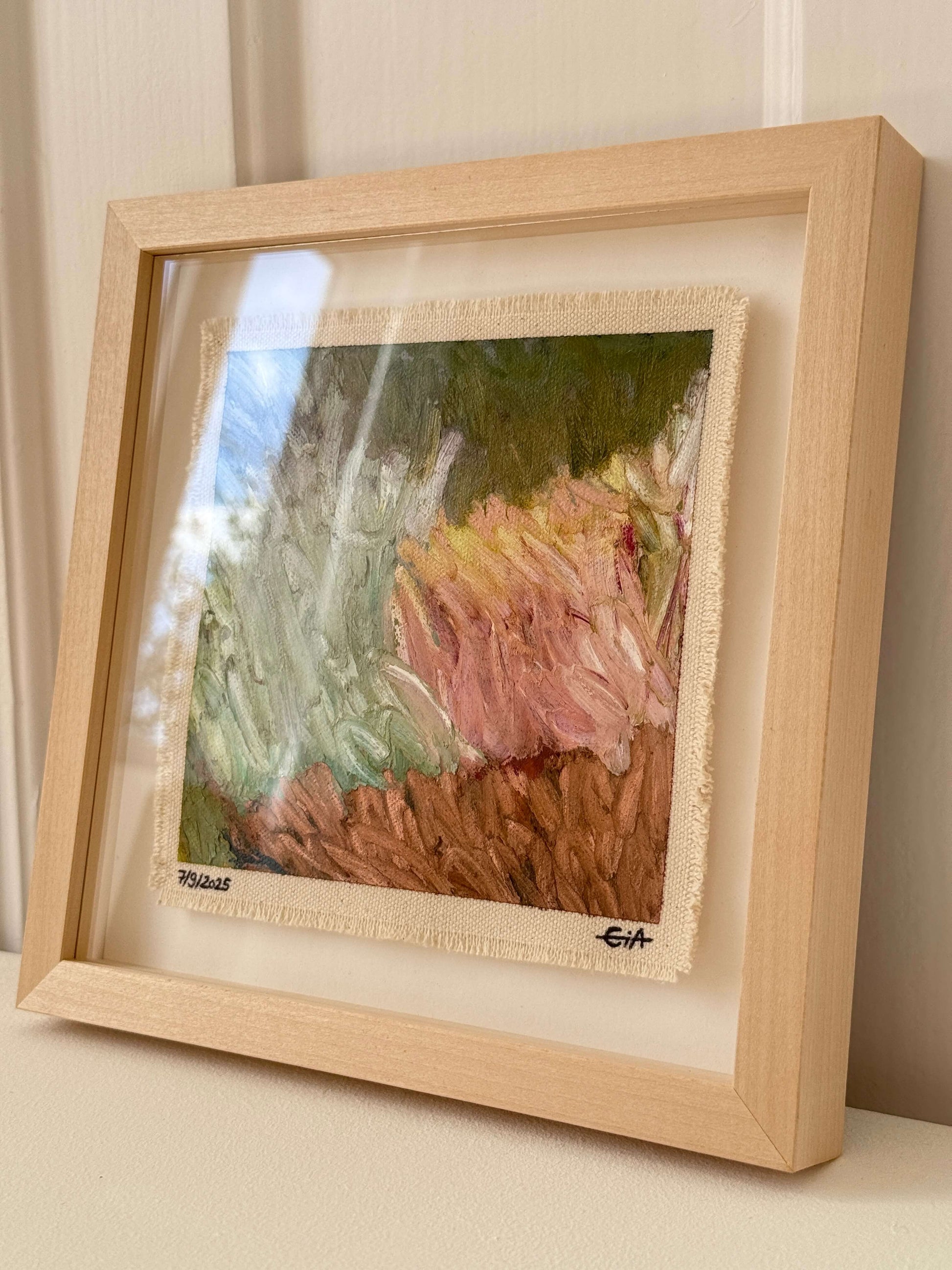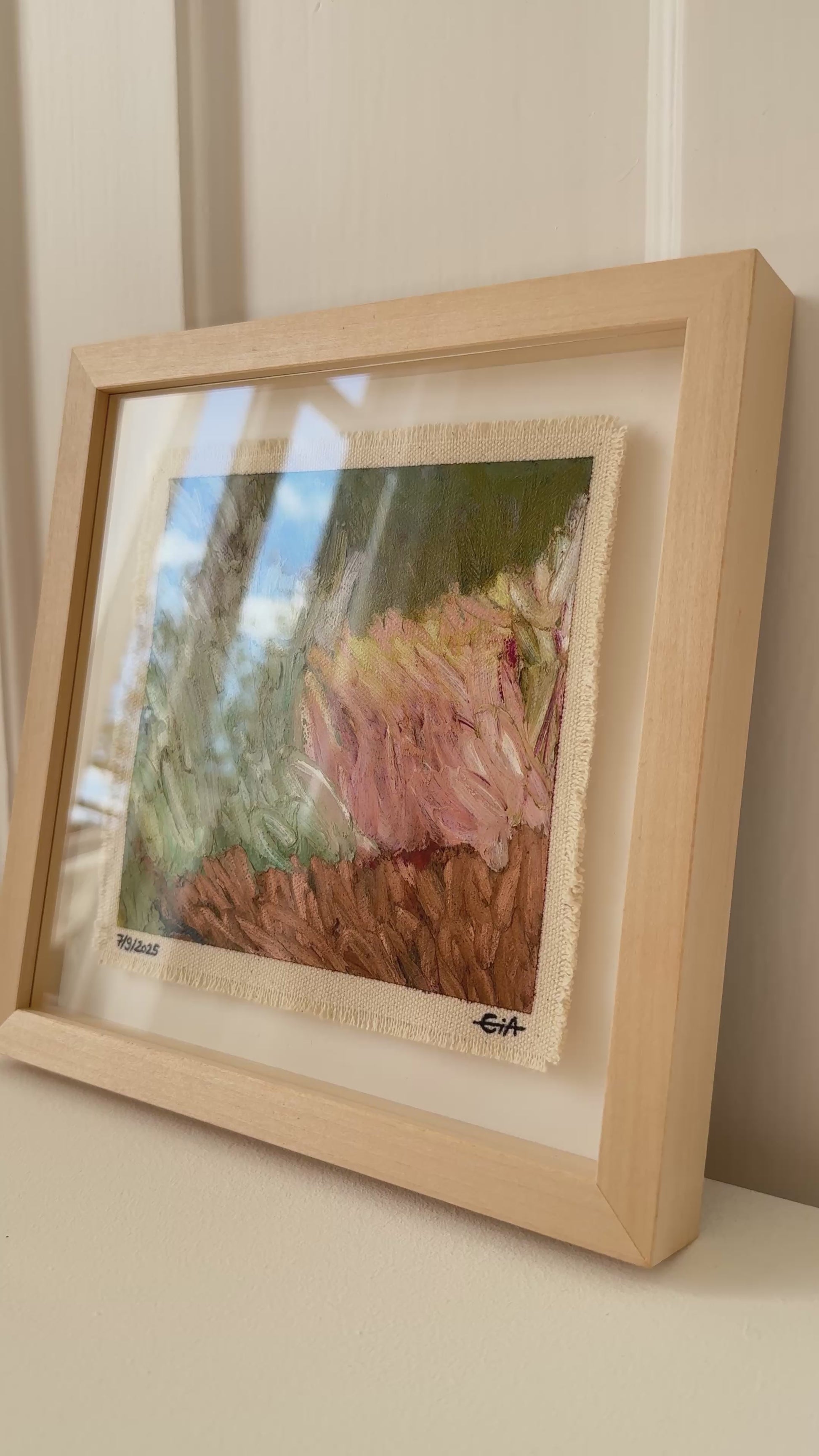 Painted with rich, vibrant oil pastels on raw heavy canvas, each artwork is signed, dated, and professionally framed in a wooden object frame behind glass. The compact frame is designed for versatility, it can be hung on the wall, stood upright on a shelf, or laid flat on a table.