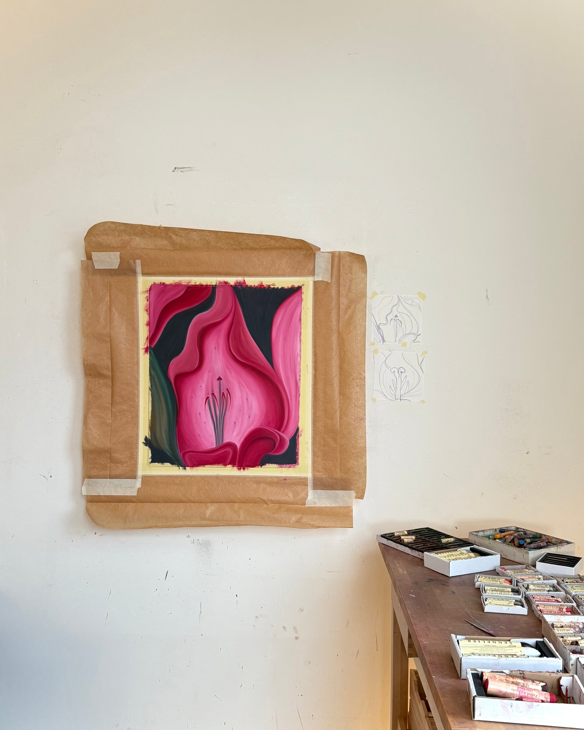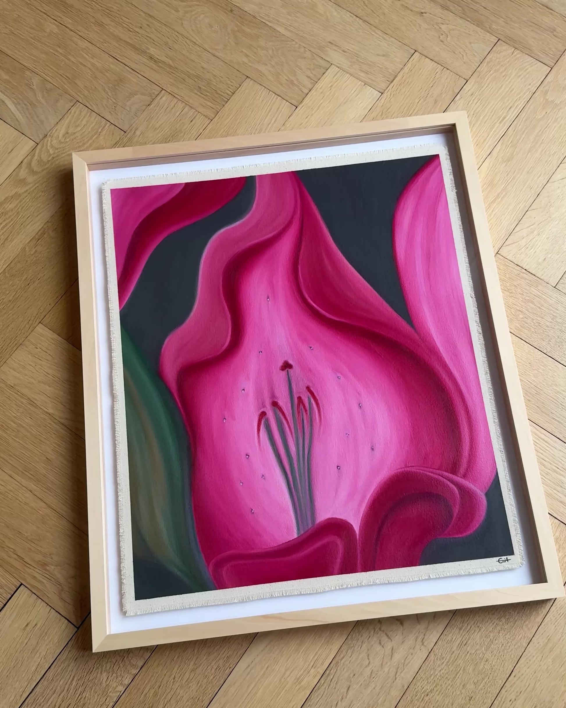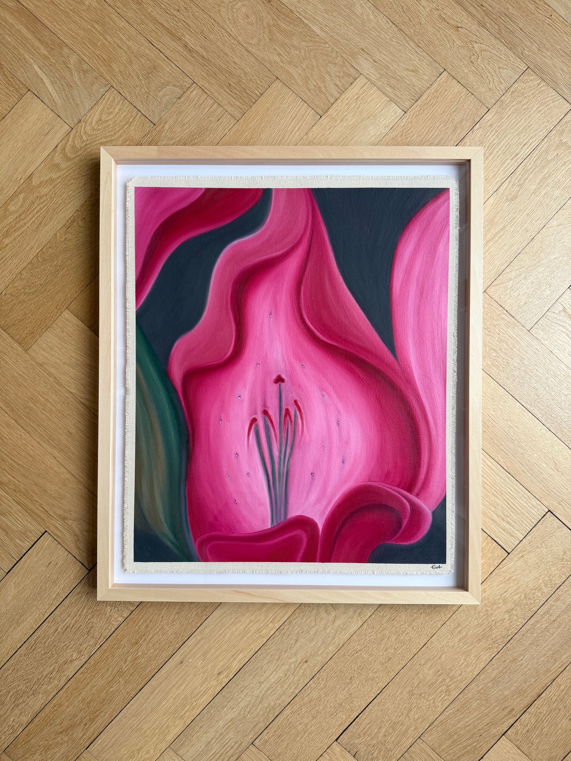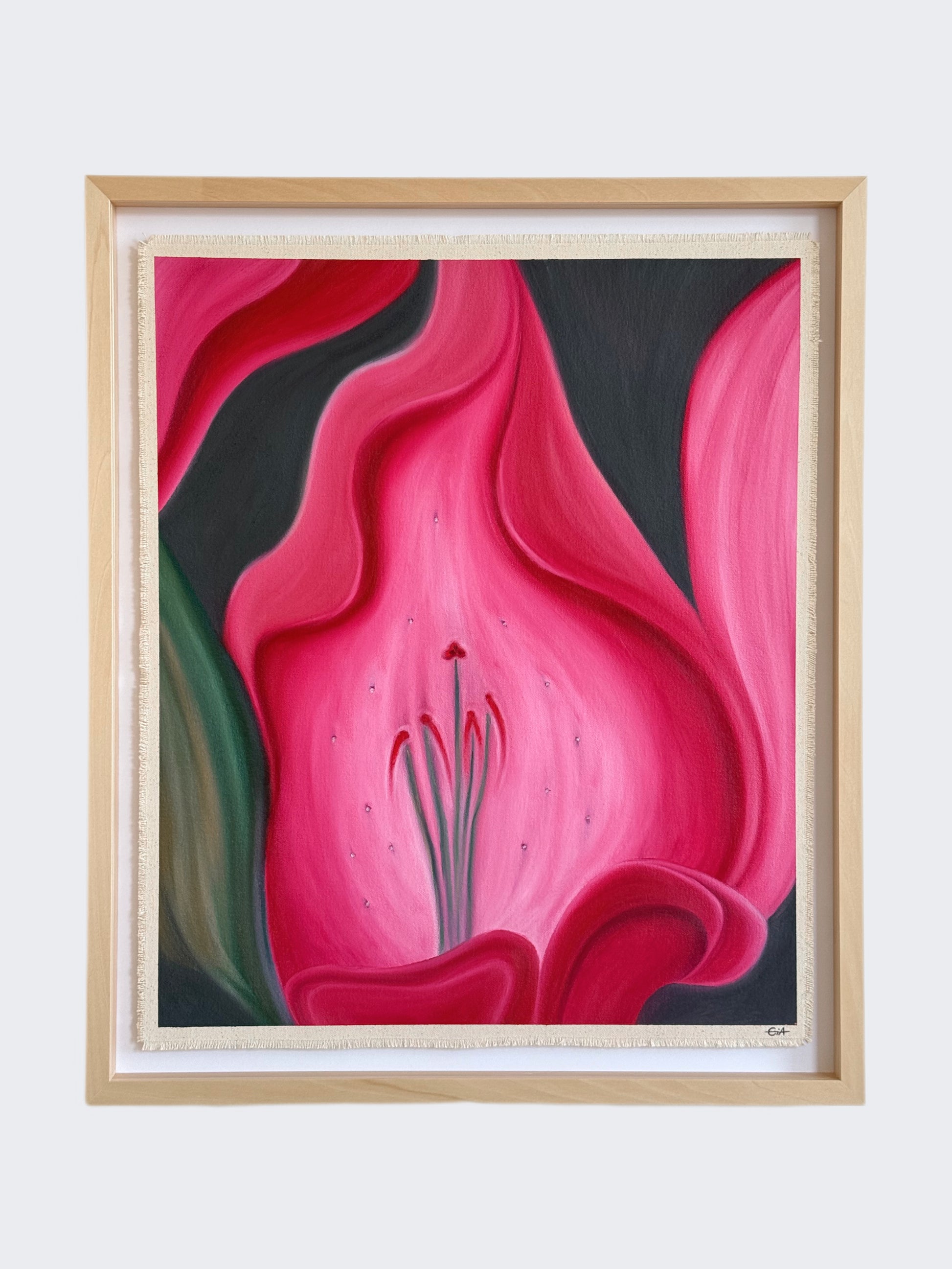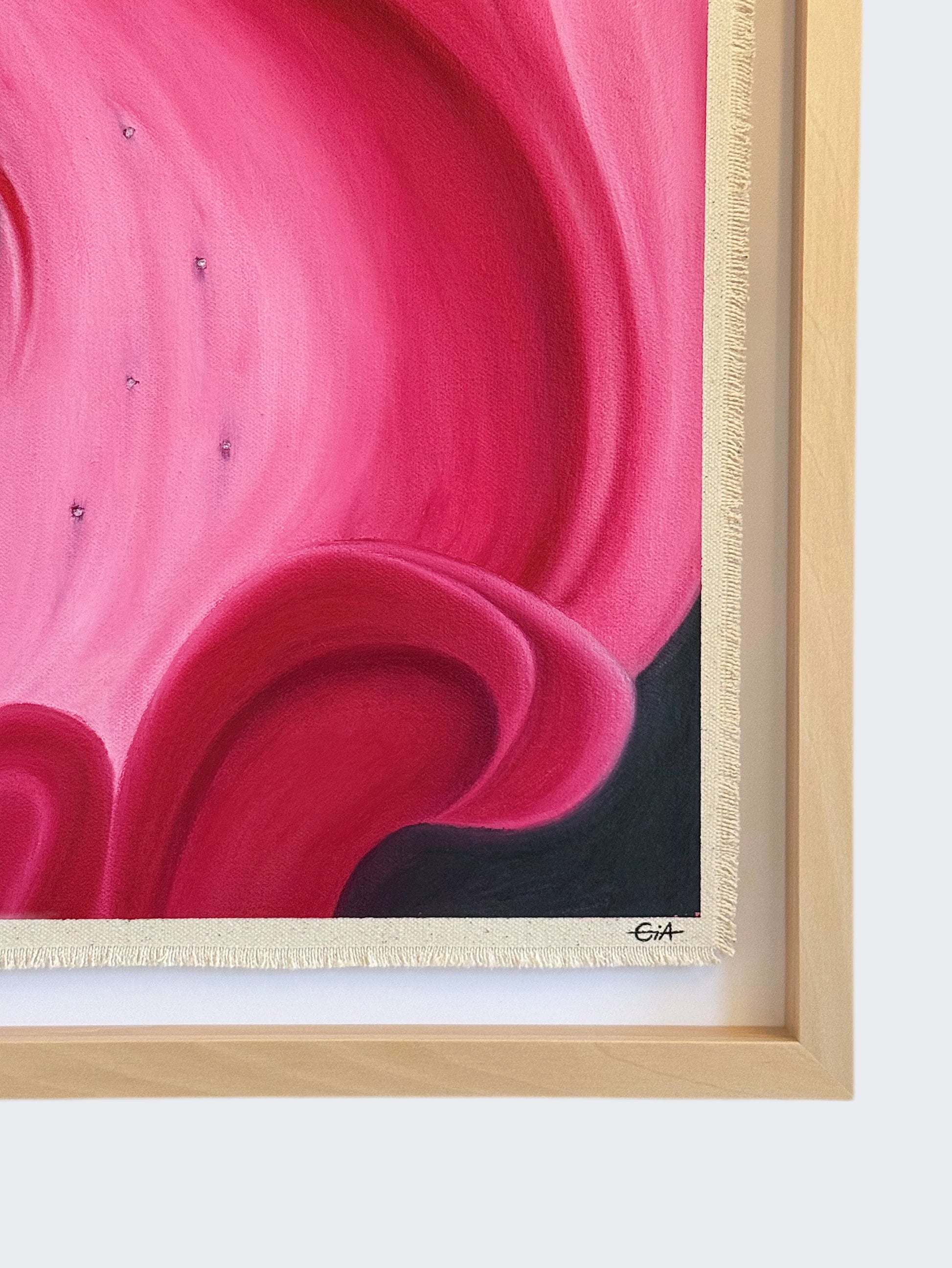 A Dream I Once Had is a vibrant oil pastel piece on canvas, featuring raw edges and presented floating in a wooden object frame behind glass.