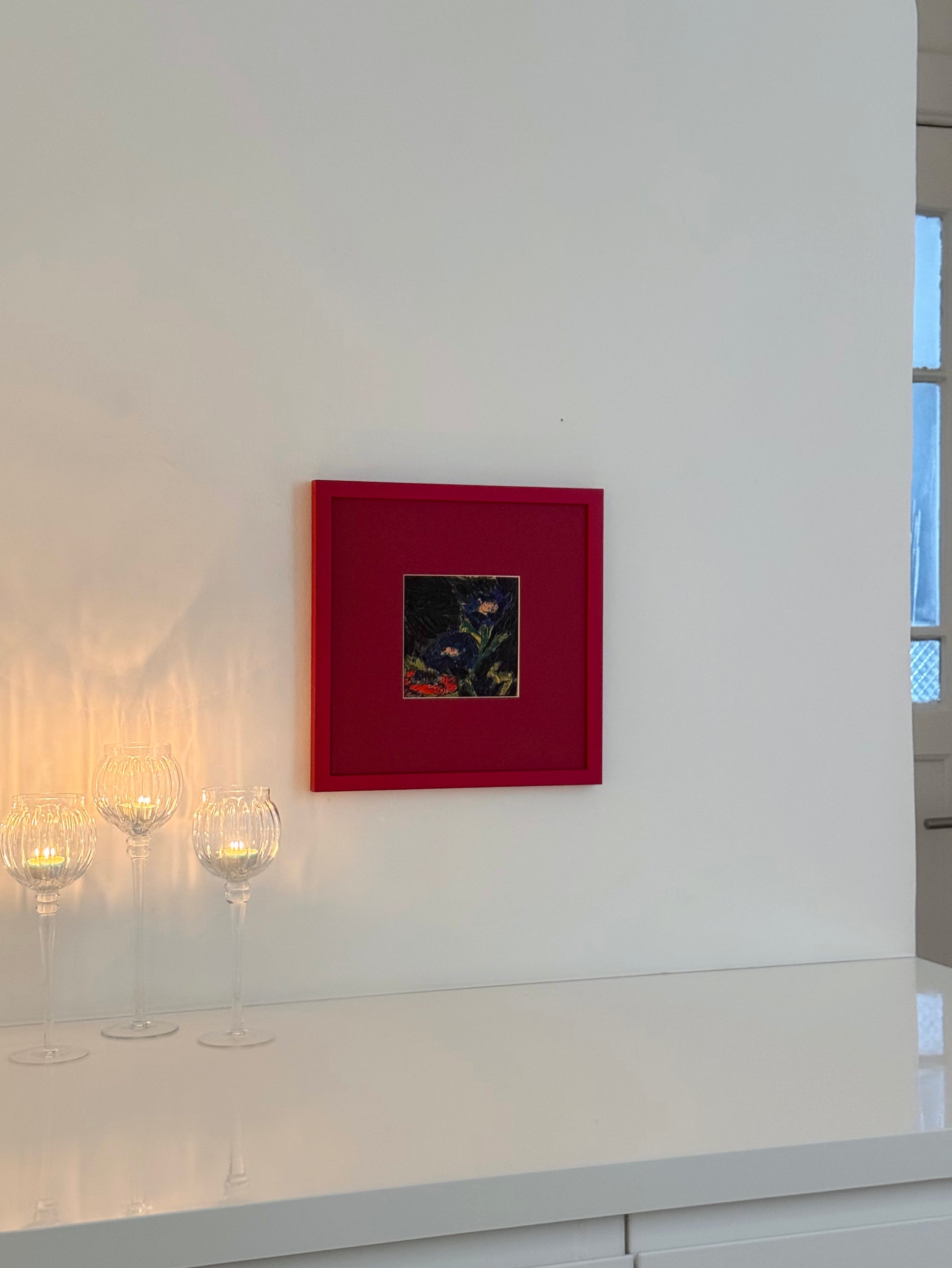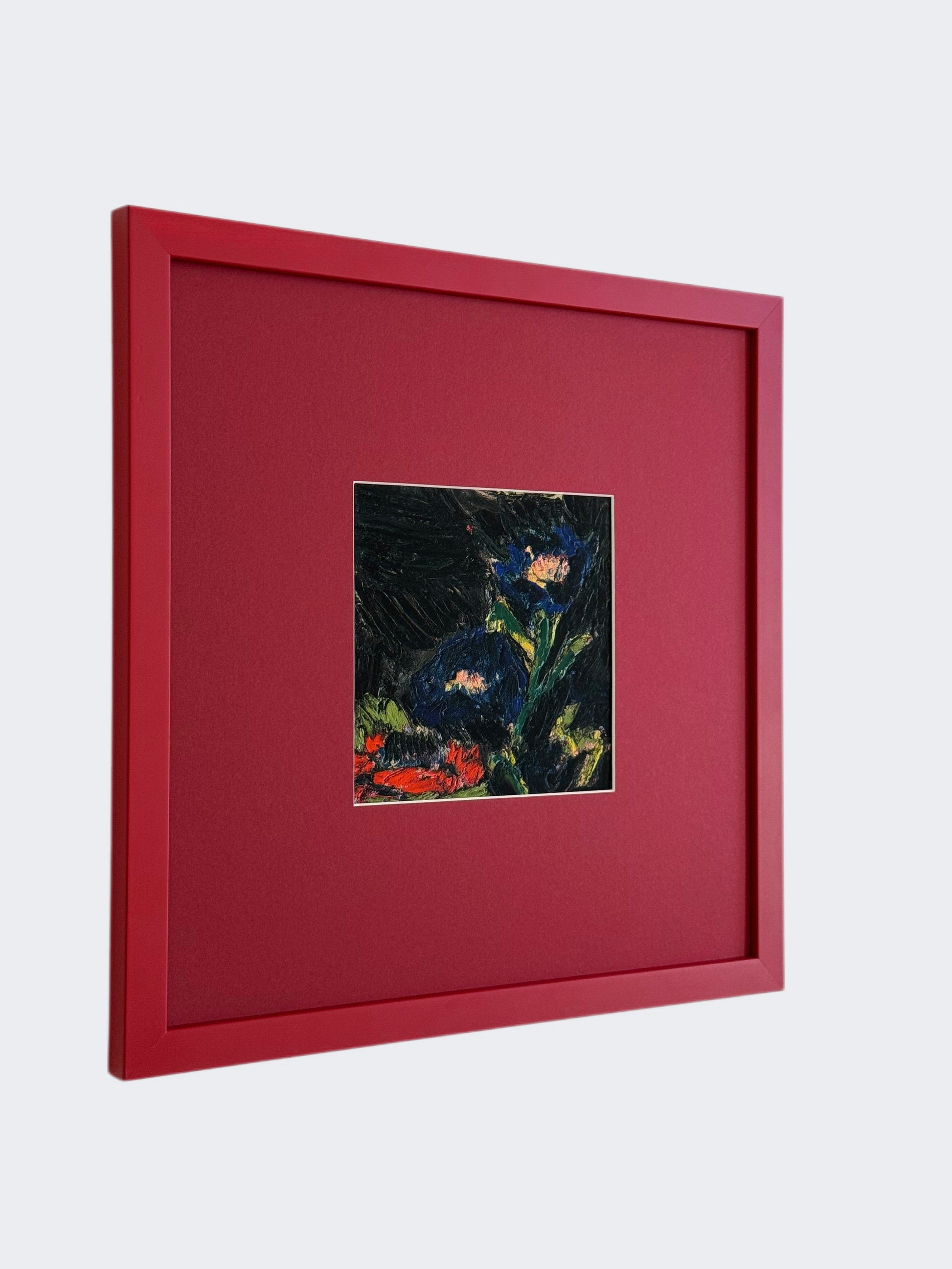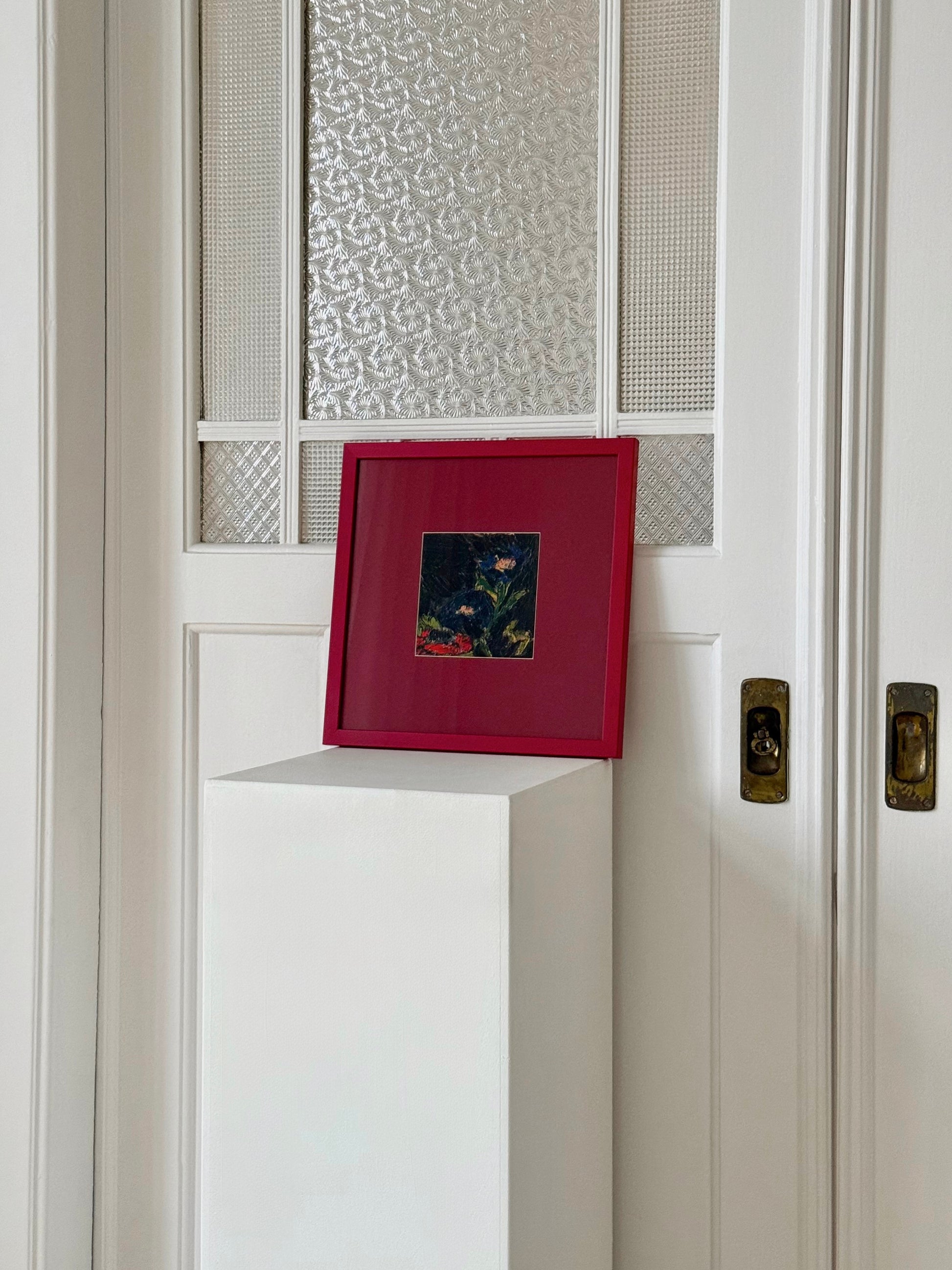 Printed on Hahnemühle fine art paper, each piece comes professionally framed in a deep red wooden frame with a matching mat, behind glass.